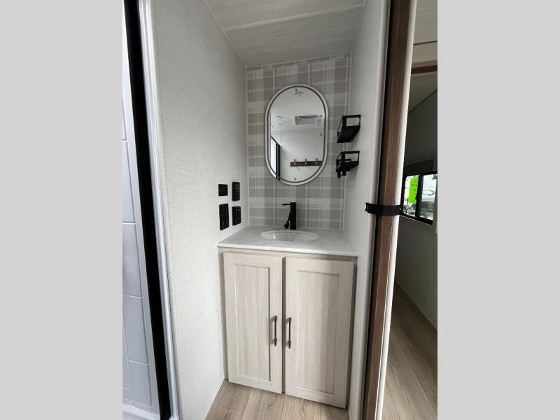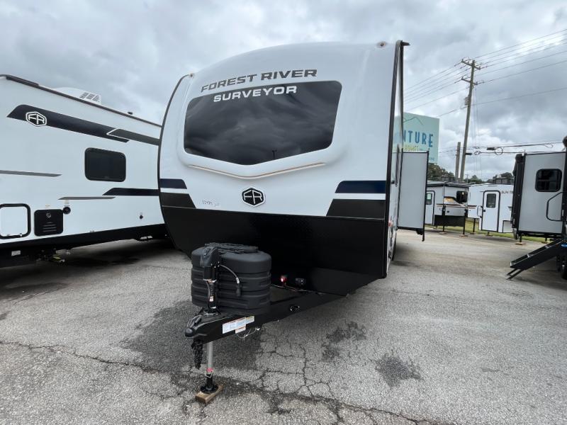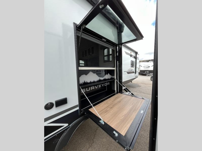 With any Grand Surveyor travel trailer by Forest River you will enjoy turn-key ready-to-go features and quality construction! Each model includes Azdel composite walls and a gel coated fiberglass front cap with an automotive style tinted windshield for a sleek look. There are friction hinge black glass entry door(s), an adjustable platform step with a night light, plus Goodyear tires and a power tongue jack for easy towing. The interior will have you feeling right at home with roller shades, residential faucets, sinks, and bathroom vanity, plus Surf(x) seamless countertops throughout. You can also plan for adventure with a 2" rear accessory and exterior spray port, and there are slam latch exterior baggage doors throughout to keep all your gear secure. Other stand-out features include a central vacuum system, a 200 watt solar panel with a 30 amp controller, a tankless water heater, carpet-free interiors, and the list goes on!