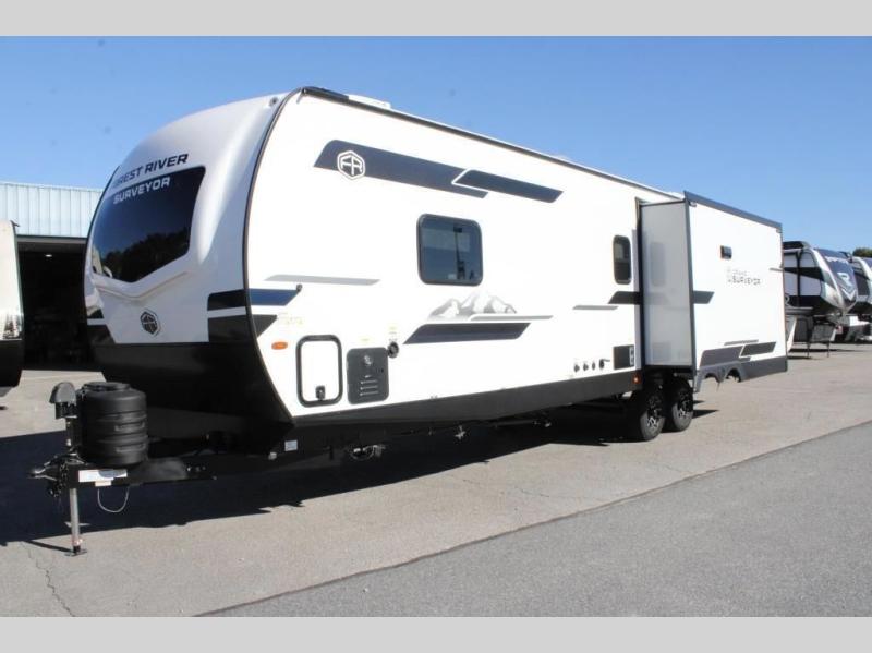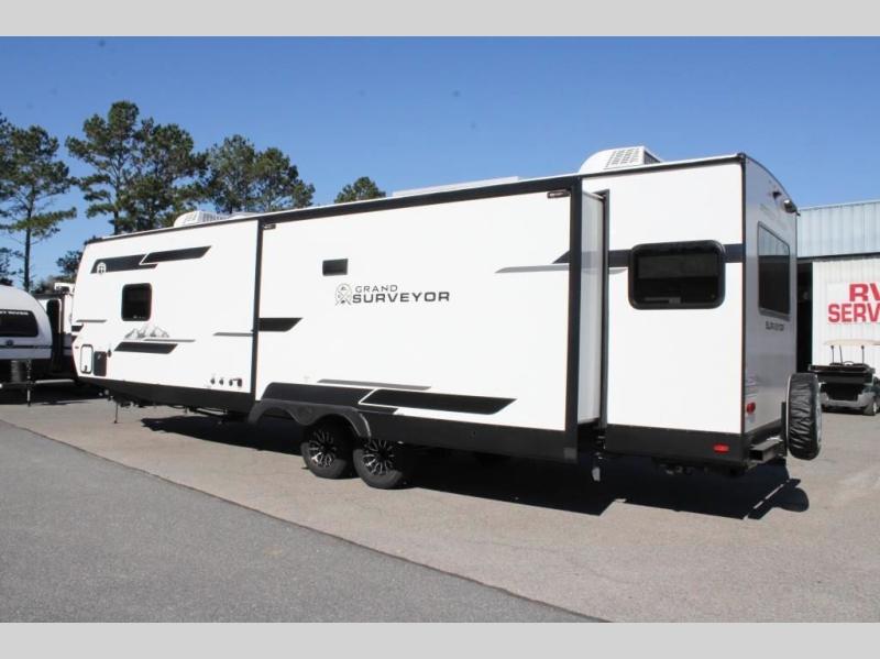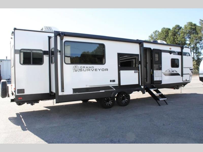 With any Grand Surveyor travel trailer by Forest River you will enjoy turn-key ready-to-go features and quality construction! Each model includes Azdel composite walls and a gel coated fiberglass front cap with an automotive style tinted windshield for a sleek look. There are friction hinge black glass entry door(s), an adjustable platform step with a night light, plus Goodyear tires and a power tongue jack for easy towing. The interior will have you feeling right at home with roller shades, residential faucets, sinks, and bathroom vanity, plus Surf(x) seamless countertops throughout. You can also plan for adventure with a 2" rear accessory and exterior spray port, and there are slam latch exterior baggage doors throughout to keep all your gear secure. Other stand-out features include a central vacuum system, a 200 watt solar panel with a 30 amp controller, a tankless water heater, carpet-free interiors, and the list goes on!
