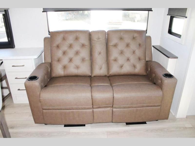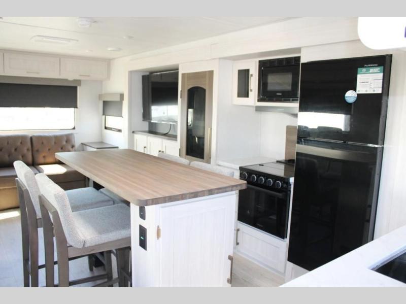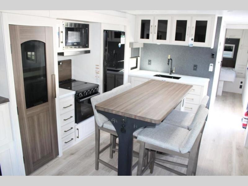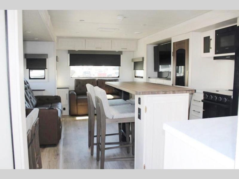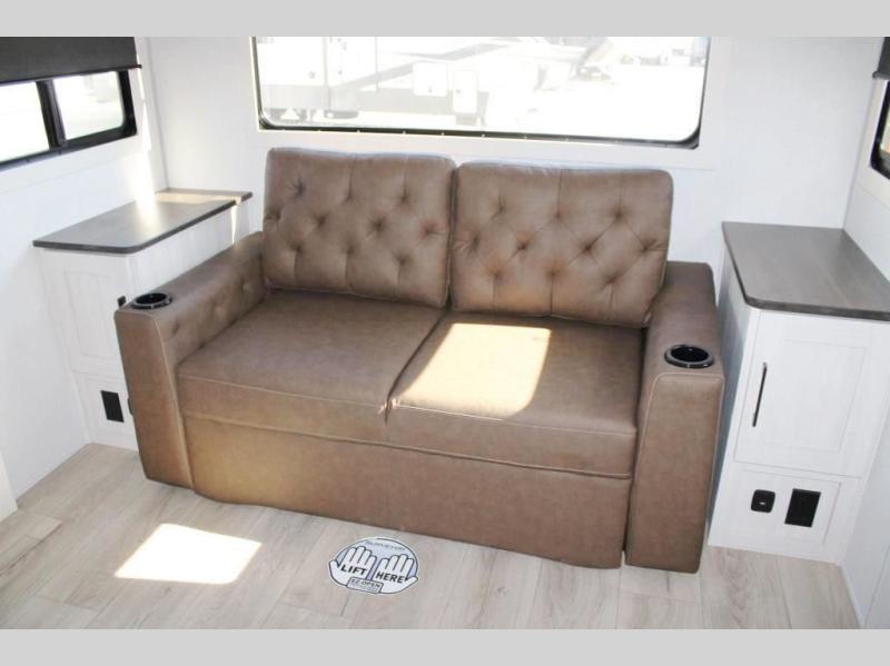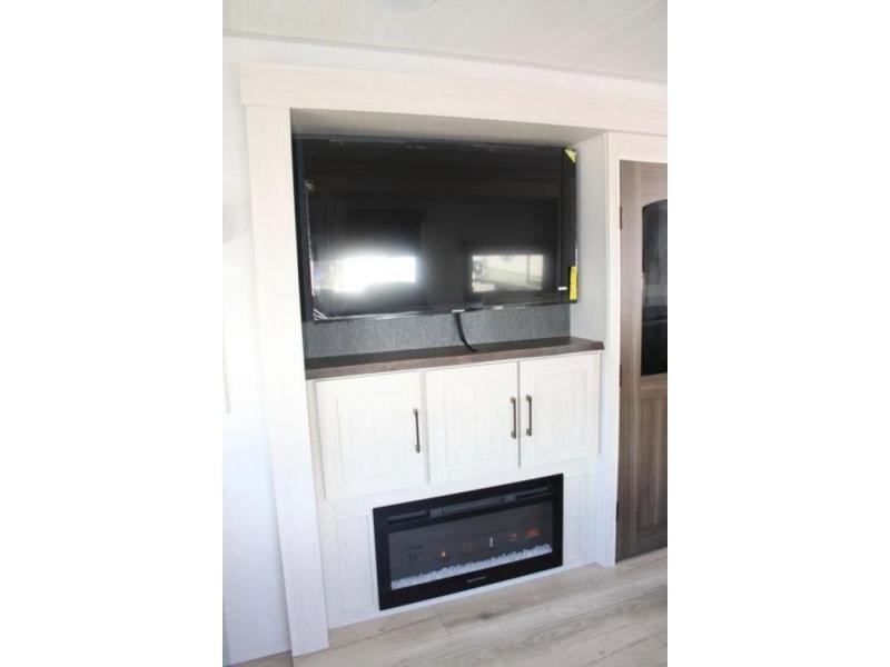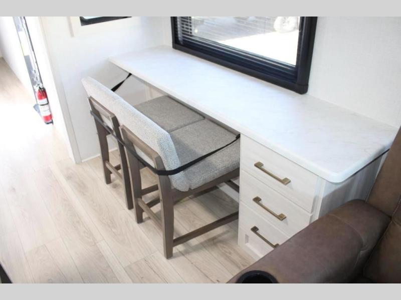 If comfort is what you're looking for, you won't have to search far with this travel trailer! There are dual opposing slides in the main living area for maximum space. The kitchen that flows from the living room area features a high-top dinette that gives a more residential feel to this space, plus there is a pantry, overhead storage, a 10 cu. ft. 12V black glass refrigerator, and more kitchen features you are sure to love. The rear living area includes an EZ-out sofa bed to provide sleeping space for two overnight guests, and there is a theater seat across from the fireplace and HD TV. You'll also enjoy a refreshing drink at the bar top that can also function as a desk! When it's time to call it a night, you can clean up in the spacious full bath, then head to the front bedroom. There is a custom king bed here along with two wardrobes and overhead storage that makes organizing easy!