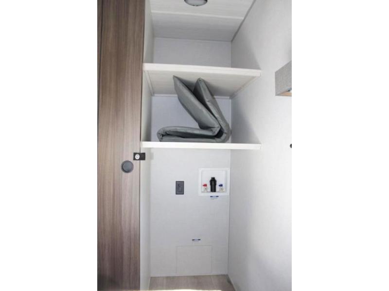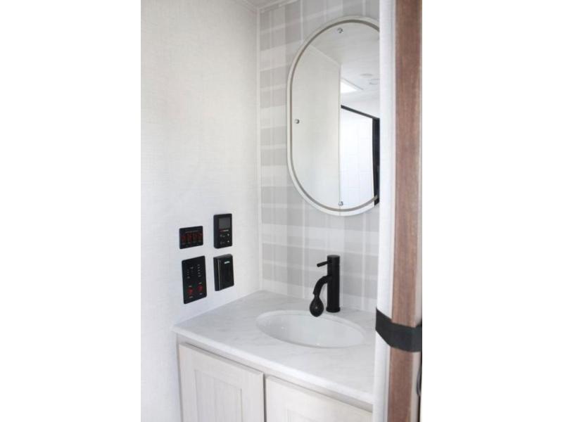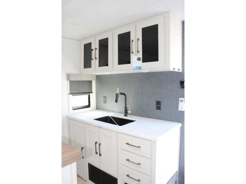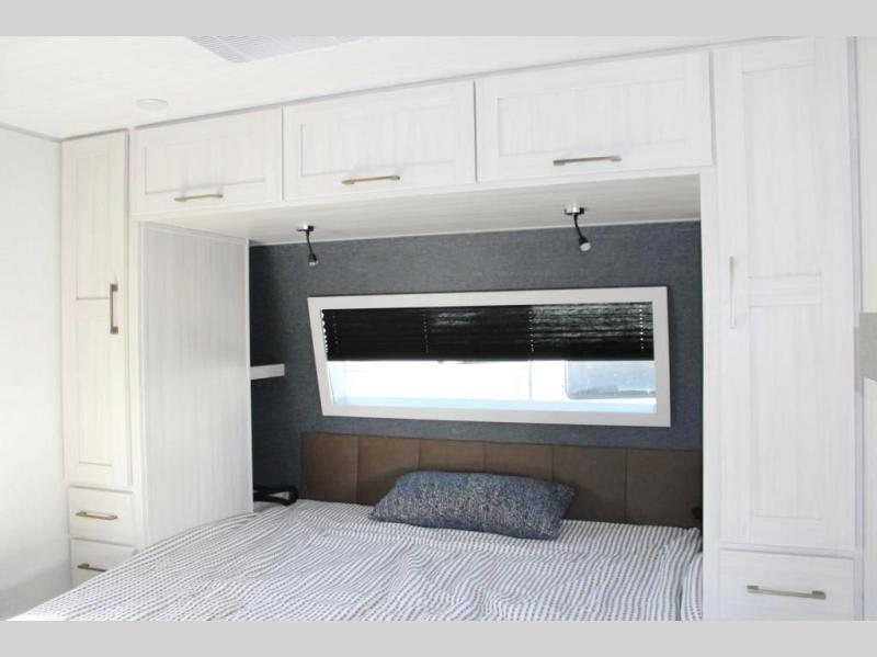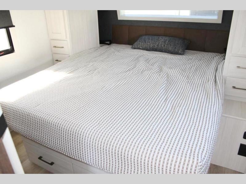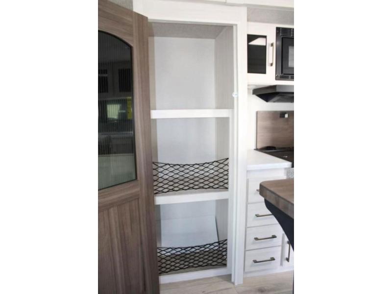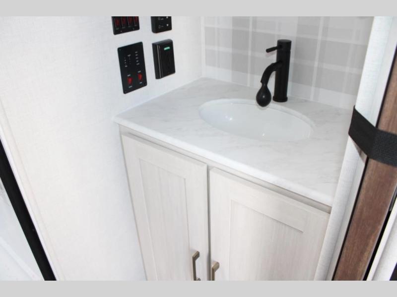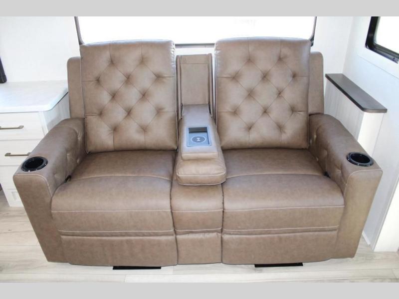 If comfort is what you're looking for, you won't have to search far with this travel trailer! There are dual opposing slides in the main living area for maximum space. The kitchen that flows from the living room area features a high-top dinette that gives a more residential feel to this space, plus there is a pantry, overhead storage, a 10 cu. ft. 12V black glass refrigerator, and more kitchen features you are sure to love. The rear living area includes an EZ-out sofa bed to provide sleeping space for two overnight guests, and there is a theater seat across from the fireplace and HD TV. You'll also enjoy a refreshing drink at the bar top that can also function as a desk! When it's time to call it a night, you can clean up in the spacious full bath, then head to the front bedroom. There is a custom king bed here along with two wardrobes and overhead storage that makes organizing easy!