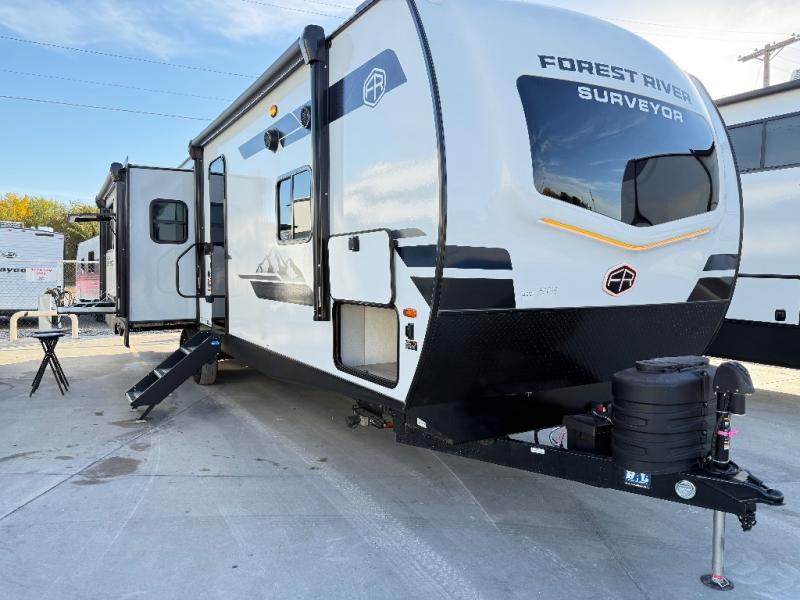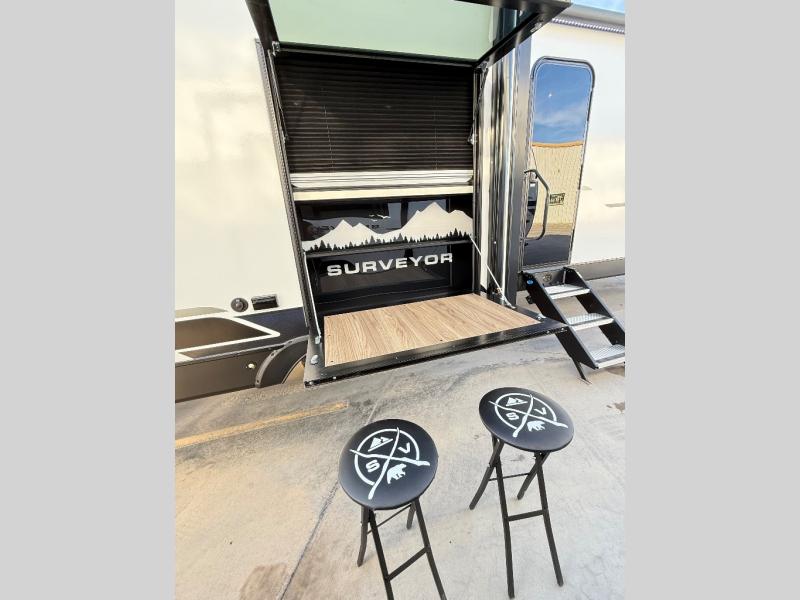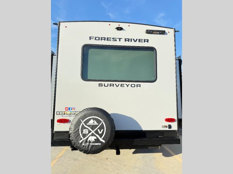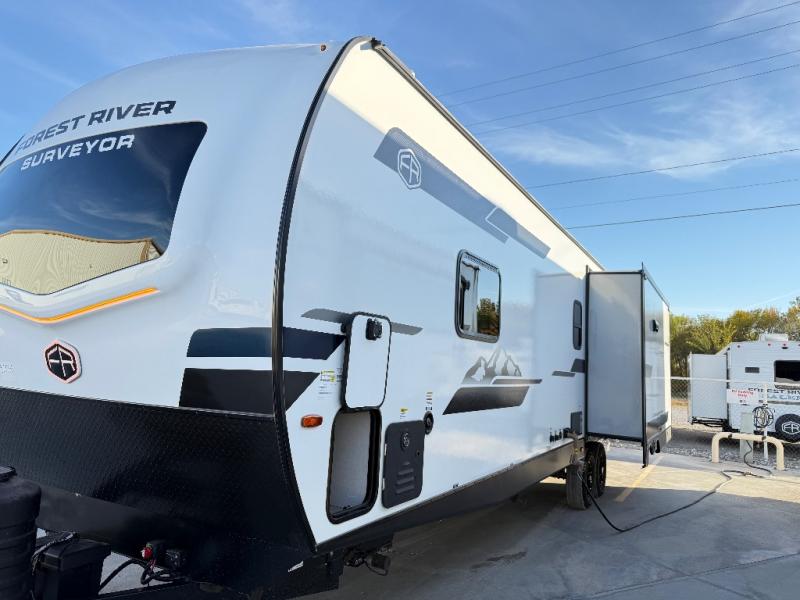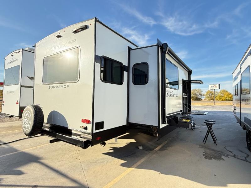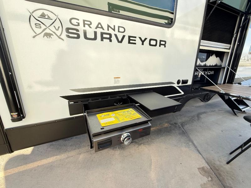 With any Grand Surveyor travel trailer by Forest River you will enjoy turn-key ready-to-go features and quality construction! Each model includes Azdel composite walls and a gel coated fiberglass front cap with an automotive style tinted windshield for a sleek look. There are friction hinge black glass entry door(s), an adjustable platform step with a night light, plus Goodyear tires and a power tongue jack for easy towing. The interior will have you feeling right at home with roller shades, residential faucets, sinks, and bathroom vanity, plus Surf(x) seamless countertops throughout. You can also plan for adventure with a 2" rear accessory and exterior spray port, and there are slam latch exterior baggage doors throughout to keep all your gear secure. Other stand-out features include a central vacuum system, a 200 watt solar panel with a 30 amp controller, a tankless water heater, carpet-free interiors, and the list goes on!