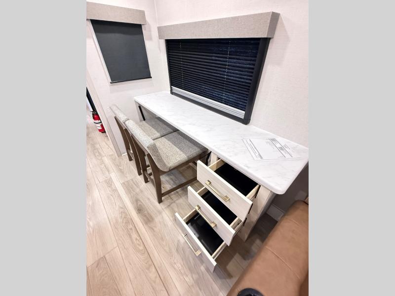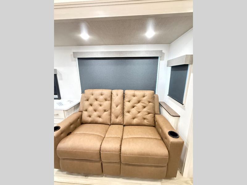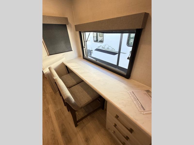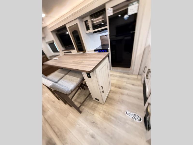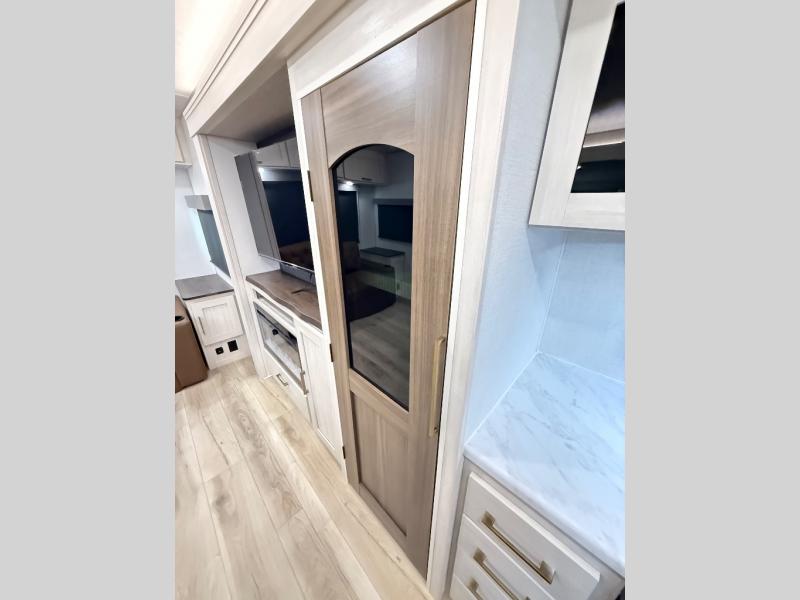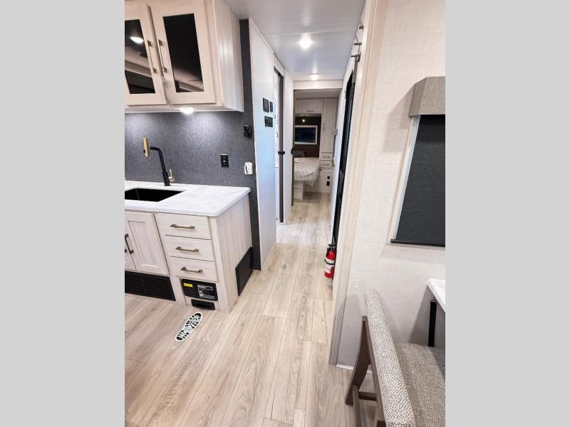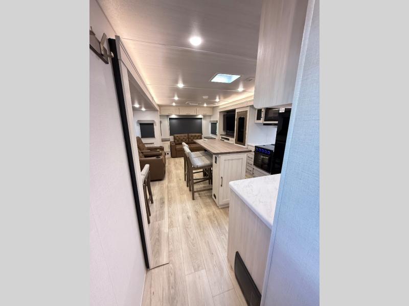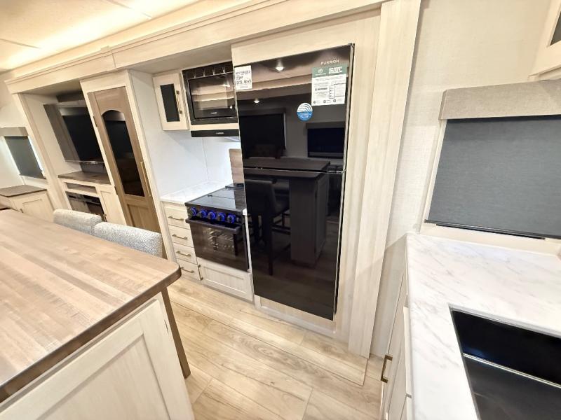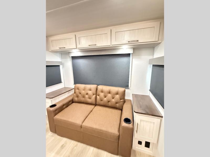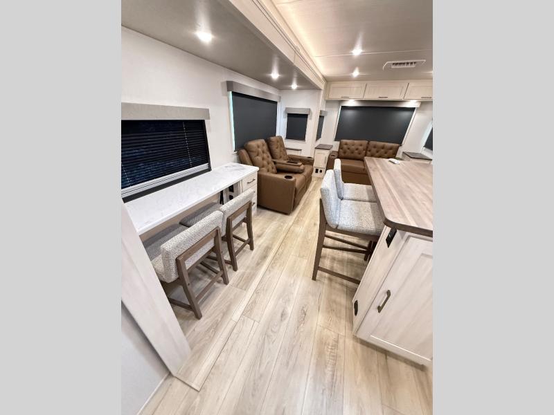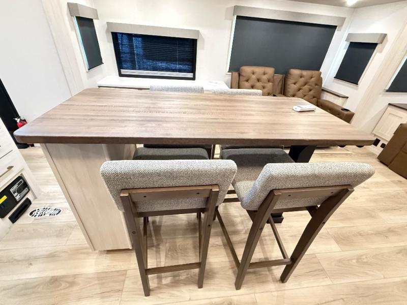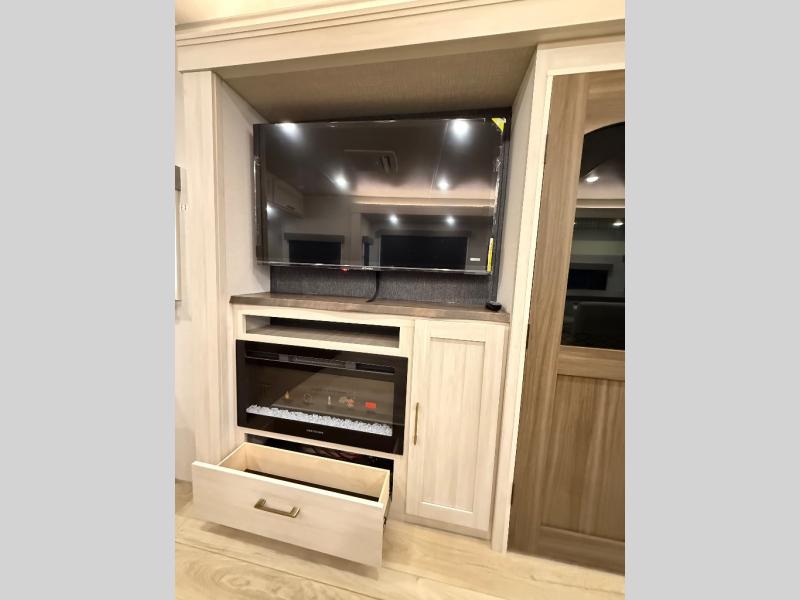 If comfort is what you're looking for, you won't have to search far with this travel trailer! There are dual opposing slides in the main living area for maximum space. The kitchen that flows from the living room area features a high-top dinette that gives a more residential feel to this space, plus there is a pantry, overhead storage, a 10 cu. ft. 12V black glass refrigerator, and more kitchen features you are sure to love. The rear living area includes an EZ-out sofa bed to provide sleeping space for two overnight guests, and there is a theater seat across from the fireplace and HD TV. You'll also enjoy a refreshing drink at the bar top that can also function as a desk! When it's time to call it a night, you can clean up in the spacious full bath, then head to the front bedroom. There is a custom king bed here along with two wardrobes and overhead storage that makes organizing easy!