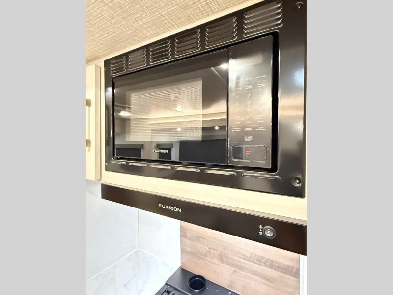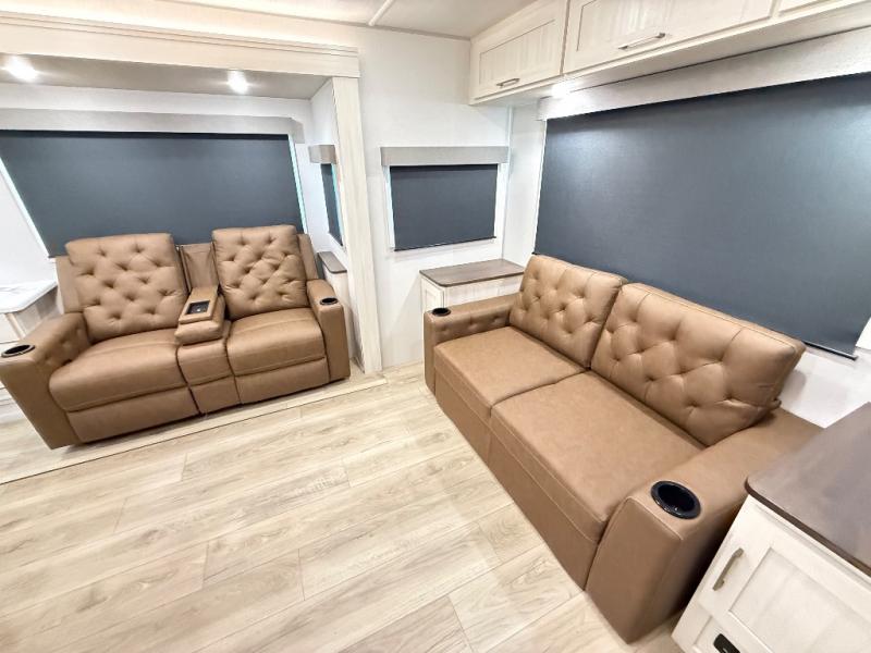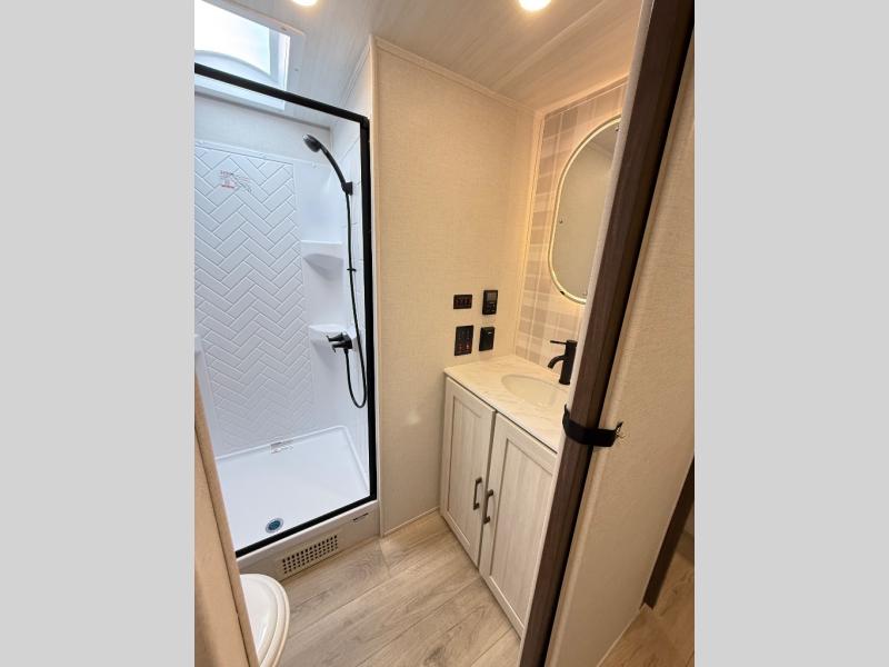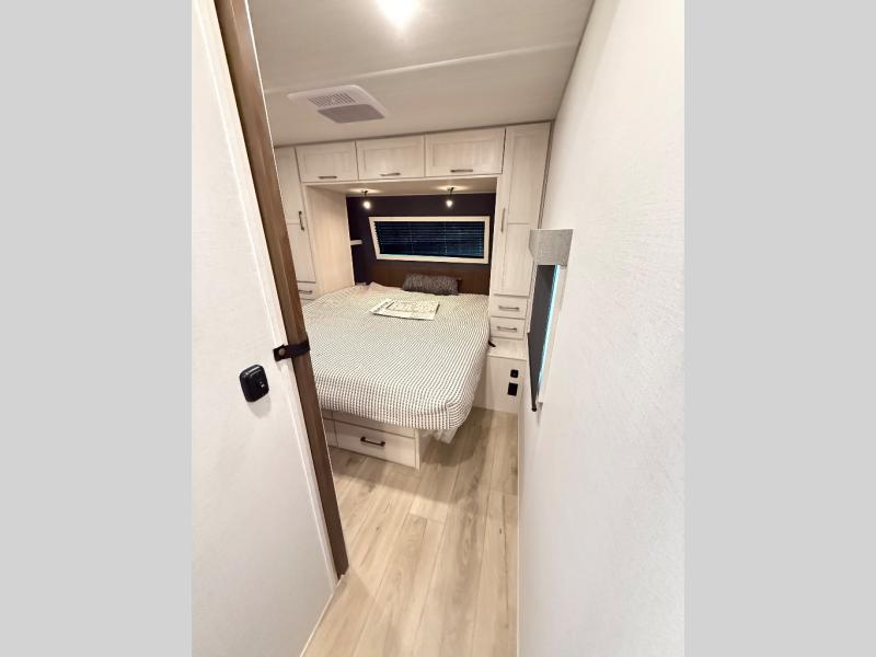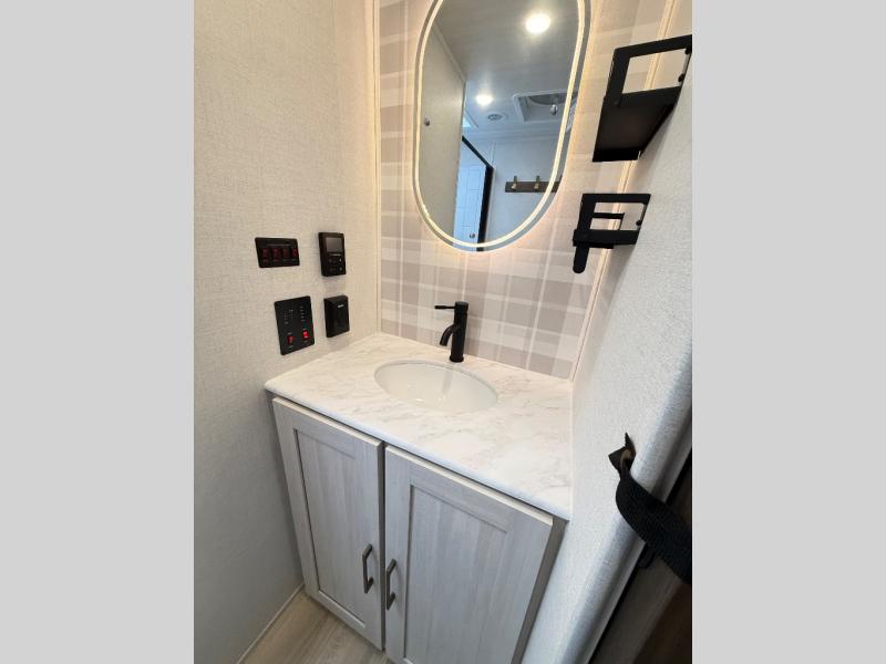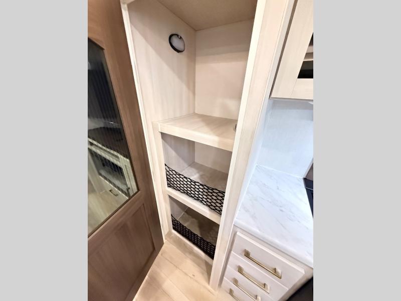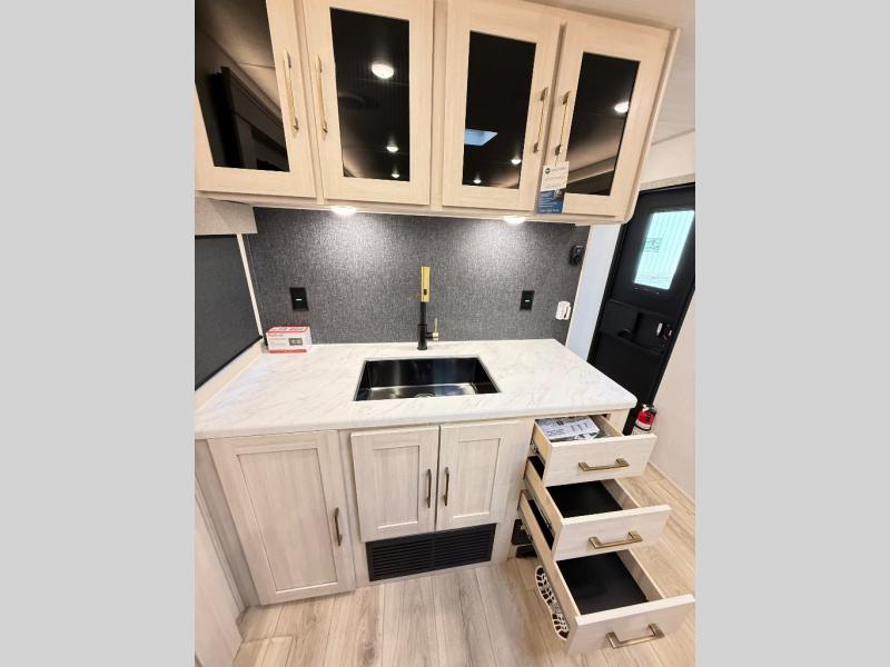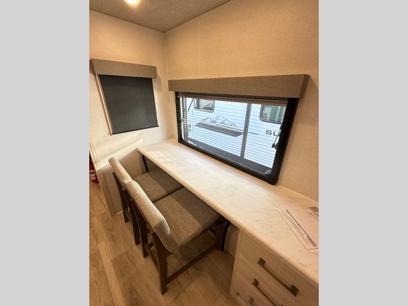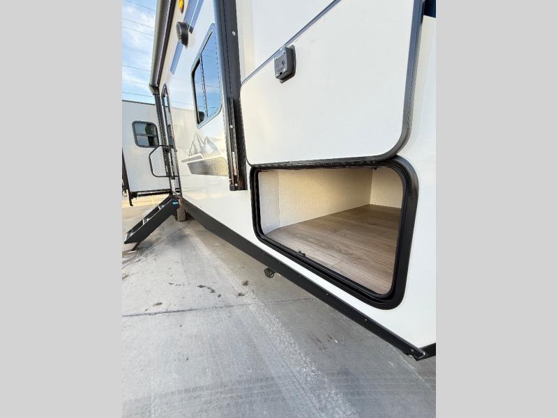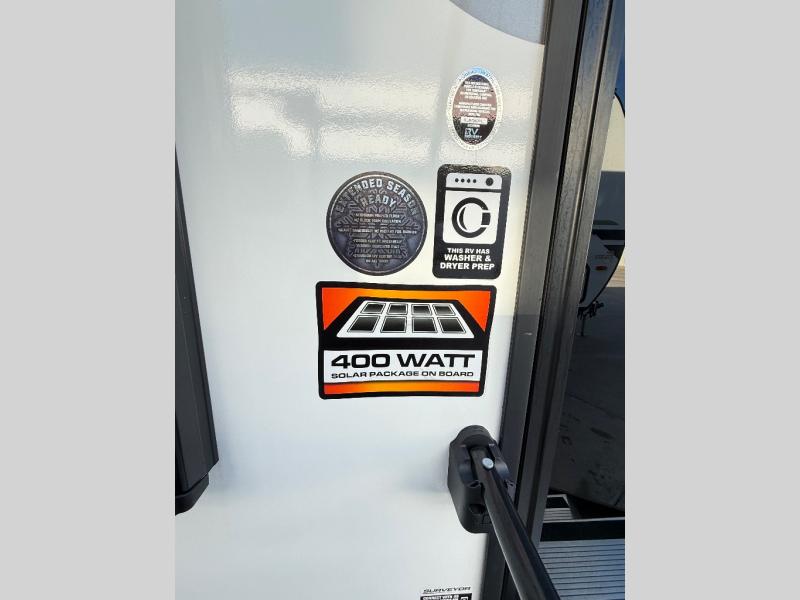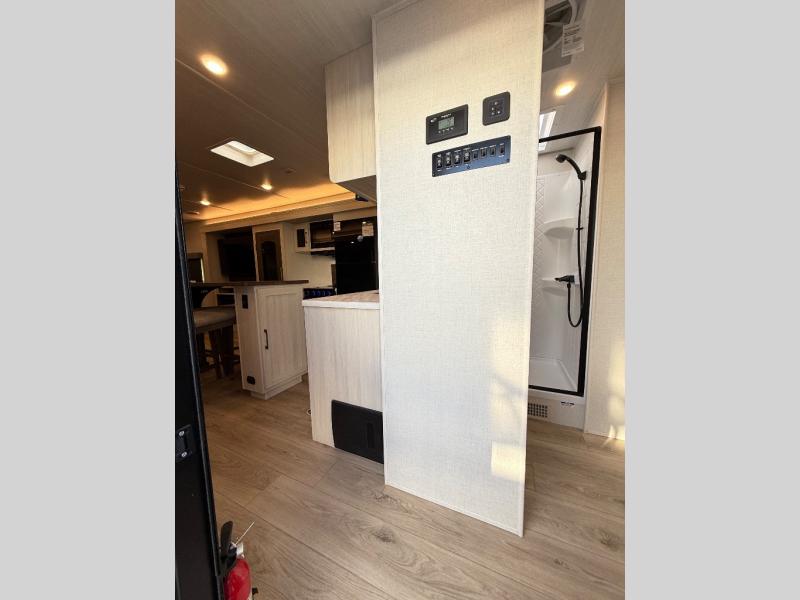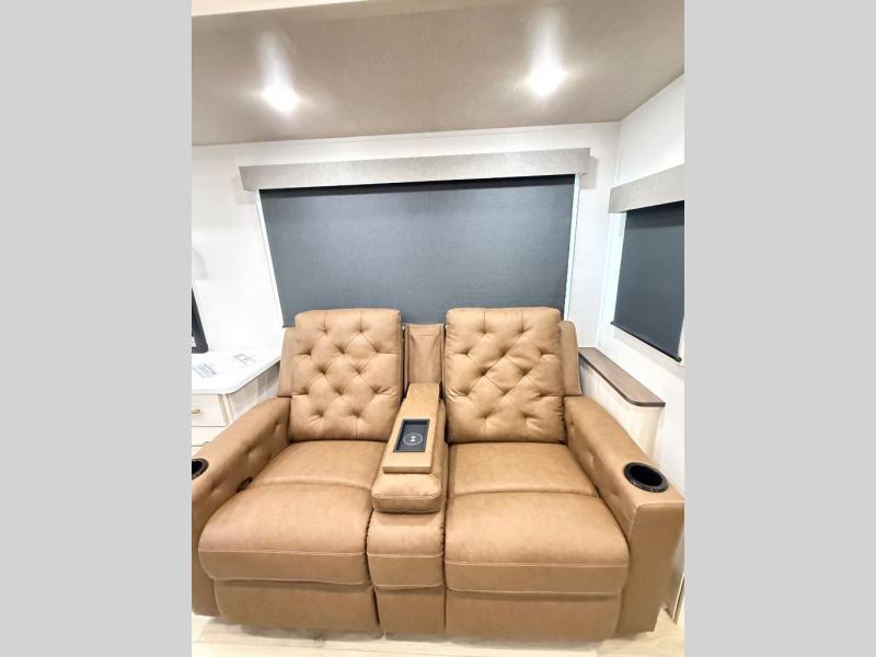 If comfort is what you're looking for, you won't have to search far with this travel trailer! There are dual opposing slides in the main living area for maximum space. The kitchen that flows from the living room area features a high-top dinette that gives a more residential feel to this space, plus there is a pantry, overhead storage, a 10 cu. ft. 12V black glass refrigerator, and more kitchen features you are sure to love. The rear living area includes an EZ-out sofa bed to provide sleeping space for two overnight guests, and there is a theater seat across from the fireplace and HD TV. You'll also enjoy a refreshing drink at the bar top that can also function as a desk! When it's time to call it a night, you can clean up in the spacious full bath, then head to the front bedroom. There is a custom king bed here along with two wardrobes and overhead storage that makes organizing easy!