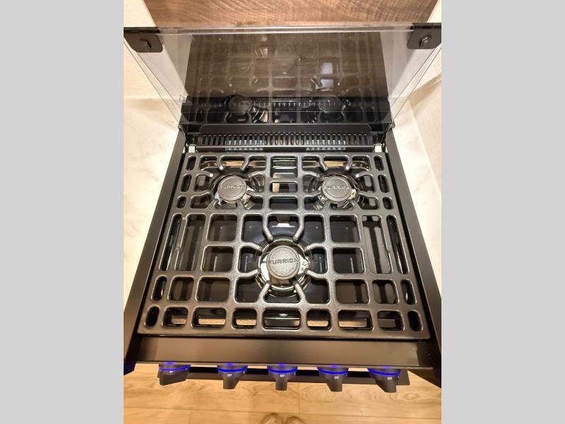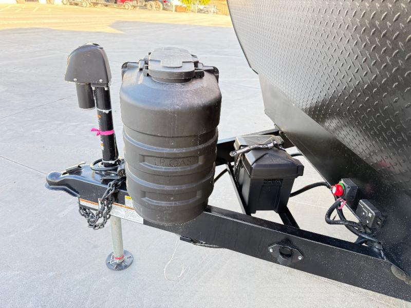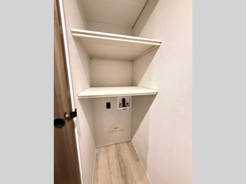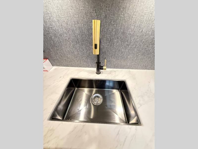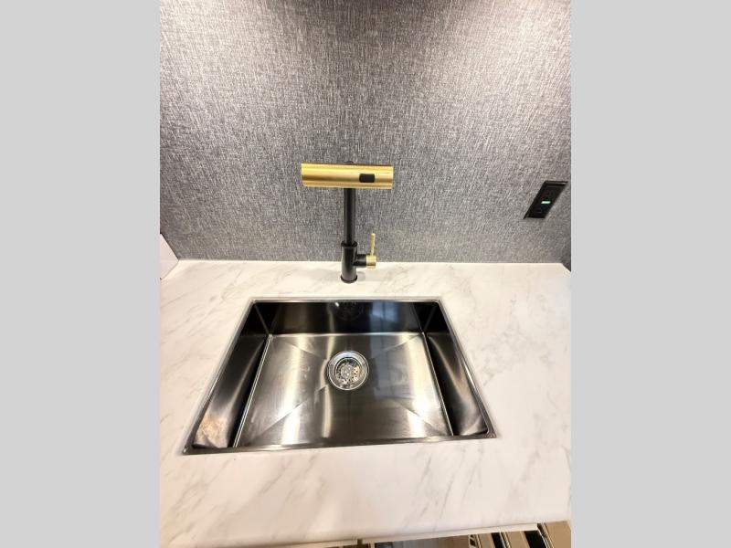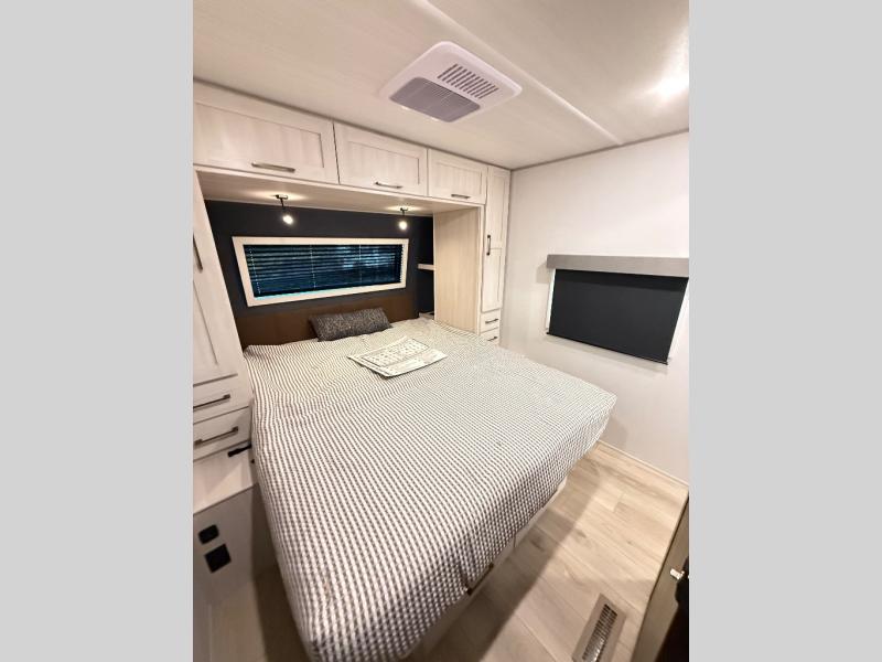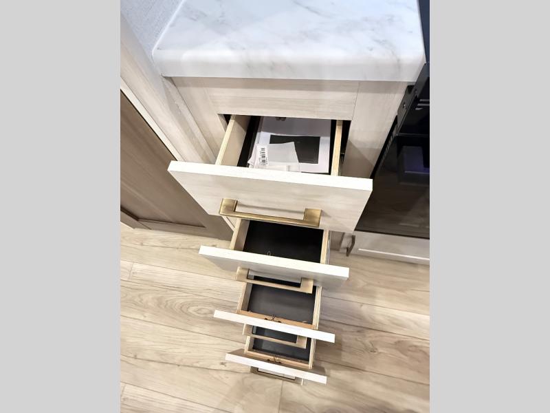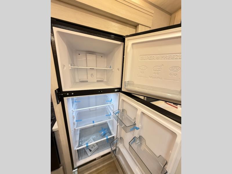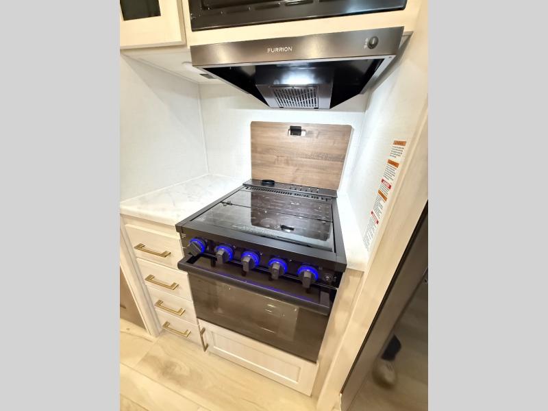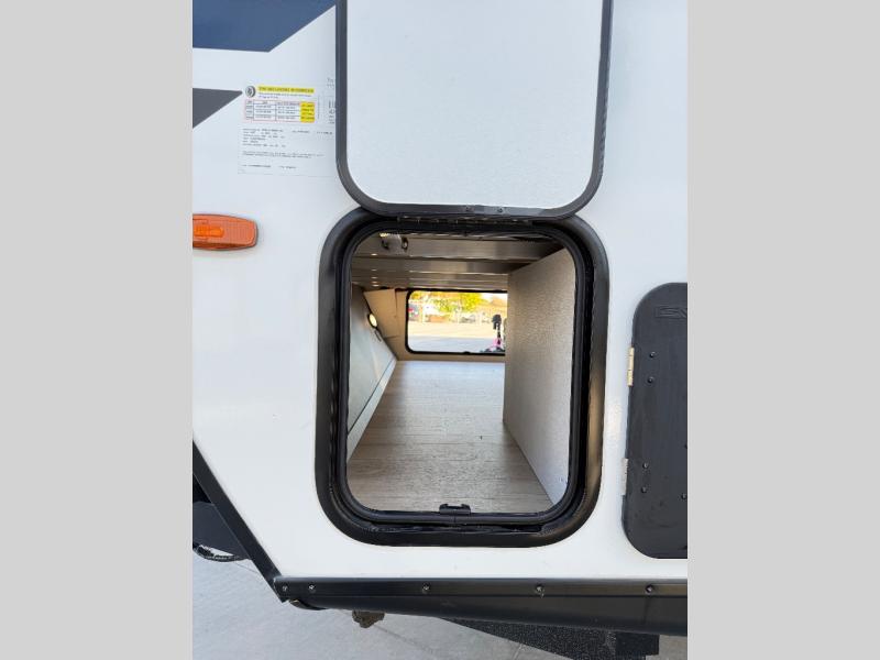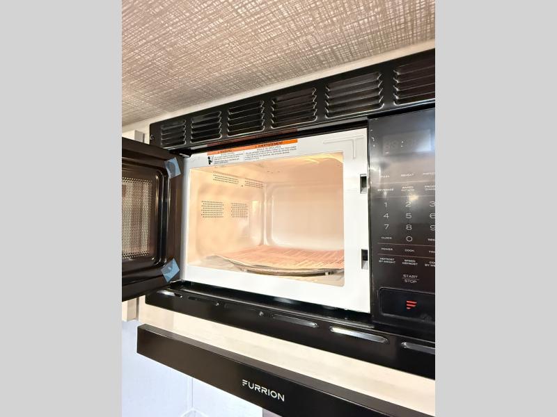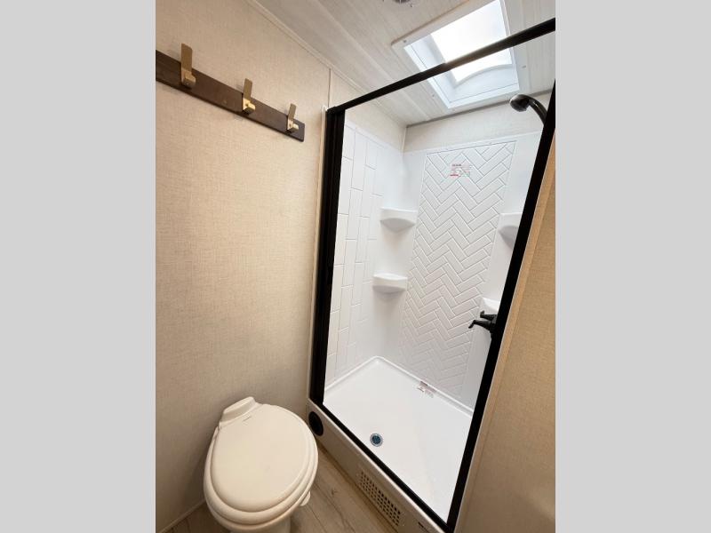 If comfort is what you're looking for, you won't have to search far with this travel trailer! There are dual opposing slides in the main living area for maximum space. The kitchen that flows from the living room area features a high-top dinette that gives a more residential feel to this space, plus there is a pantry, overhead storage, a 10 cu. ft. 12V black glass refrigerator, and more kitchen features you are sure to love. The rear living area includes an EZ-out sofa bed to provide sleeping space for two overnight guests, and there is a theater seat across from the fireplace and HD TV. You'll also enjoy a refreshing drink at the bar top that can also function as a desk! When it's time to call it a night, you can clean up in the spacious full bath, then head to the front bedroom. There is a custom king bed here along with two wardrobes and overhead storage that makes organizing easy!