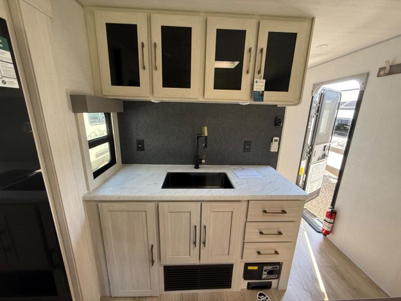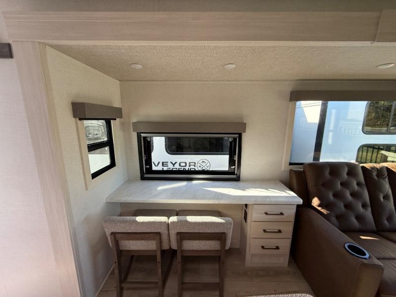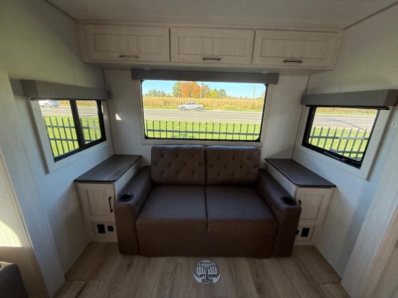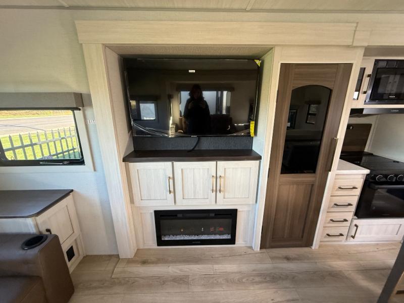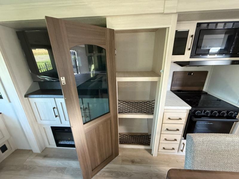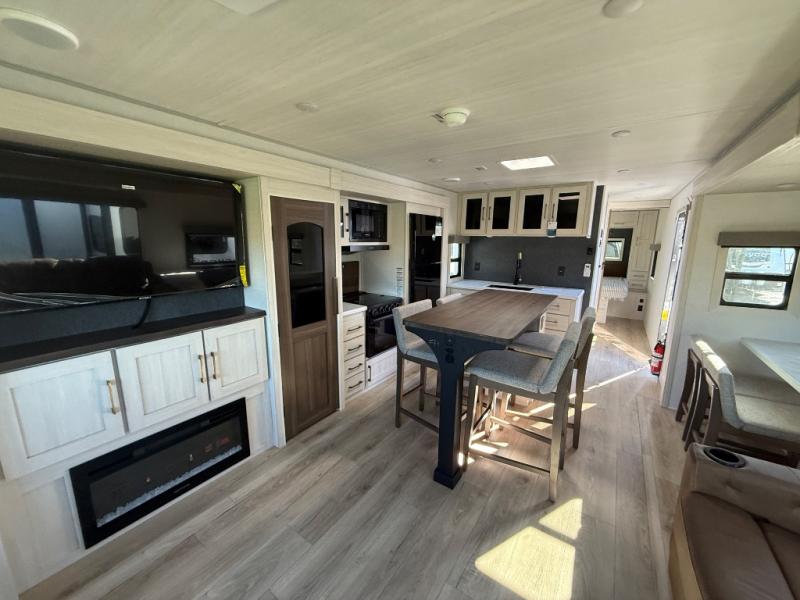 If comfort is what you're looking for, you won't have to search far with this travel trailer! There are dual opposing slides in the main living area for maximum space. The kitchen that flows from the living room area features a high-top dinette that gives a more residential feel to this space, plus there is a pantry, overhead storage, a 10 cu. ft. 12V black glass refrigerator, and more kitchen features you are sure to love. The rear living area includes an EZ-out sofa bed to provide sleeping space for two overnight guests, and there is a theater seat across from the fireplace and HD TV. You'll also enjoy a refreshing drink at the bar top that can also function as a desk! When it's time to call it a night, you can clean up in the spacious full bath, then head to the front bedroom. There is a custom king bed here along with two wardrobes and overhead storage that makes organizing easy!