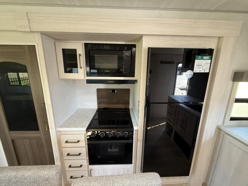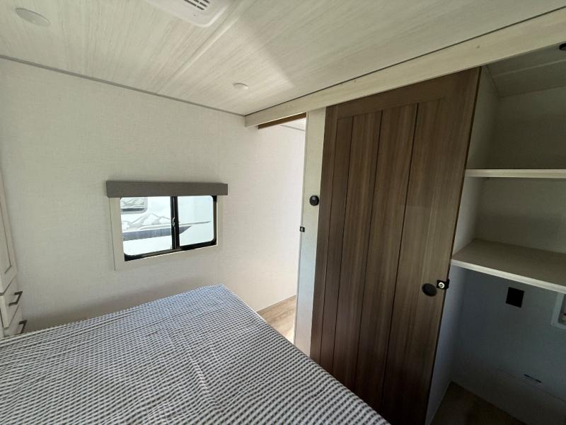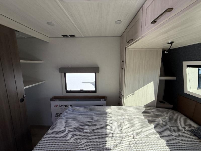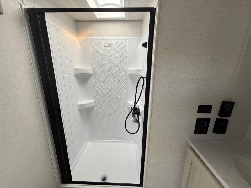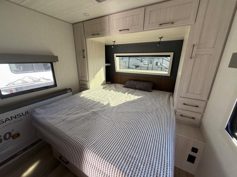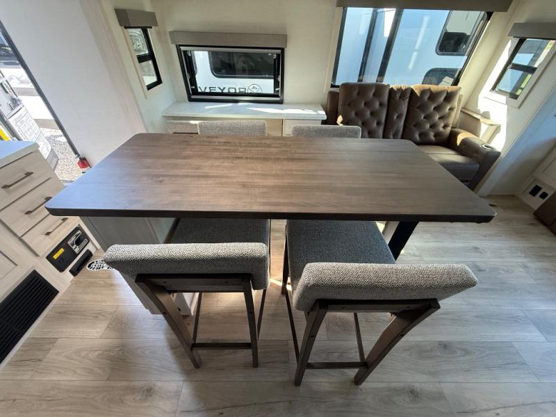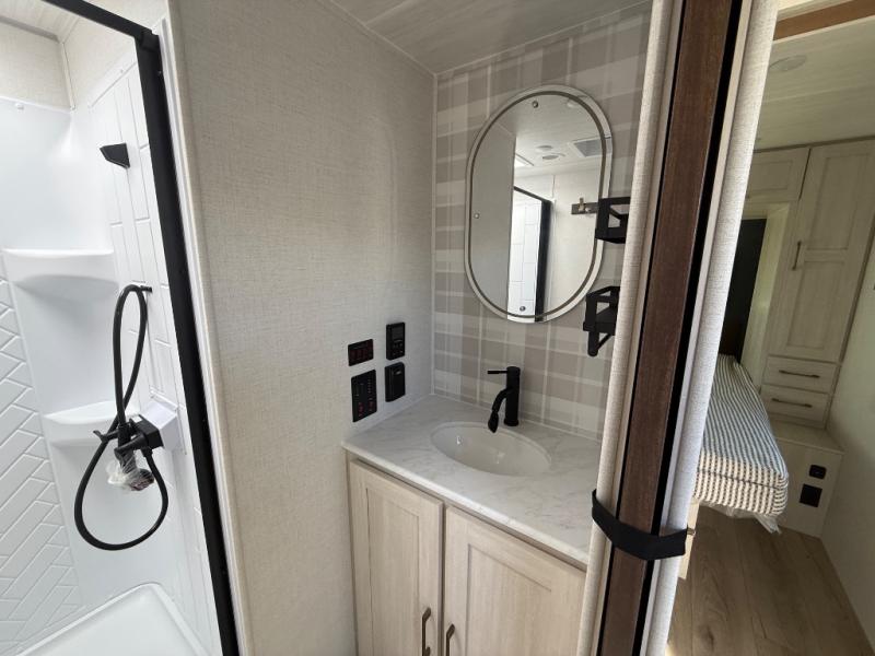 If comfort is what you're looking for, you won't have to search far with this travel trailer! There are dual opposing slides in the main living area for maximum space. The kitchen that flows from the living room area features a high-top dinette that gives a more residential feel to this space, plus there is a pantry, overhead storage, a 10 cu. ft. 12V black glass refrigerator, and more kitchen features you are sure to love. The rear living area includes an EZ-out sofa bed to provide sleeping space for two overnight guests, and there is a theater seat across from the fireplace and HD TV. You'll also enjoy a refreshing drink at the bar top that can also function as a desk! When it's time to call it a night, you can clean up in the spacious full bath, then head to the front bedroom. There is a custom king bed here along with two wardrobes and overhead storage that makes organizing easy!