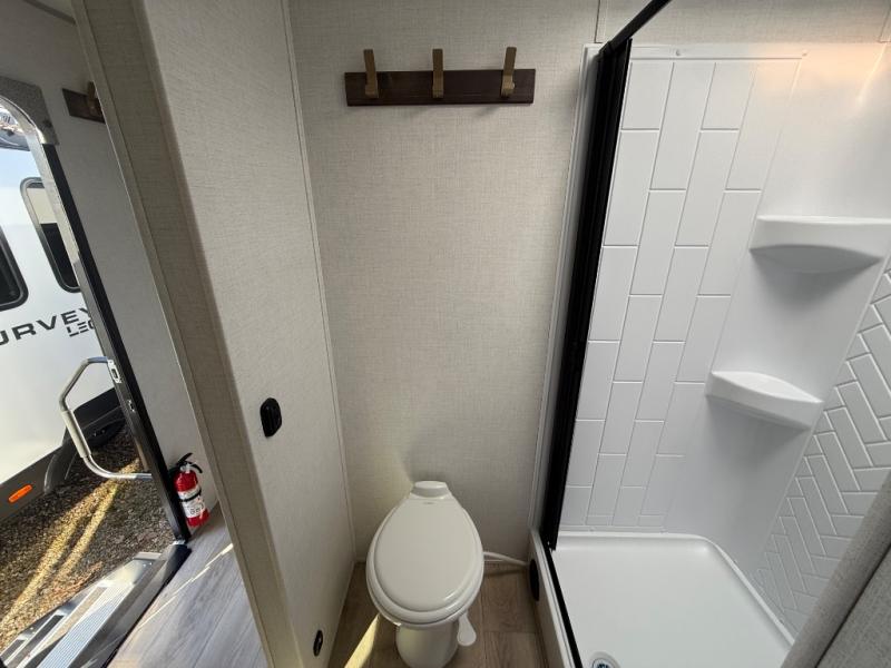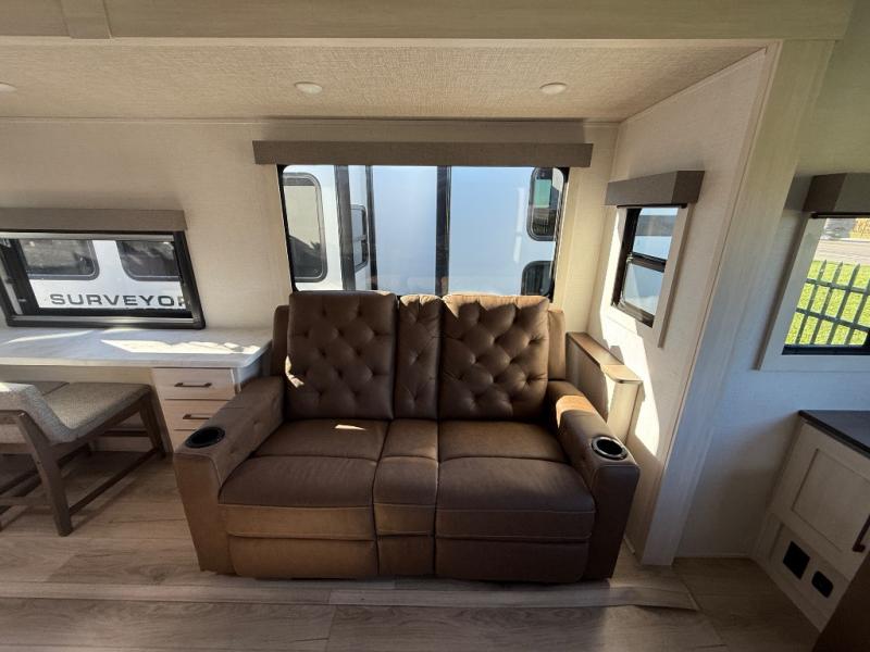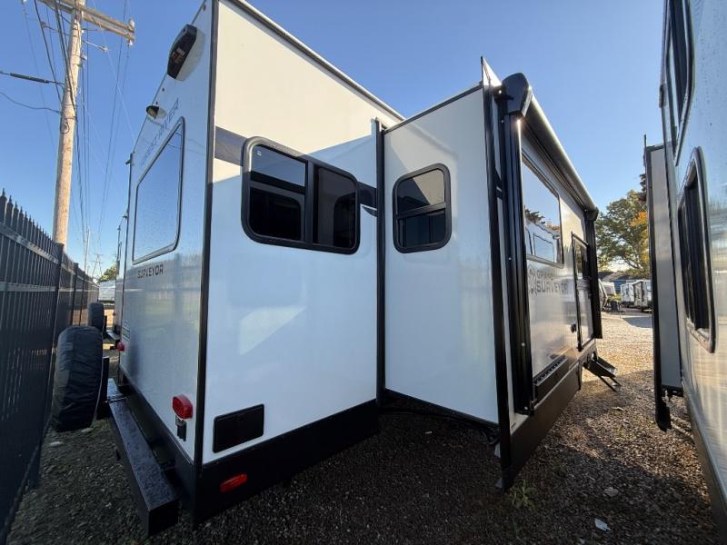With any Grand Surveyor travel trailer by Forest River you will enjoy turn-key ready-to-go features and quality construction! Each model includes Azdel composite walls and a gel coated fiberglass front cap with an automotive style tinted windshield for a sleek look. There are friction hinge black glass entry door(s), an adjustable platform step with a night light, plus Goodyear tires and a power tongue jack for easy towing. The interior will have you feeling right at home with roller shades, residential faucets, sinks, and bathroom vanity, plus Surf(x) seamless countertops throughout. You can also plan for adventure with a 2" rear accessory and exterior spray port, and there are slam latch exterior baggage doors throughout to keep all your gear secure. Other stand-out features include a central vacuum system, a 200 watt solar panel with a 30 amp controller, a tankless water heater, carpet-free interiors, and the list goes on!