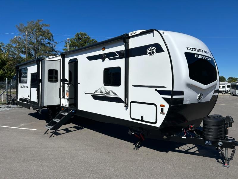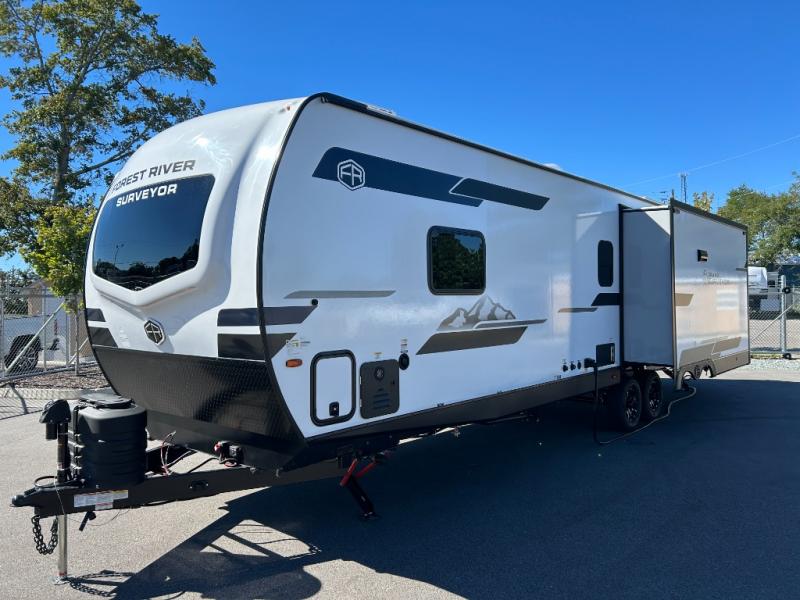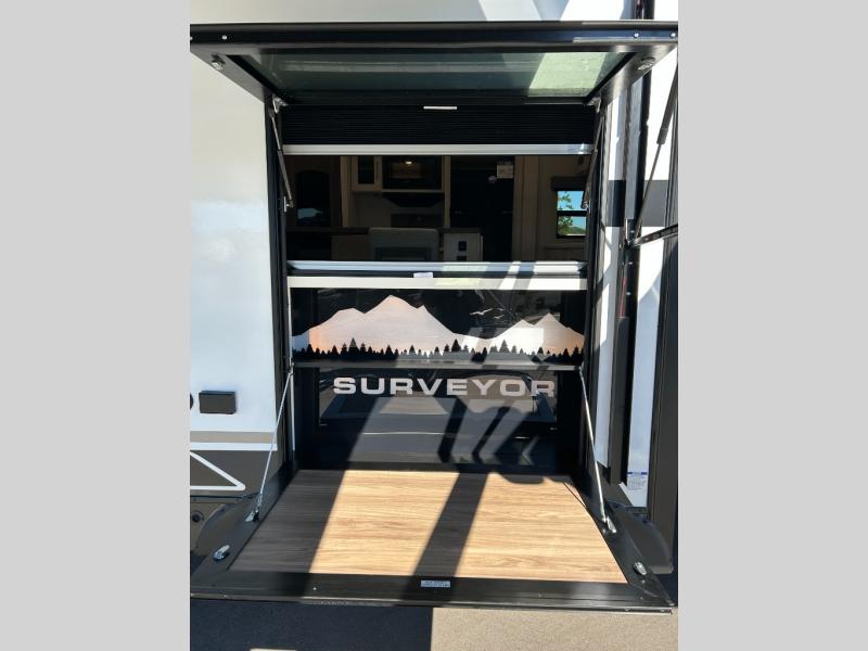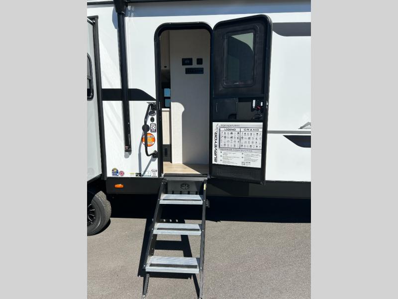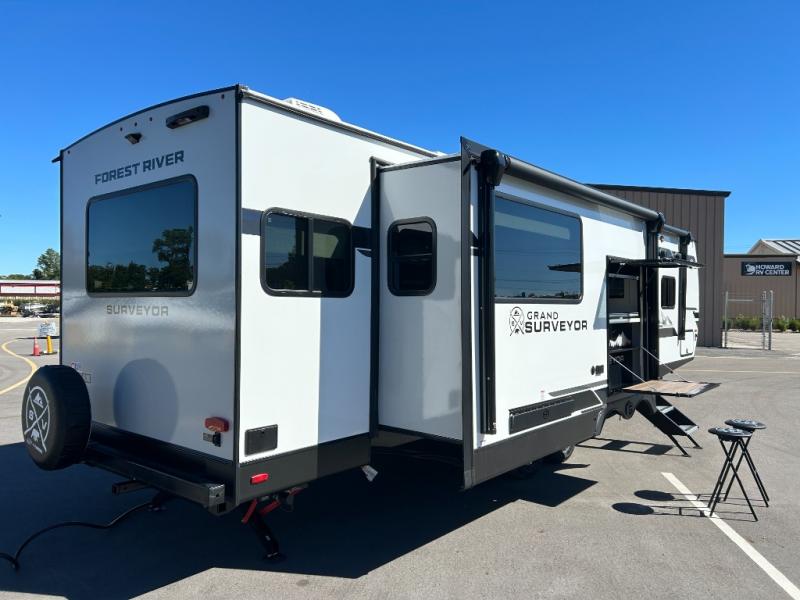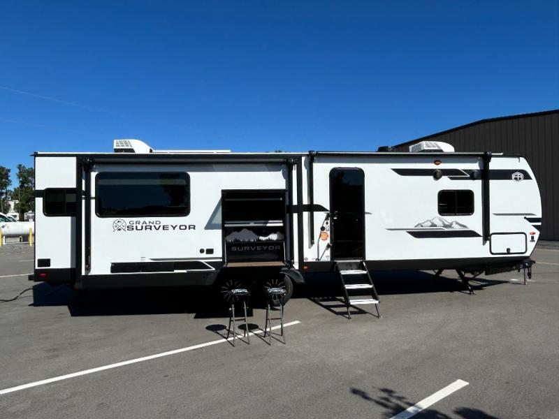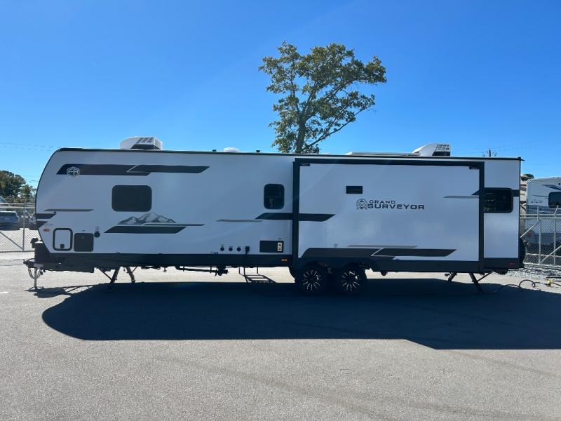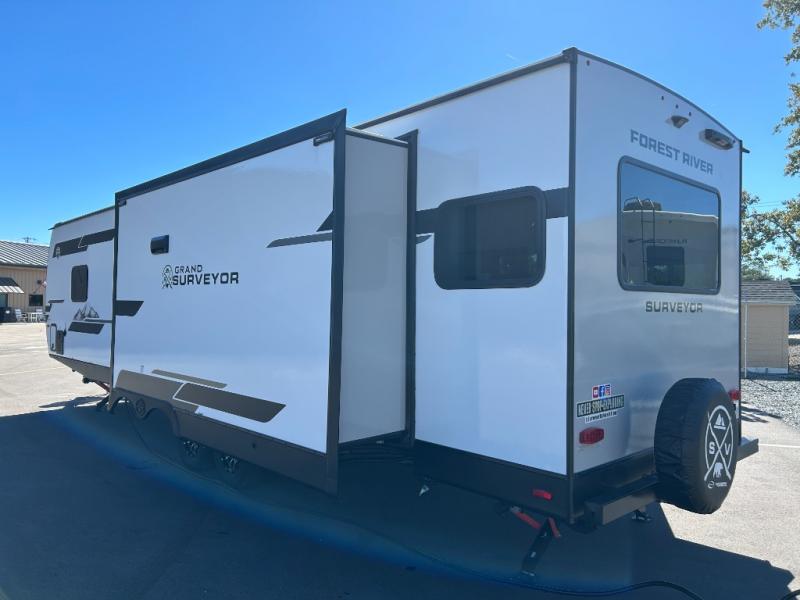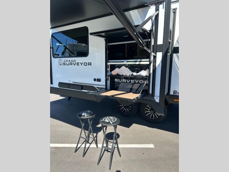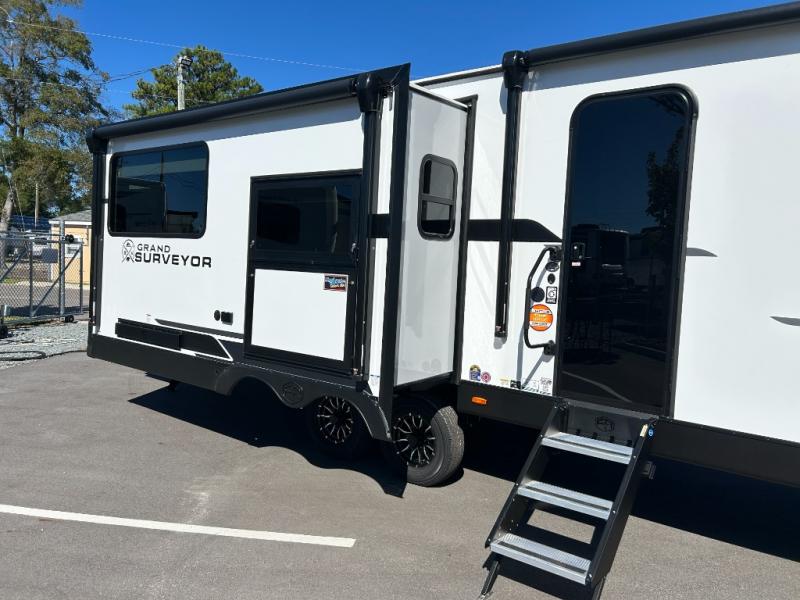 With any Grand Surveyor travel trailer by Forest River you will enjoy turn-key ready-to-go features and quality construction! Each model includes Azdel composite walls and a gel coated fiberglass front cap with an automotive style tinted windshield for a sleek look. There are friction hinge black glass entry door(s), an adjustable platform step with a night light, plus Goodyear tires and a power tongue jack for easy towing. The interior will have you feeling right at home with roller shades, residential faucets, sinks, and bathroom vanity, plus Surf(x) seamless countertops throughout. You can also plan for adventure with a 2" rear accessory and exterior spray port, and there are slam latch exterior baggage doors throughout to keep all your gear secure. Other stand-out features include a central vacuum system, 2 x 200 watt solar panels with a 30 amp controller, a LPG tankless water heater, carpet-free interiors, and the list goes on!