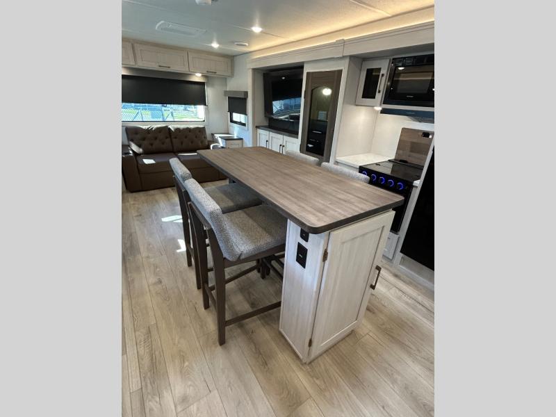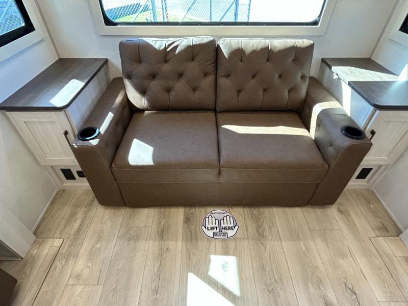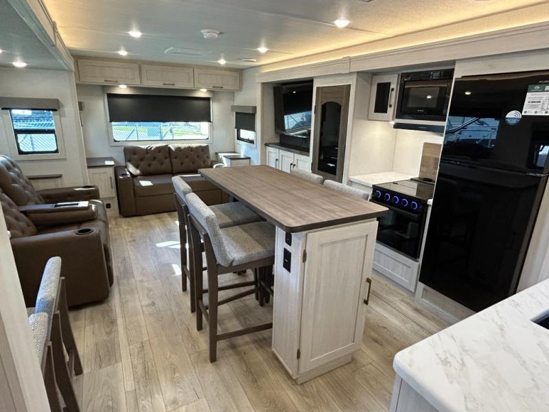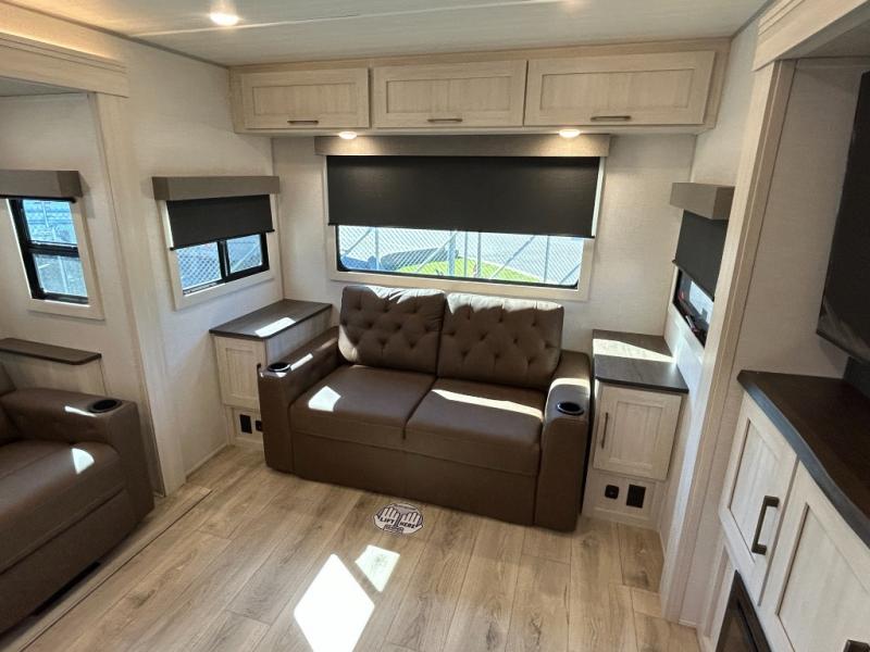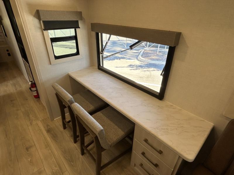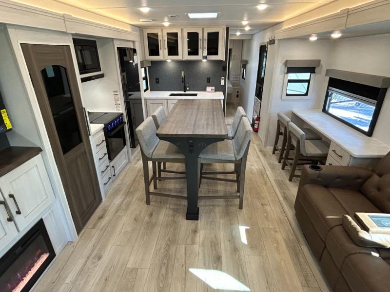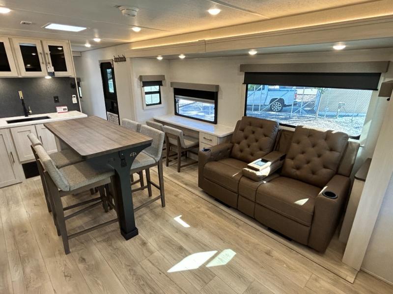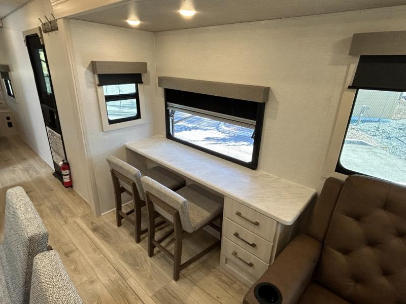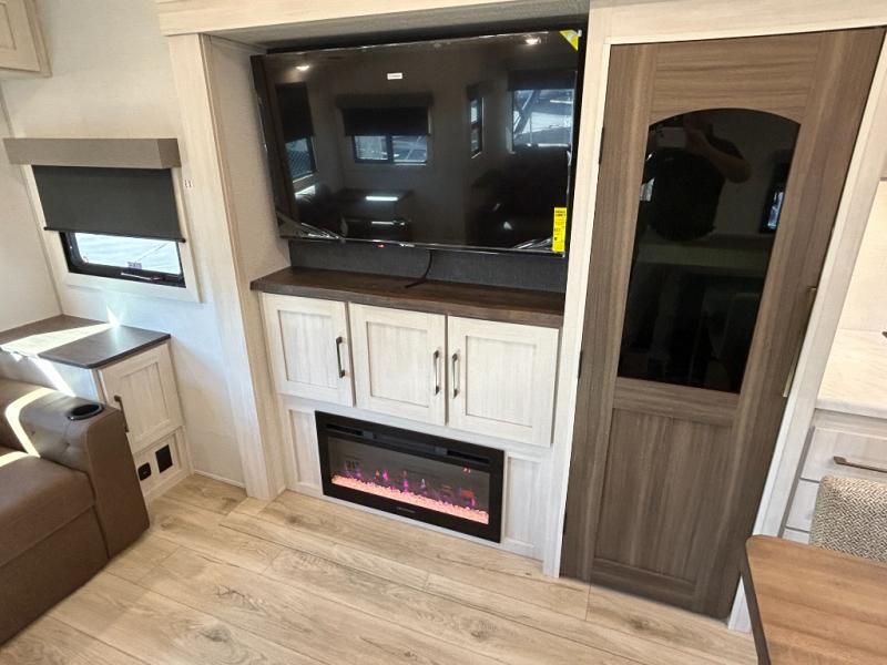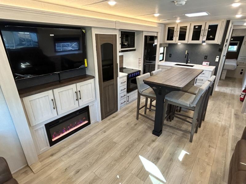 If comfort is what you're looking for, you won't have to search far with this travel trailer! There are dual opposing slides in the main living area for maximum space. The kitchen that flows from the living room area features a high-top dinette that gives a more residential feel to this space, plus there is a pantry, overhead storage, a 10 cu. ft. 12V black glass refrigerator, and more kitchen features you are sure to love. The rear living area includes an EZ-out sofa bed to provide sleeping space for two overnight guests, and there is a theater seat across from the fireplace and HD TV. You'll also enjoy a refreshing drink at the bar top that can also function as a desk! When it's time to call it a night, you can clean up in the spacious full bath, then head to the front bedroom. There is a custom king bed here along with two wardrobes and overhead storage that makes organizing easy!