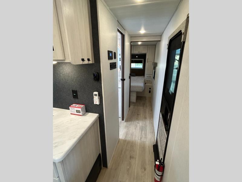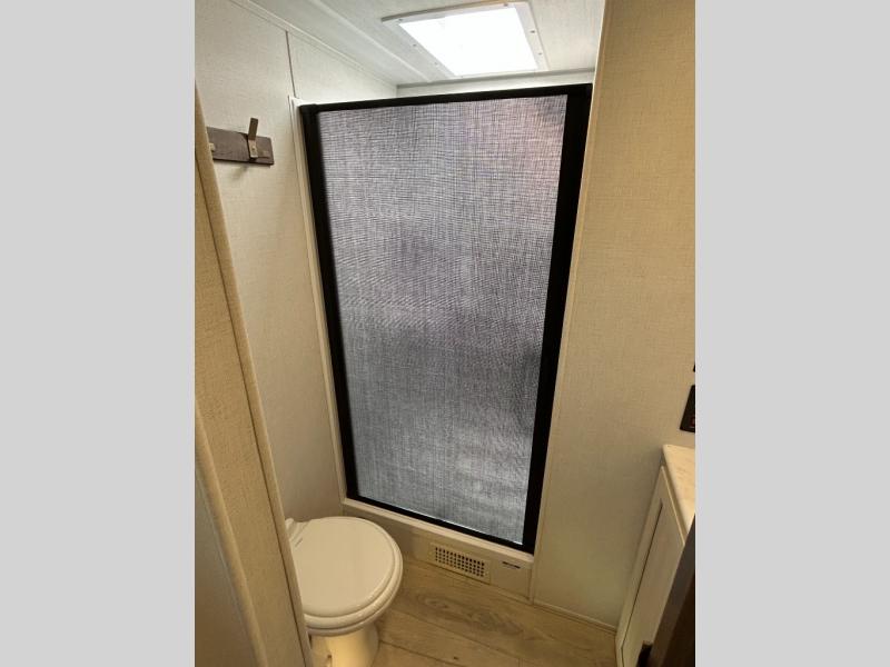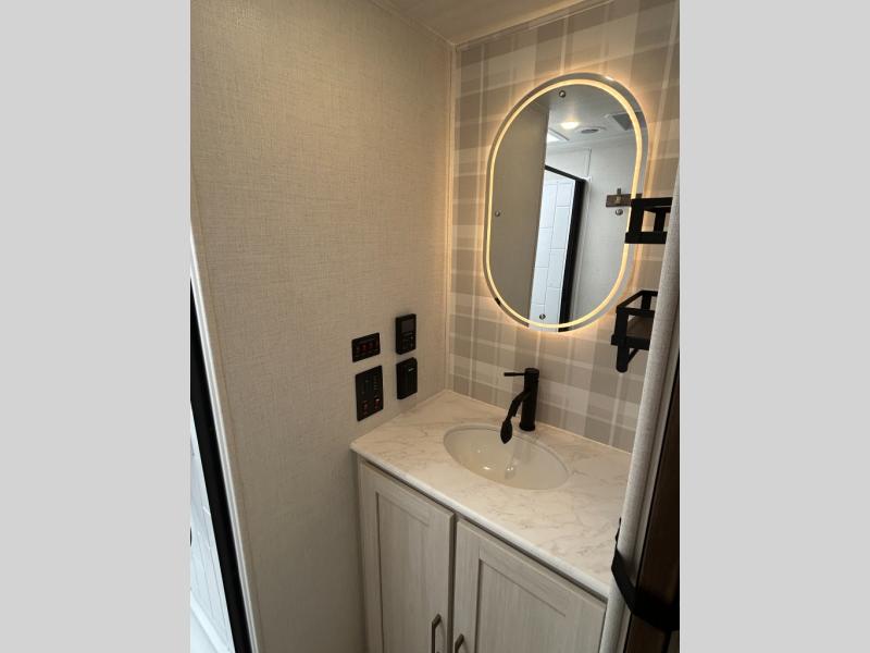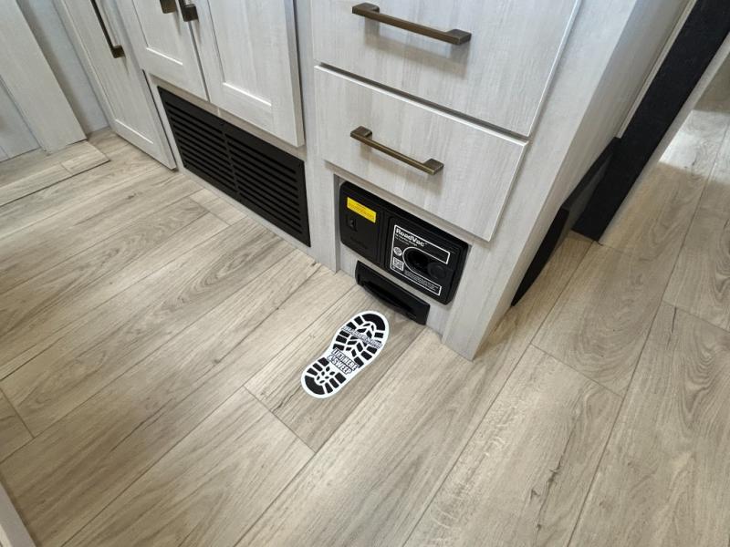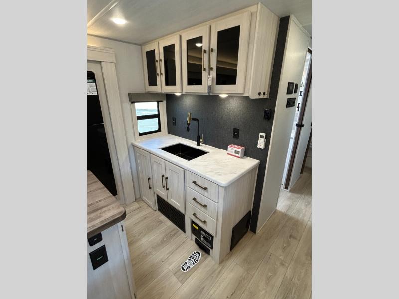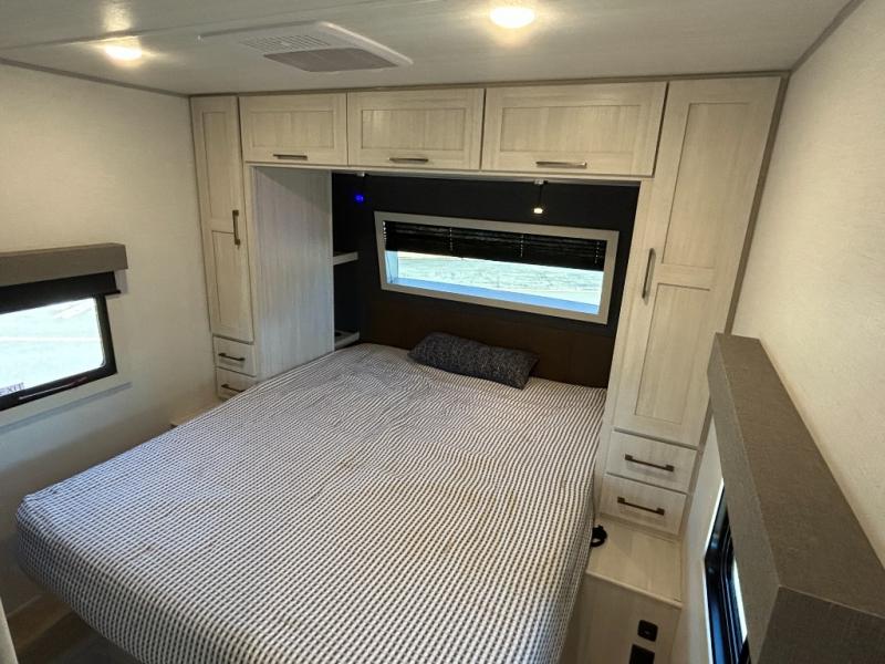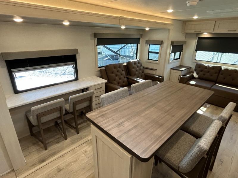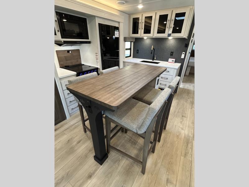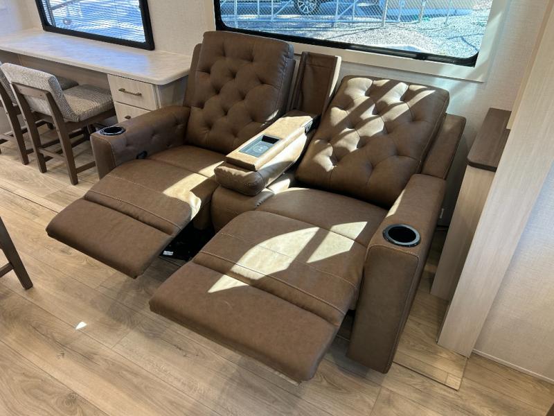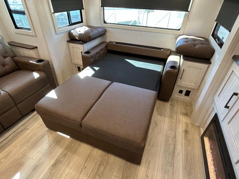 If comfort is what you're looking for, you won't have to search far with this travel trailer! There are dual opposing slides in the main living area for maximum space. The kitchen that flows from the living room area features a high-top dinette that gives a more residential feel to this space, plus there is a pantry, overhead storage, a 10 cu. ft. 12V black glass refrigerator, and more kitchen features you are sure to love. The rear living area includes an EZ-out sofa bed to provide sleeping space for two overnight guests, and there is a theater seat across from the fireplace and HD TV. You'll also enjoy a refreshing drink at the bar top that can also function as a desk! When it's time to call it a night, you can clean up in the spacious full bath, then head to the front bedroom. There is a custom king bed here along with two wardrobes and overhead storage that makes organizing easy!