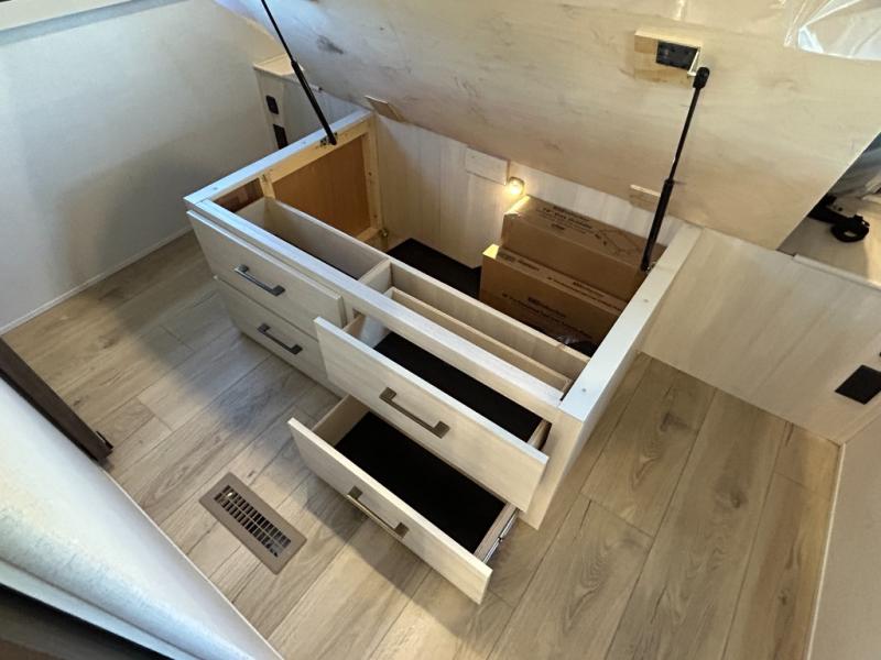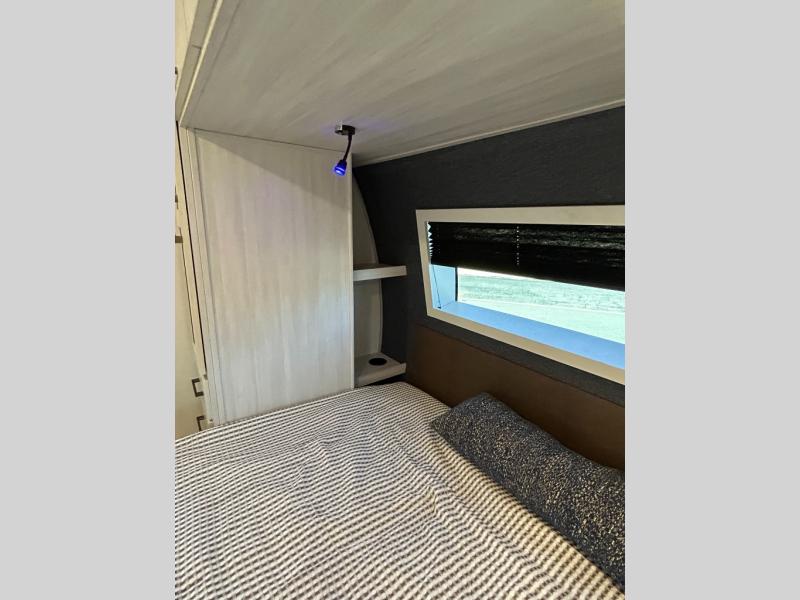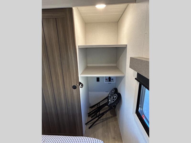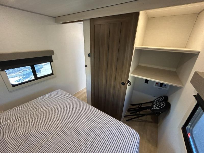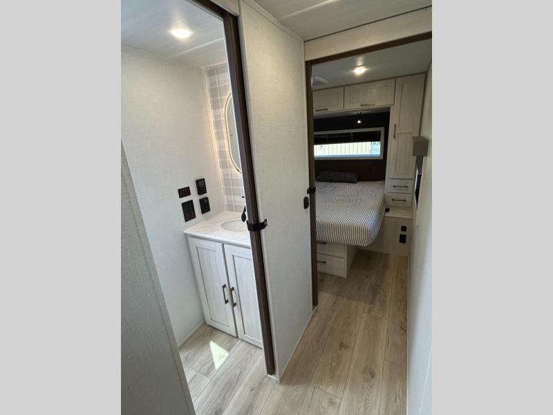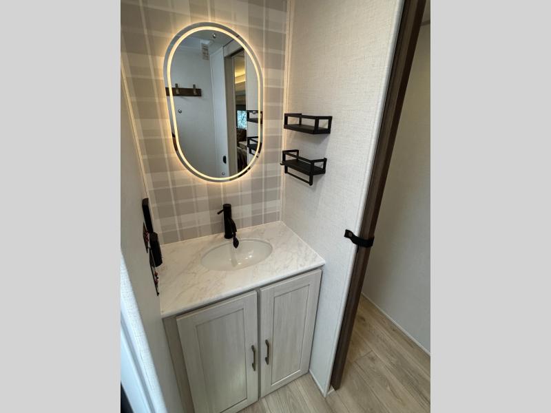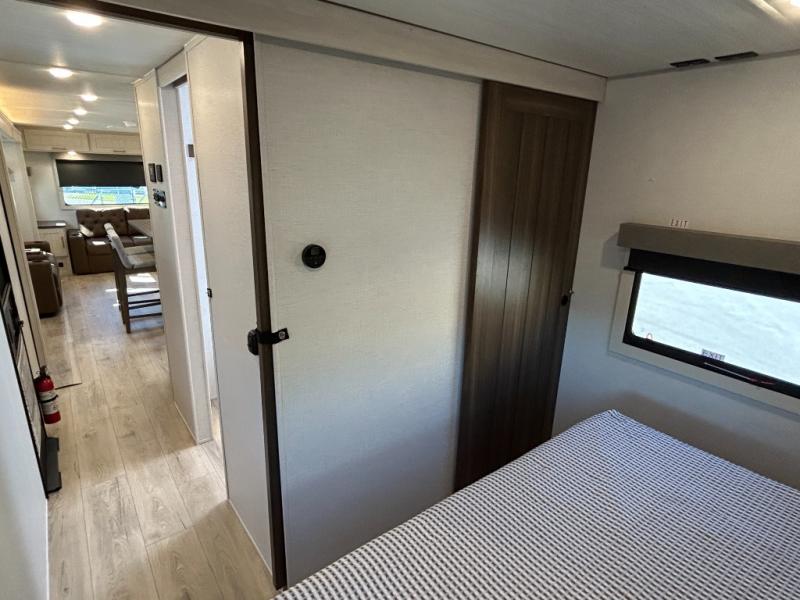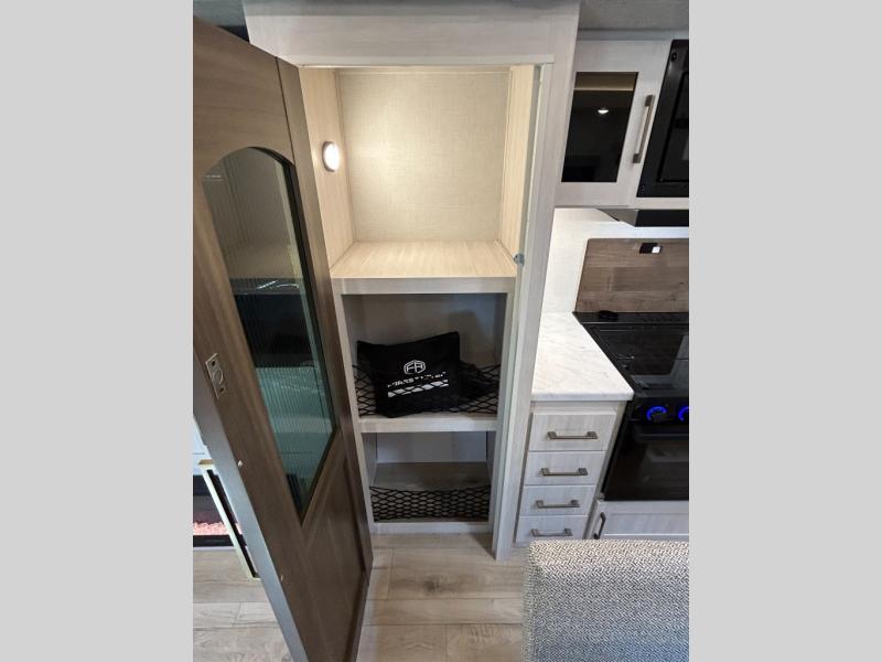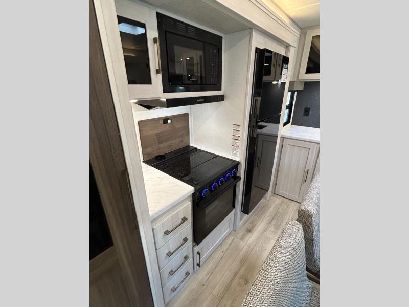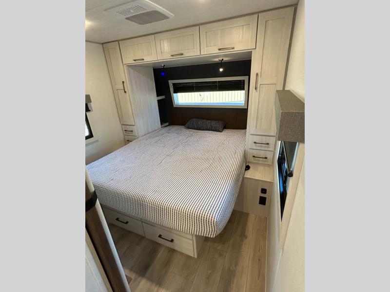 If comfort is what you're looking for, you won't have to search far with this travel trailer! There are dual opposing slides in the main living area for maximum space. The kitchen that flows from the living room area features a high-top dinette that gives a more residential feel to this space, plus there is a pantry, overhead storage, a 10 cu. ft. 12V black glass refrigerator, and more kitchen features you are sure to love. The rear living area includes an EZ-out sofa bed to provide sleeping space for two overnight guests, and there is a theater seat across from the fireplace and HD TV. You'll also enjoy a refreshing drink at the bar top that can also function as a desk! When it's time to call it a night, you can clean up in the spacious full bath, then head to the front bedroom. There is a custom king bed here along with two wardrobes and overhead storage that makes organizing easy!
