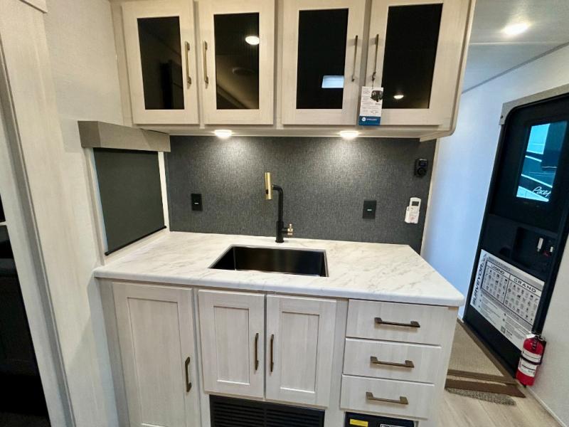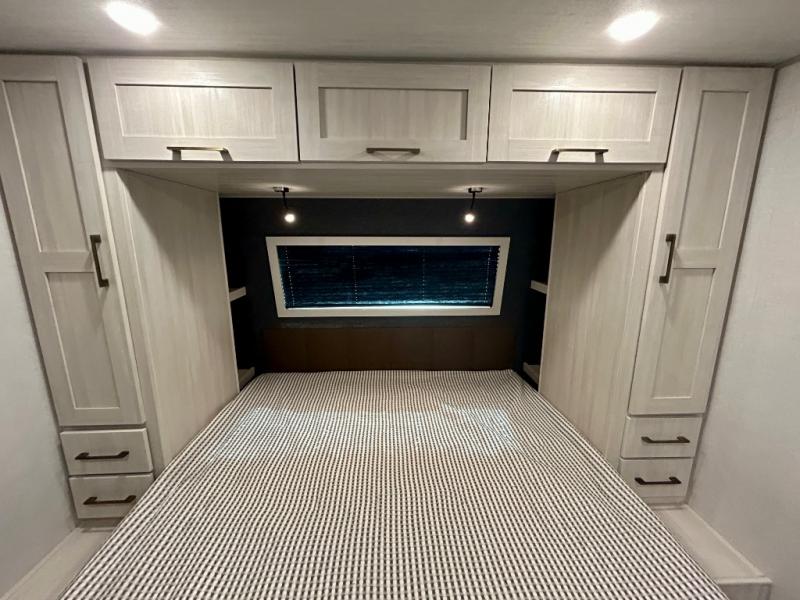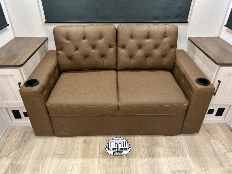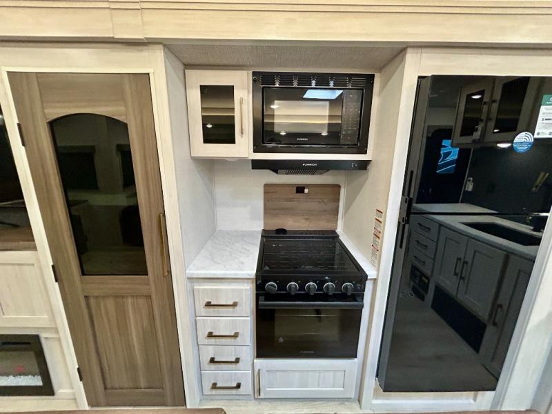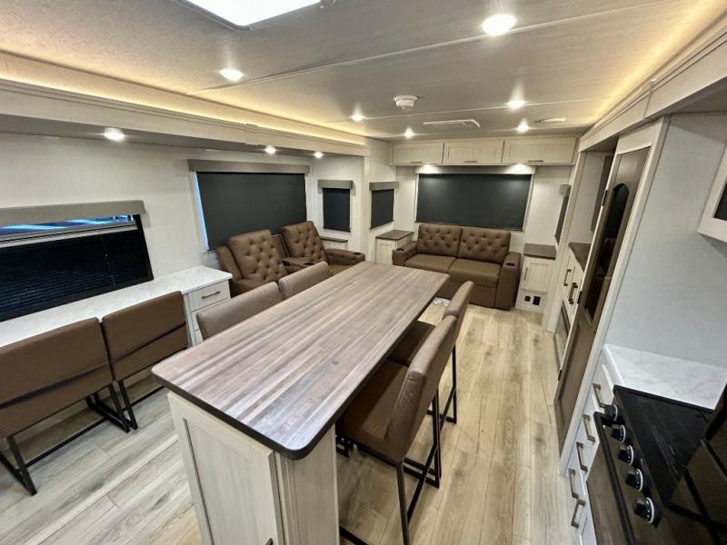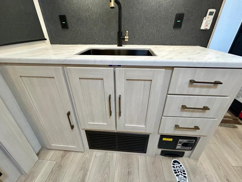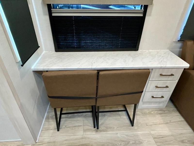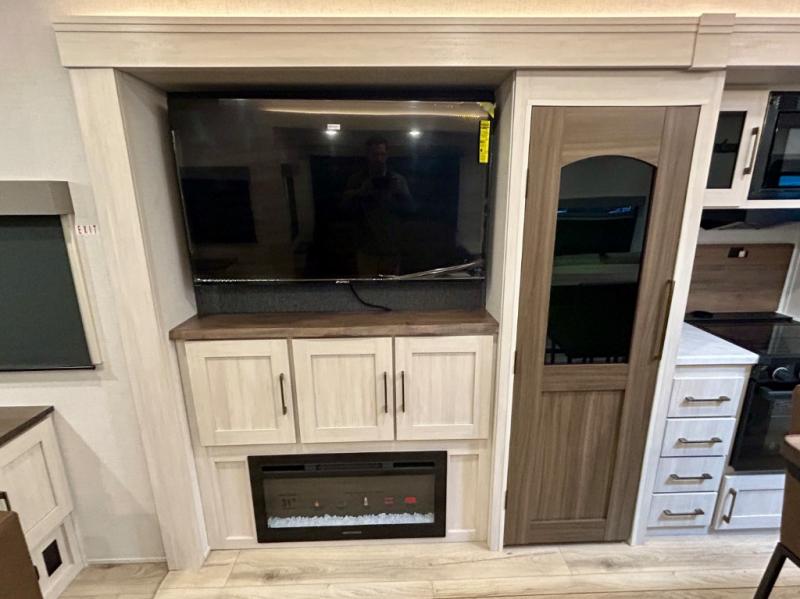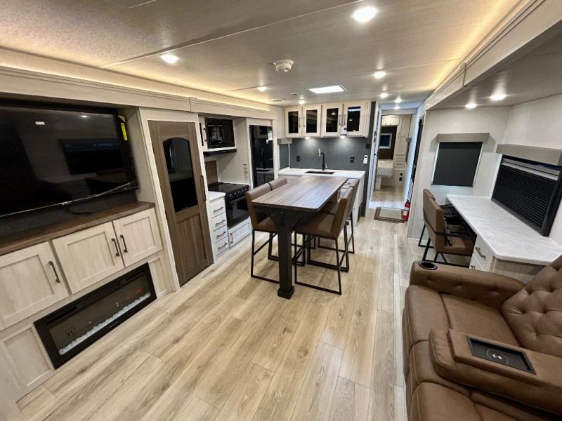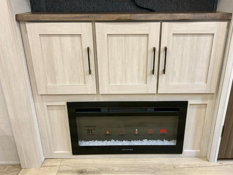 If comfort is what you're looking for, you won't have to search far with this travel trailer! There are dual opposing slides in the main living area for maximum space. The kitchen that flows from the living room area features a high-top dinette that gives a more residential feel to this space, plus there is a pantry, overhead storage, a 10 cu. ft. 12V black glass refrigerator, and more kitchen features you are sure to love. The rear living area includes an EZ-out sofa bed to provide sleeping space for two overnight guests, and there is a theater seat across from the fireplace and HD TV. You'll also enjoy a refreshing drink at the bar top that can also function as a desk! When it's time to call it a night, you can clean up in the spacious full bath, then head to the front bedroom. There is a custom king bed here along with two wardrobes and overhead storage that makes organizing easy!