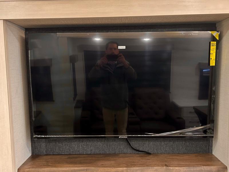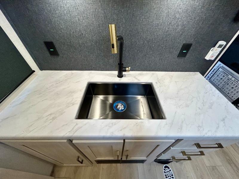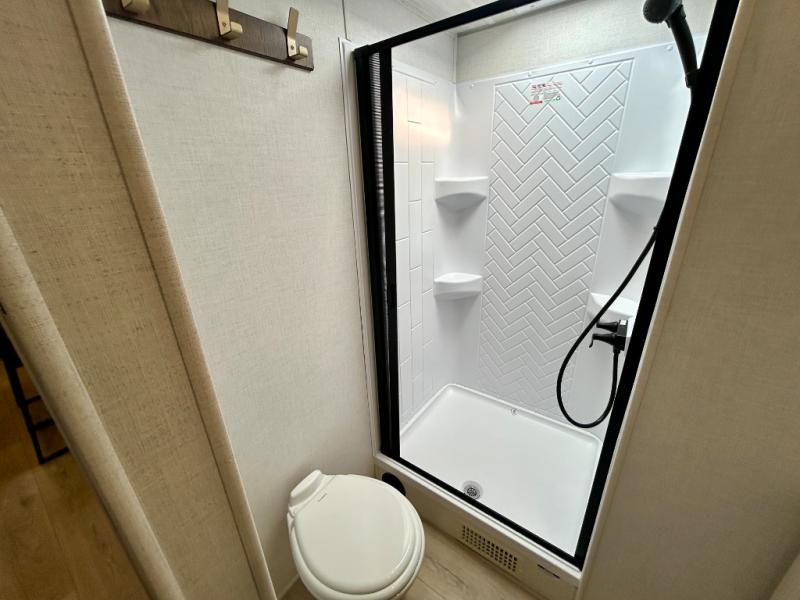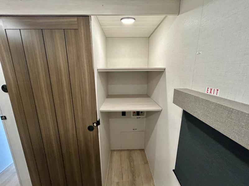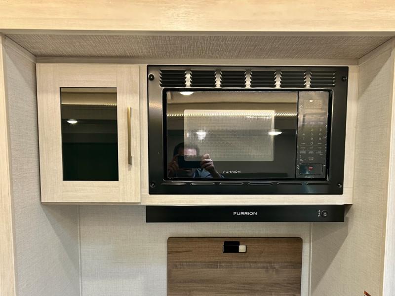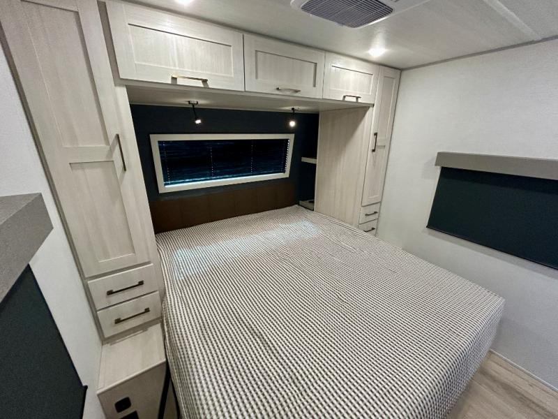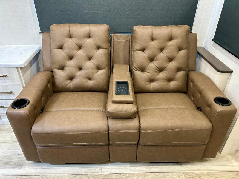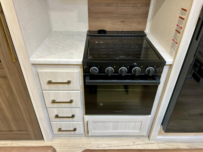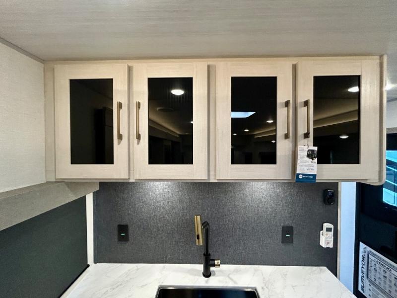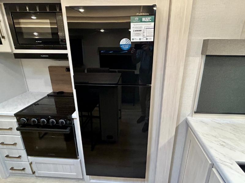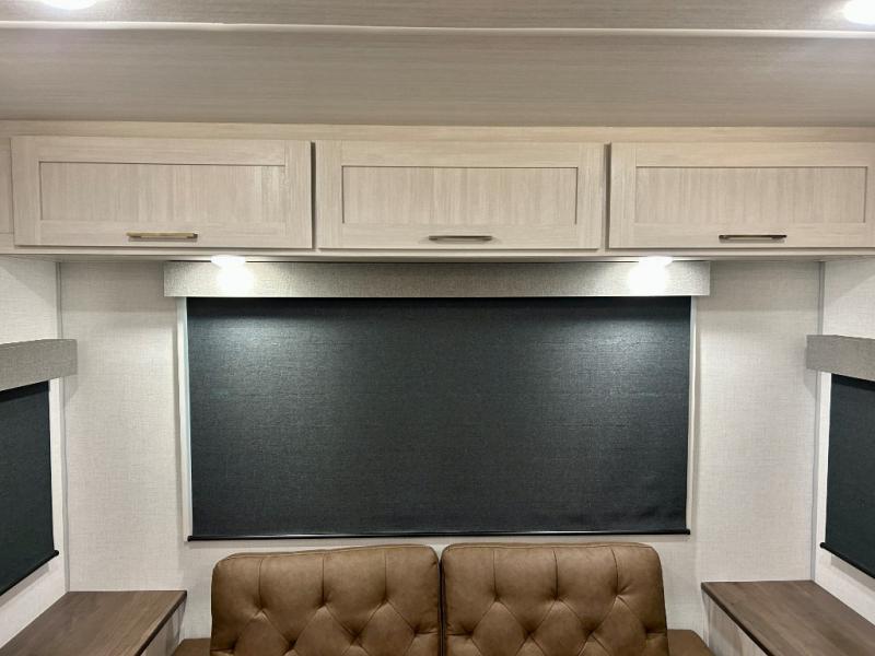 If comfort is what you're looking for, you won't have to search far with this travel trailer! There are dual opposing slides in the main living area for maximum space. The kitchen that flows from the living room area features a high-top dinette that gives a more residential feel to this space, plus there is a pantry, overhead storage, a 10 cu. ft. 12V black glass refrigerator, and more kitchen features you are sure to love. The rear living area includes an EZ-out sofa bed to provide sleeping space for two overnight guests, and there is a theater seat across from the fireplace and HD TV. You'll also enjoy a refreshing drink at the bar top that can also function as a desk! When it's time to call it a night, you can clean up in the spacious full bath, then head to the front bedroom. There is a custom king bed here along with two wardrobes and overhead storage that makes organizing easy!