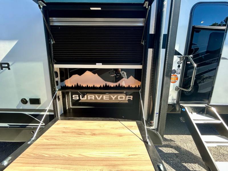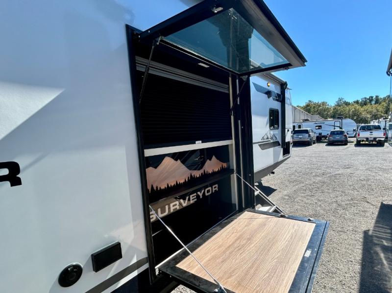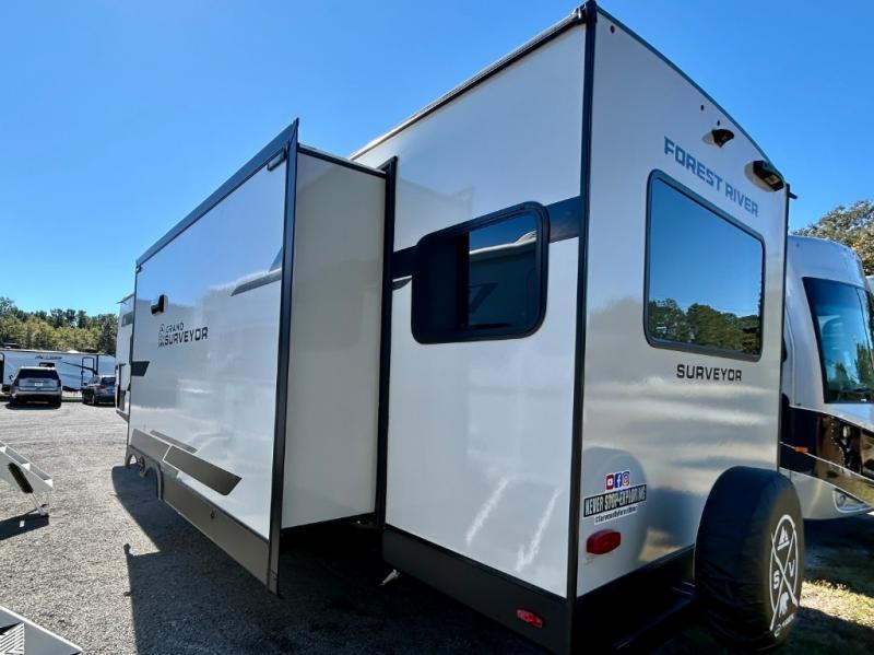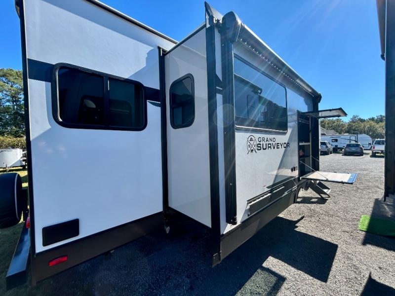 With any Grand Surveyor travel trailer by Forest River you will enjoy turn-key ready-to-go features and quality construction! Each model includes Azdel composite walls and a gel coated fiberglass front cap with an automotive style tinted windshield for a sleek look. There are friction hinge black glass entry door(s), an adjustable platform step with a night light, plus Goodyear tires and a power tongue jack for easy towing. The interior will have you feeling right at home with roller shades, residential faucets, sinks, and bathroom vanity, plus Surf(x) seamless countertops throughout. You can also plan for adventure with a 2" rear accessory and exterior spray port, and there are slam latch exterior baggage doors throughout to keep all your gear secure. Other stand-out features include a central vacuum system, a 200 watt solar panel with a 30 amp controller, a tankless water heater, carpet-free interiors, and the list goes on!