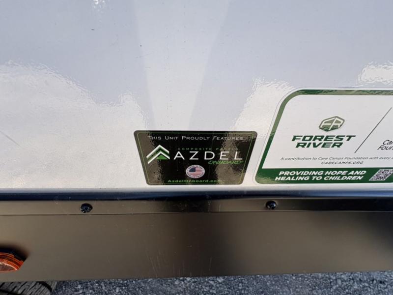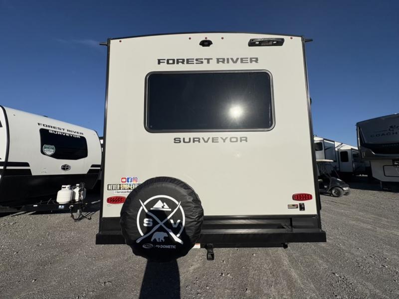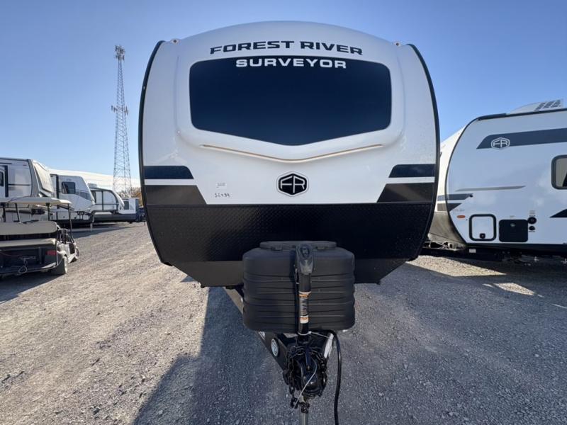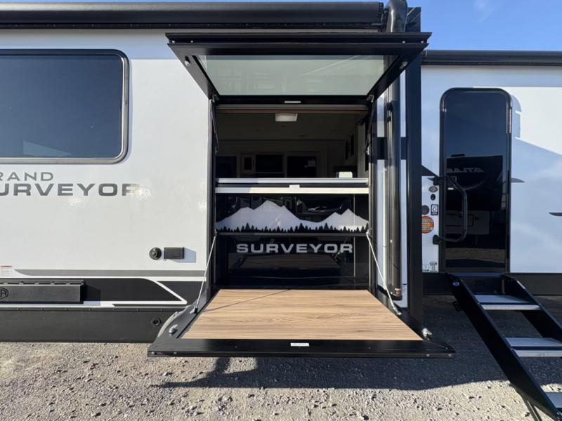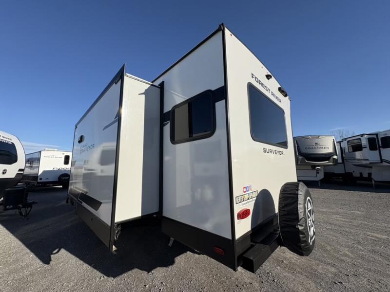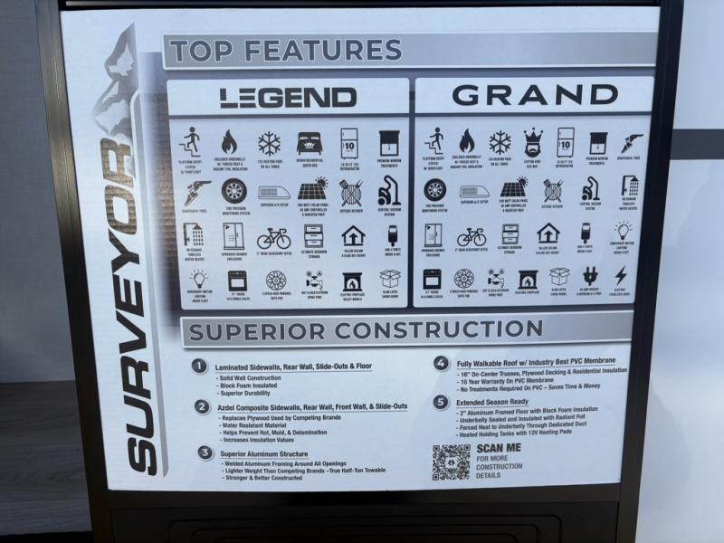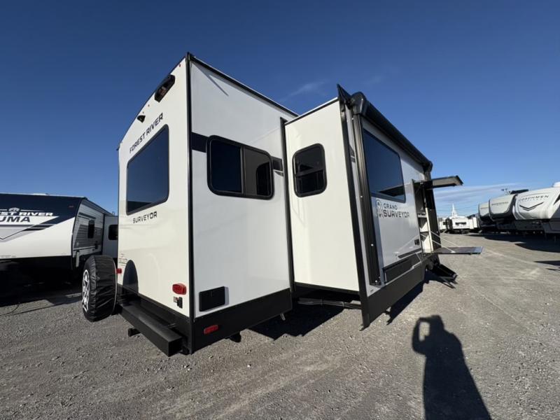 With any Grand Surveyor travel trailer by Forest River you will enjoy turn-key ready-to-go features and quality construction! Each model includes Azdel composite walls and a gel coated fiberglass front cap with an automotive style tinted windshield for a sleek look. There are friction hinge black glass entry door(s), an adjustable platform step with a night light, plus Goodyear tires and a power tongue jack for easy towing. The interior will have you feeling right at home with roller shades, residential faucets, sinks, and bathroom vanity, plus Surf(x) seamless countertops throughout. You can also plan for adventure with a 2" rear accessory and exterior spray port, and there are slam latch exterior baggage doors throughout to keep all your gear secure. Other stand-out features include a central vacuum system, a 200 watt solar panel with a 30 amp controller, a tankless water heater, carpet-free interiors, and the list goes on!