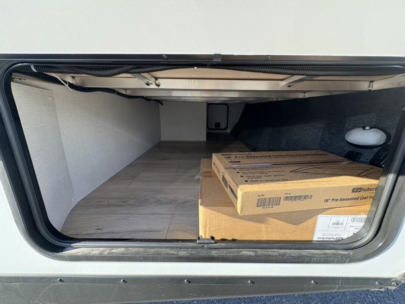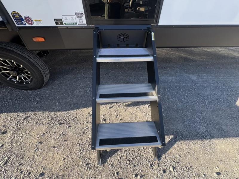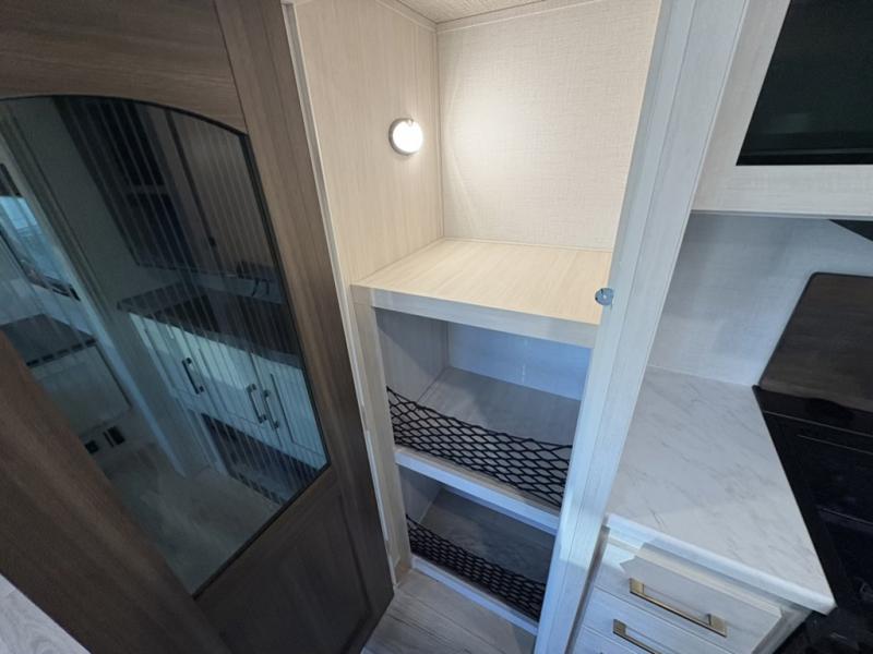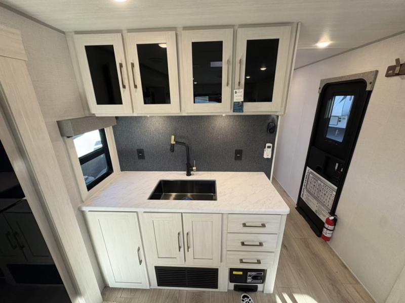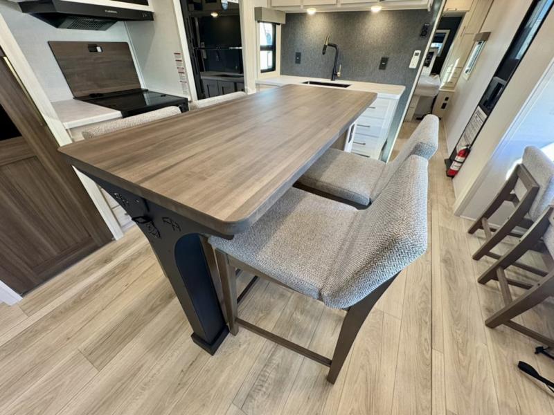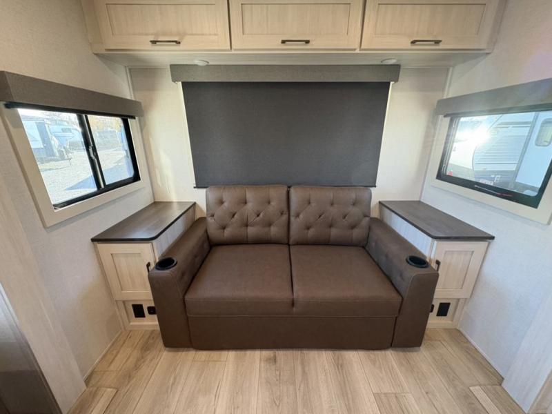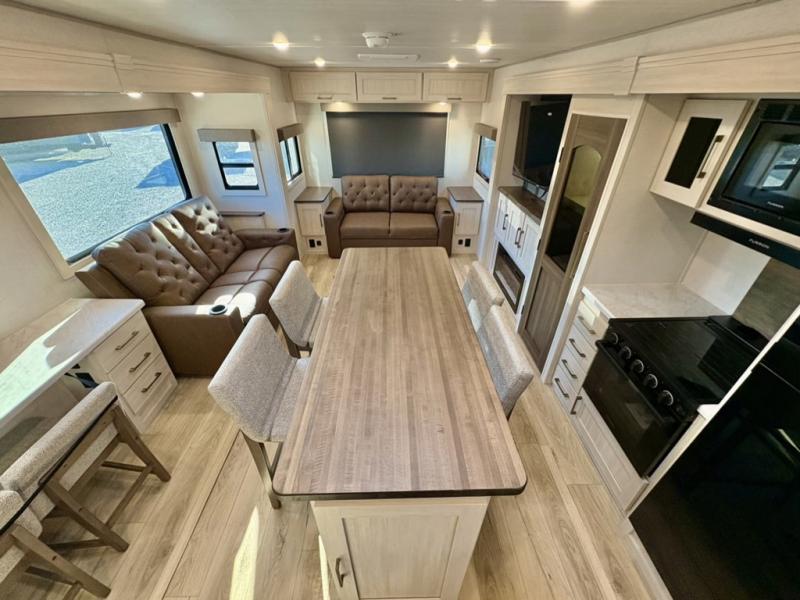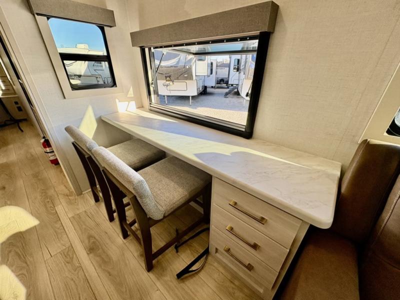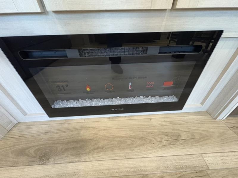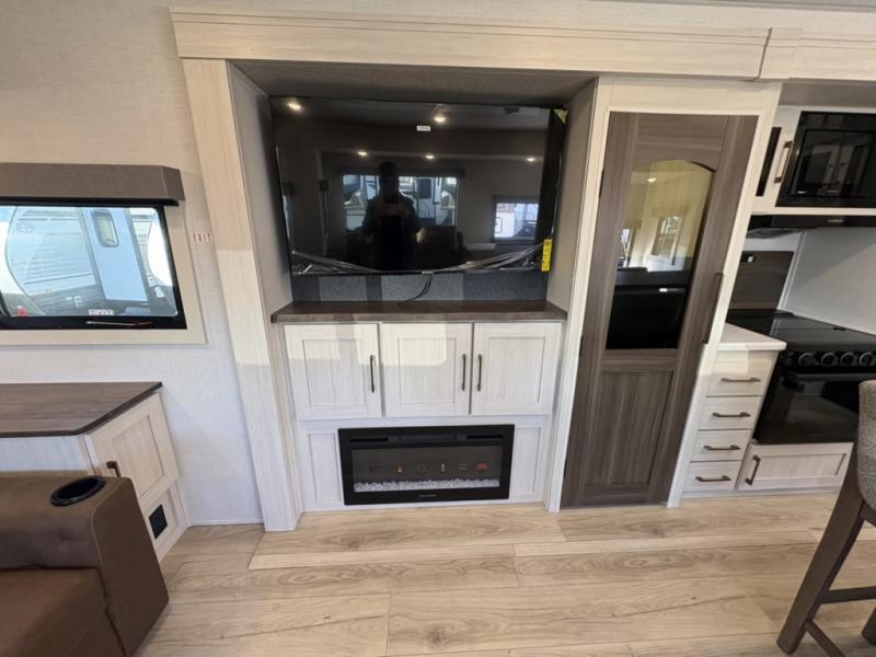 If comfort is what you're looking for, you won't have to search far with this travel trailer! There are dual opposing slides in the main living area for maximum space. The kitchen that flows from the living room area features a high-top dinette that gives a more residential feel to this space, plus there is a pantry, overhead storage, a 10 cu. ft. 12V black glass refrigerator, and more kitchen features you are sure to love. The rear living area includes an EZ-out sofa bed to provide sleeping space for two overnight guests, and there is a theater seat across from the fireplace and HD TV. You'll also enjoy a refreshing drink at the bar top that can also function as a desk! When it's time to call it a night, you can clean up in the spacious full bath, then head to the front bedroom. There is a custom king bed here along with two wardrobes and overhead storage that makes organizing easy!