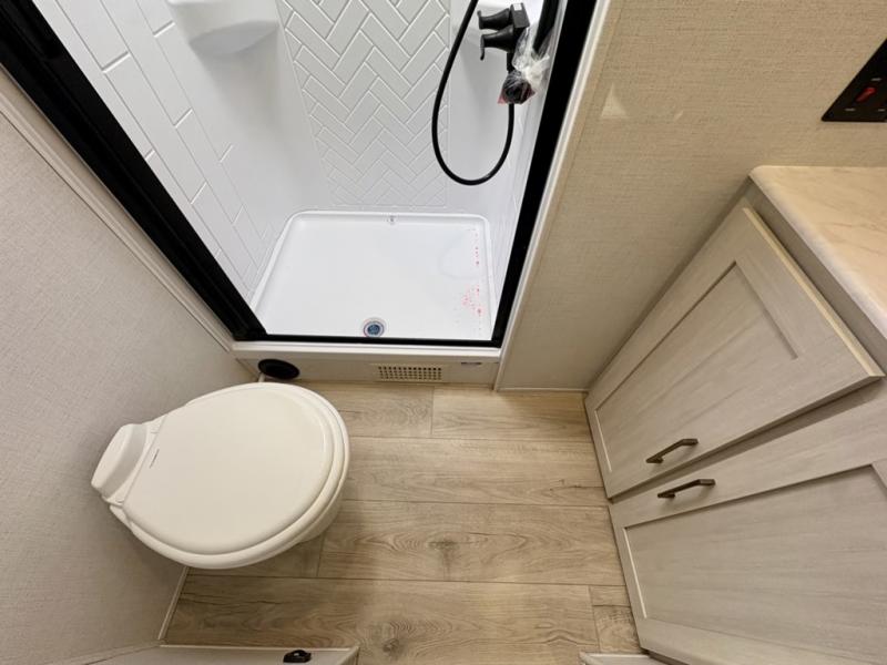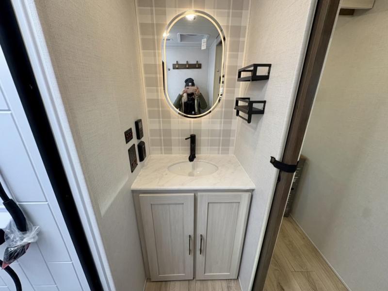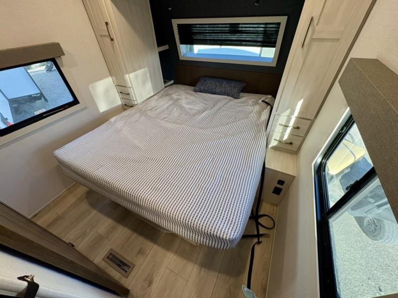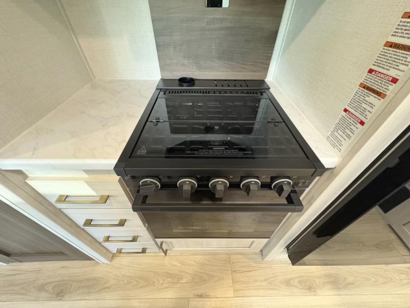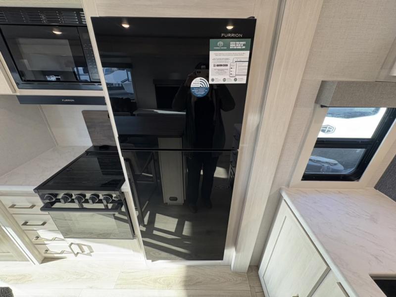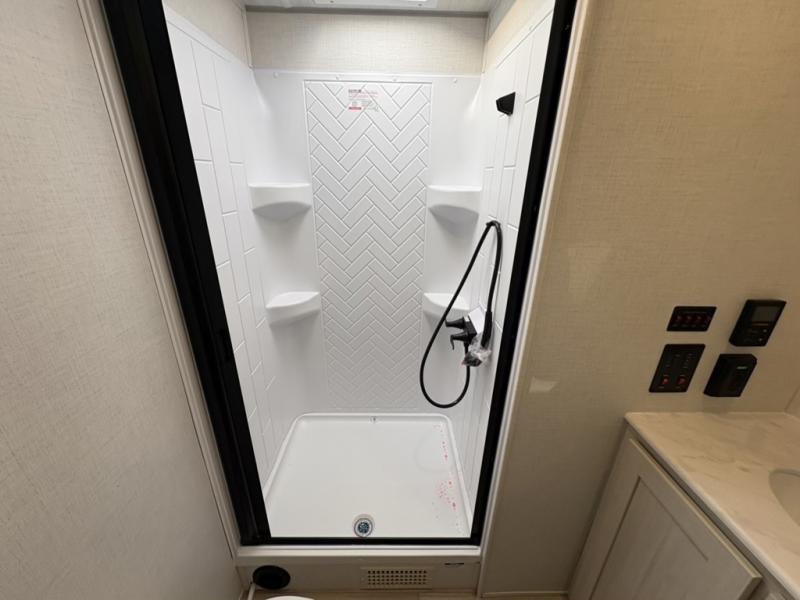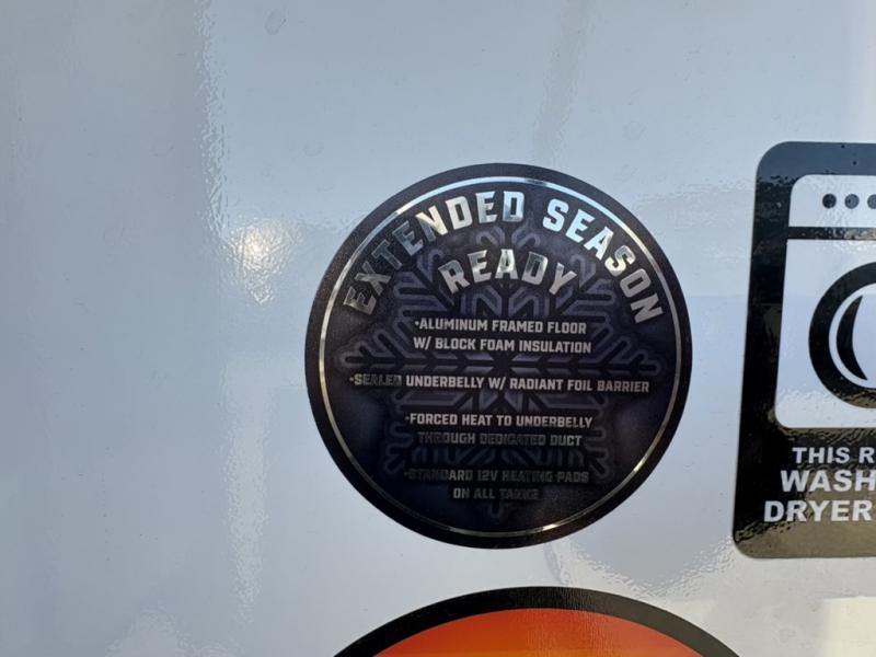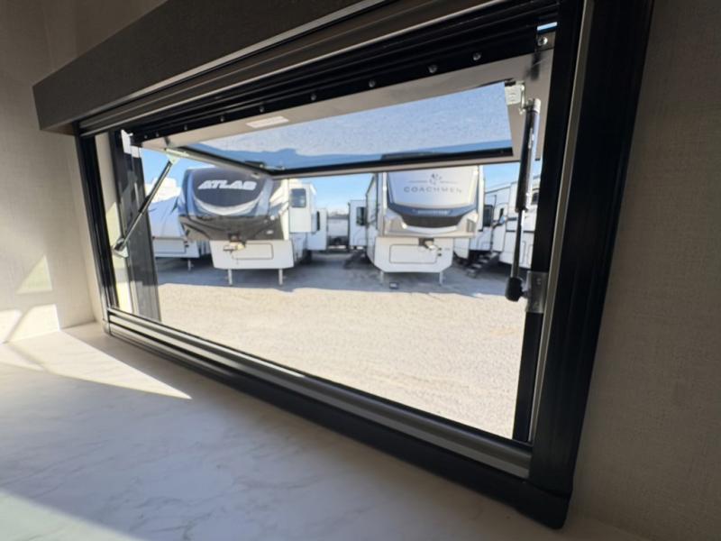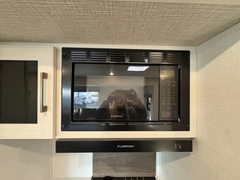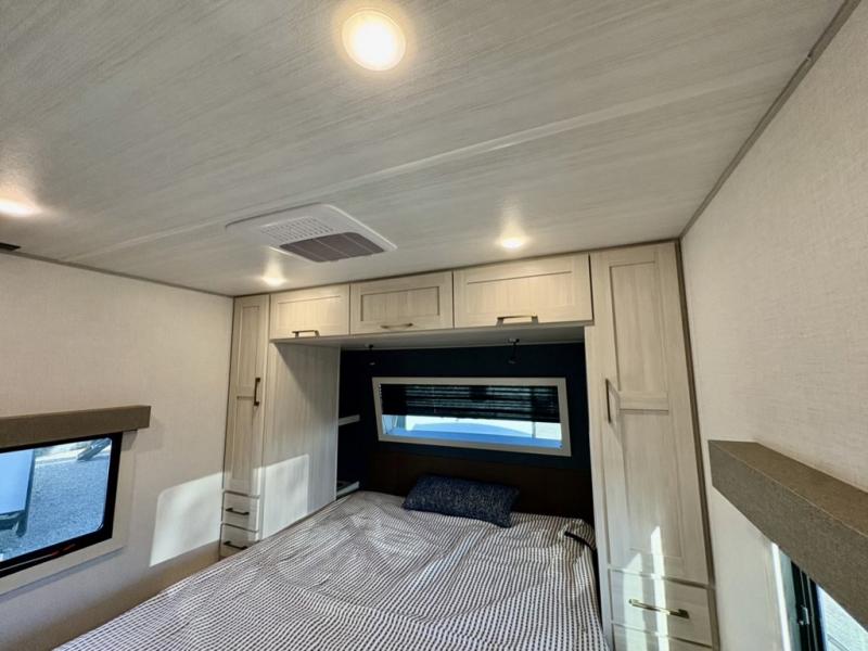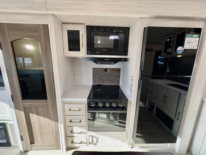 If comfort is what you're looking for, you won't have to search far with this travel trailer! There are dual opposing slides in the main living area for maximum space. The kitchen that flows from the living room area features a high-top dinette that gives a more residential feel to this space, plus there is a pantry, overhead storage, a 10 cu. ft. 12V black glass refrigerator, and more kitchen features you are sure to love. The rear living area includes an EZ-out sofa bed to provide sleeping space for two overnight guests, and there is a theater seat across from the fireplace and HD TV. You'll also enjoy a refreshing drink at the bar top that can also function as a desk! When it's time to call it a night, you can clean up in the spacious full bath, then head to the front bedroom. There is a custom king bed here along with two wardrobes and overhead storage that makes organizing easy!