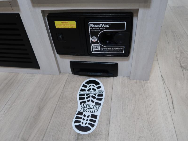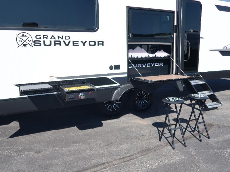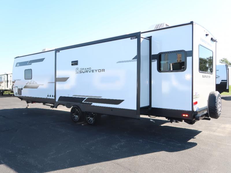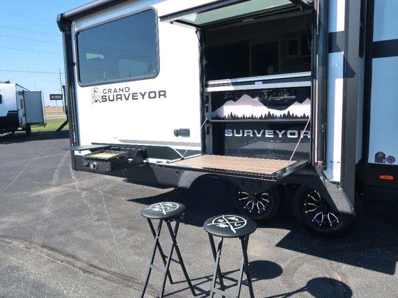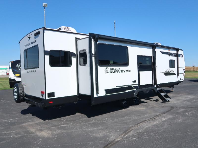 With any Grand Surveyor travel trailer by Forest River you will enjoy turn-key ready-to-go features and quality construction! Each model includes Azdel composite walls and a gel coated fiberglass front cap with an automotive style tinted windshield for a sleek look. There are friction hinge black glass entry door(s), an adjustable platform step with a night light, plus Goodyear tires and a power tongue jack for easy towing. The interior will have you feeling right at home with roller shades, residential faucets, sinks, and bathroom vanity, plus Surf(x) seamless countertops throughout. You can also plan for adventure with a 2" rear accessory and exterior spray port, and there are slam latch exterior baggage doors throughout to keep all your gear secure. Other stand-out features include a central vacuum system, a 200 watt solar panel with a 30 amp controller, a tankless water heater, carpet-free interiors, and the list goes on!