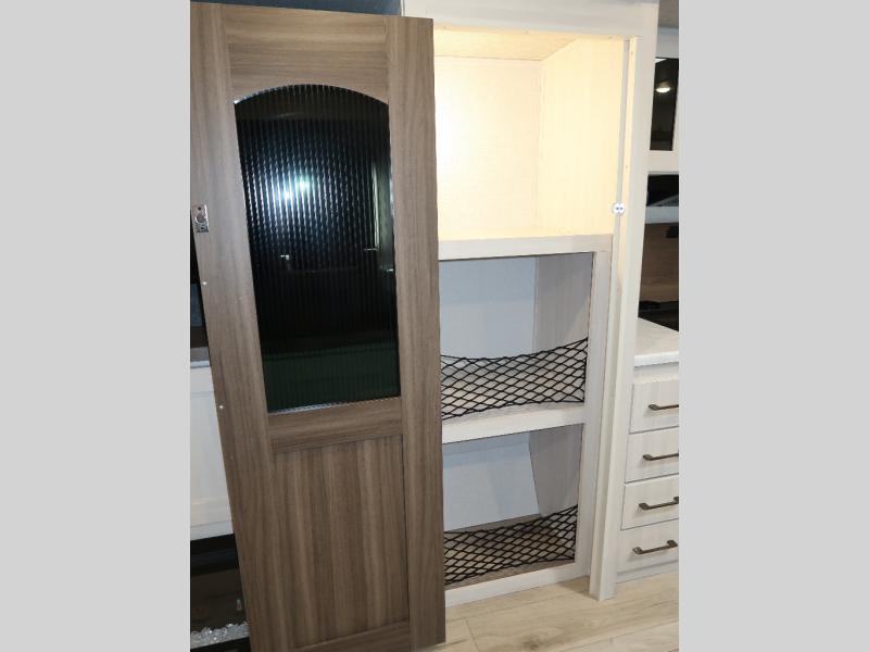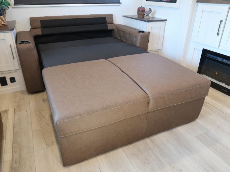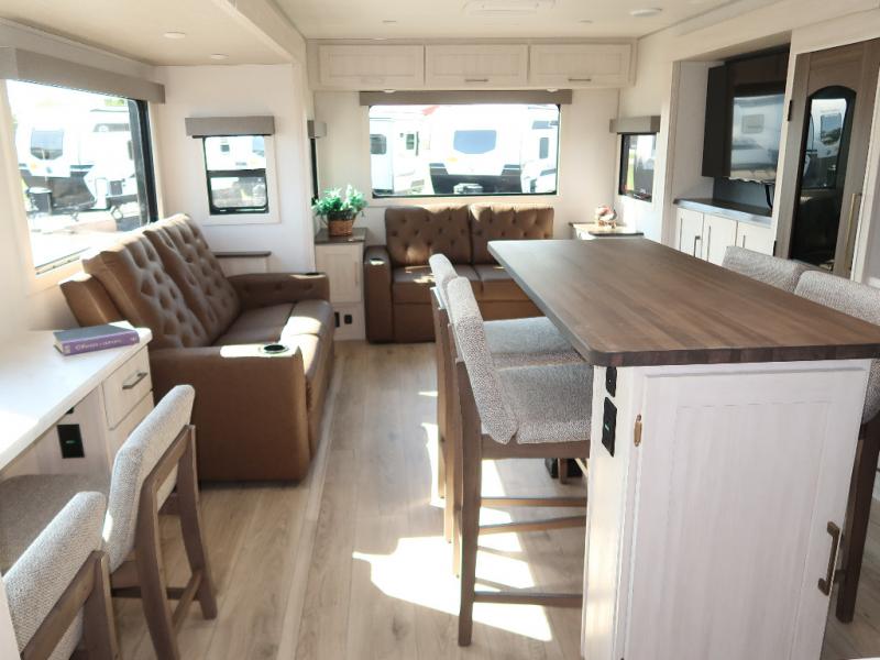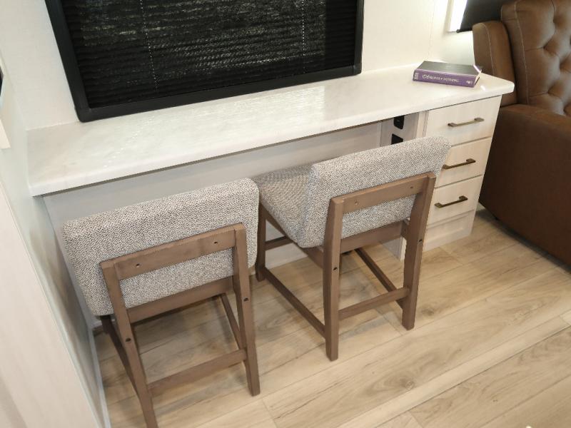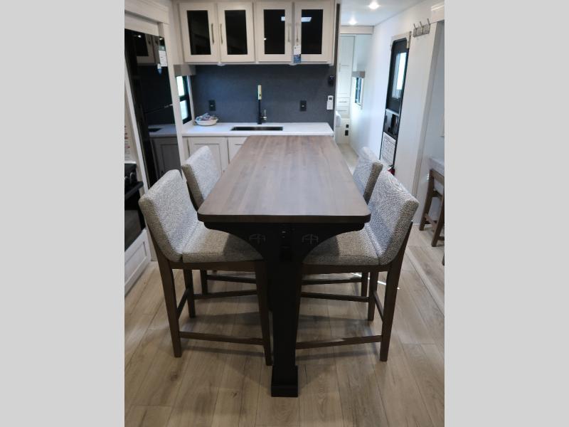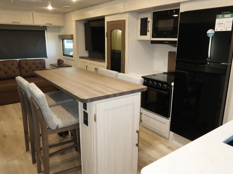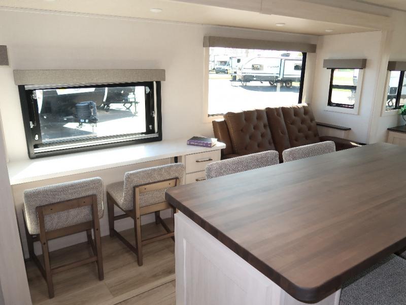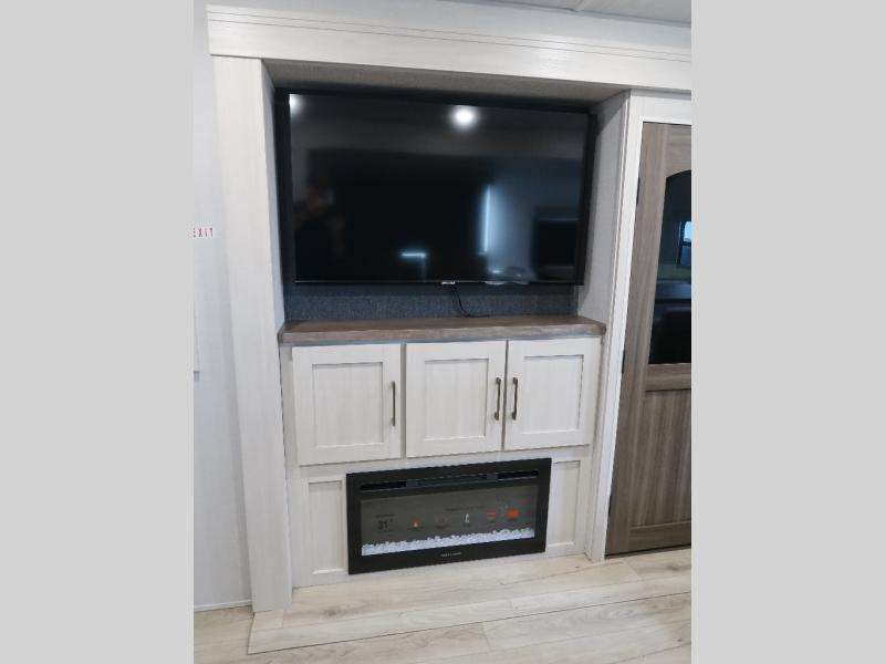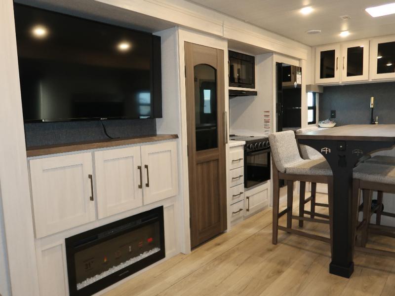 If comfort is what you're looking for, you won't have to search far with this travel trailer! There are dual opposing slides in the main living area for maximum space. The kitchen that flows from the living room area features a high-top dinette that gives a more residential feel to this space, plus there is a pantry, overhead storage, a 10 cu. ft. 12V black glass refrigerator, and more kitchen features you are sure to love. The rear living area includes an EZ-out sofa bed to provide sleeping space for two overnight guests, and there is a theater seat across from the fireplace and HD TV. You'll also enjoy a refreshing drink at the bar top that can also function as a desk! When it's time to call it a night, you can clean up in the spacious full bath, then head to the front bedroom. There is a custom king bed here along with two wardrobes and overhead storage that makes organizing easy!