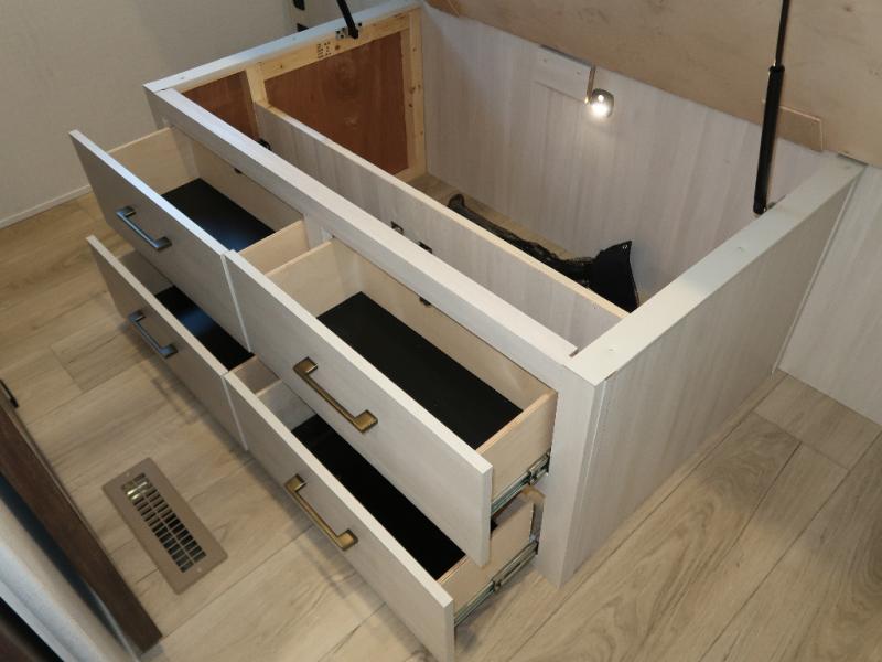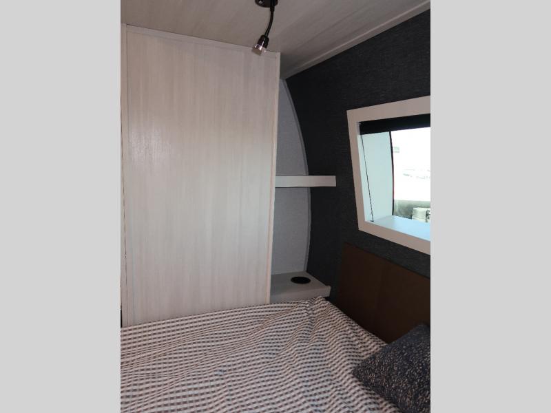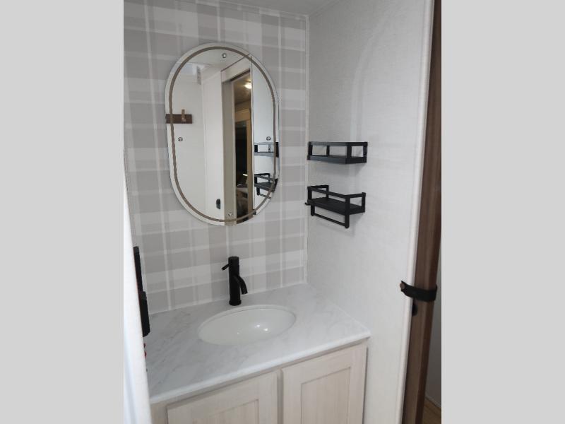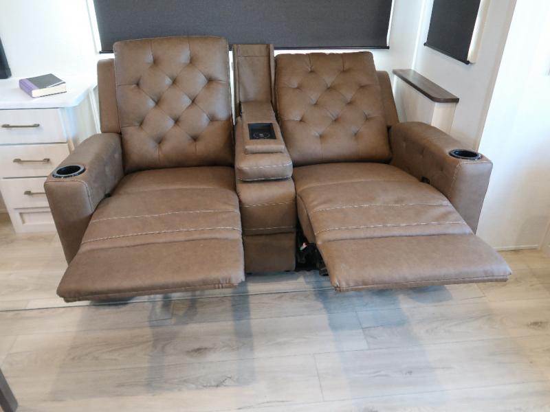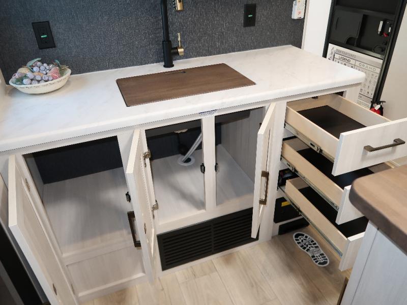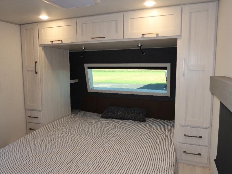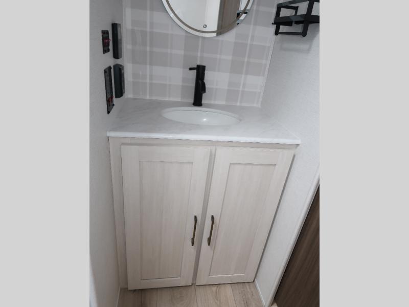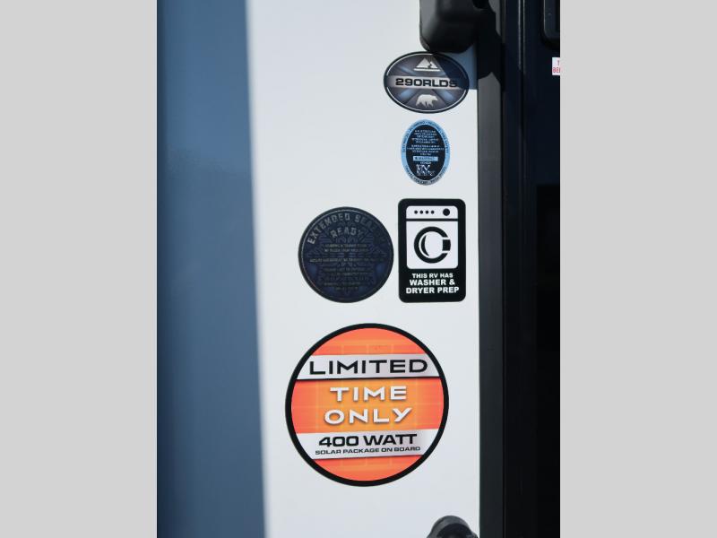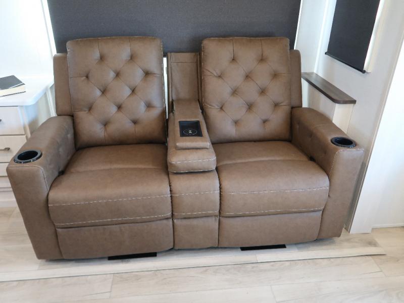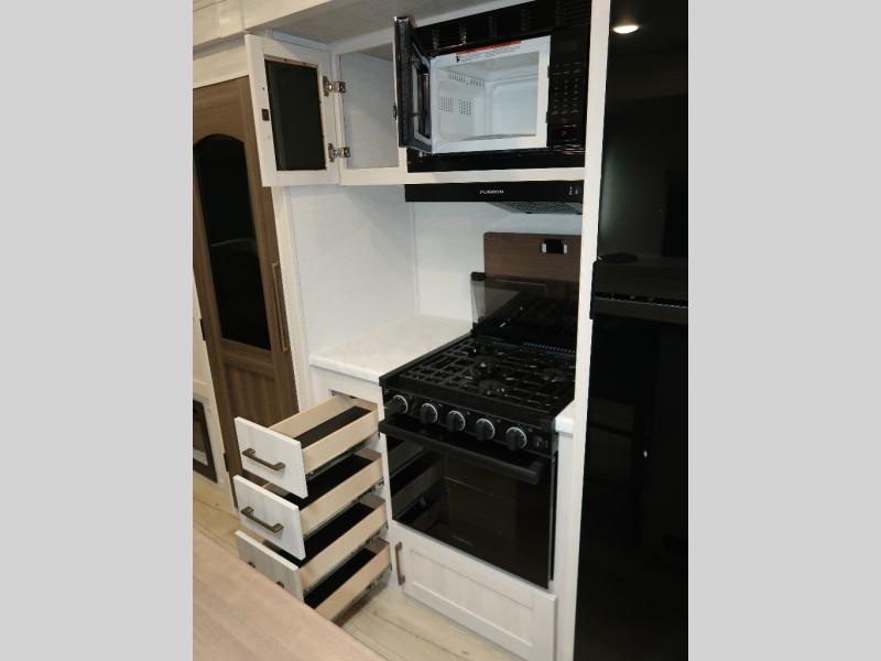If comfort is what you're looking for, you won't have to search far with this travel trailer! There are dual opposing slides in the main living area for maximum space. The kitchen that flows from the living room area features a high-top dinette that gives a more residential feel to this space, plus there is a pantry, overhead storage, a 10 cu. ft. 12V black glass refrigerator, and more kitchen features you are sure to love. The rear living area includes an EZ-out sofa bed to provide sleeping space for two overnight guests, and there is a theater seat across from the fireplace and HD TV. You'll also enjoy a refreshing drink at the bar top that can also function as a desk! When it's time to call it a night, you can clean up in the spacious full bath, then head to the front bedroom. There is a custom king bed here along with two wardrobes and overhead storage that makes organizing easy!