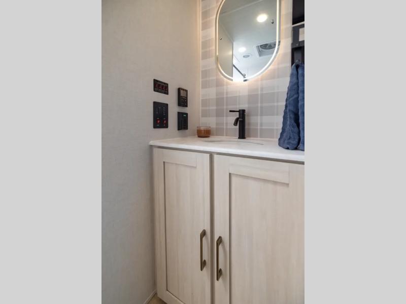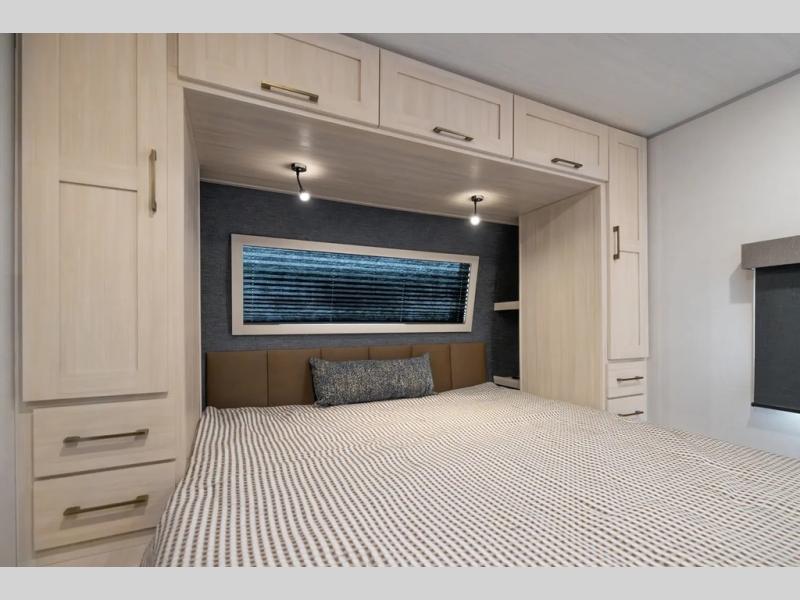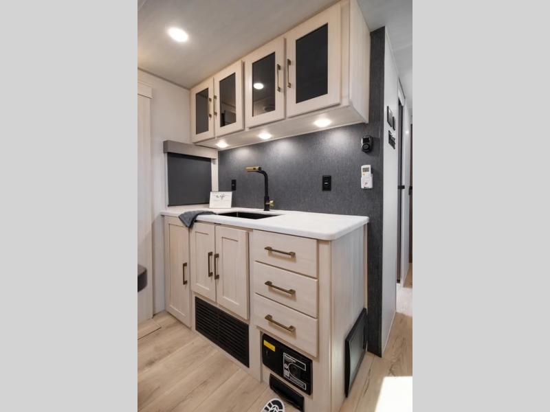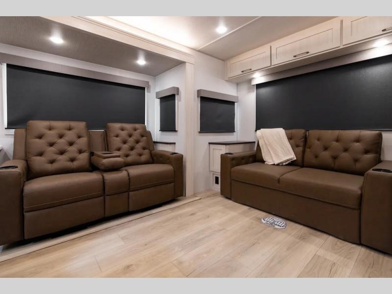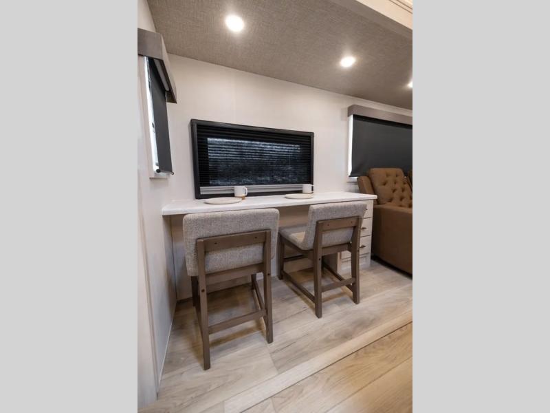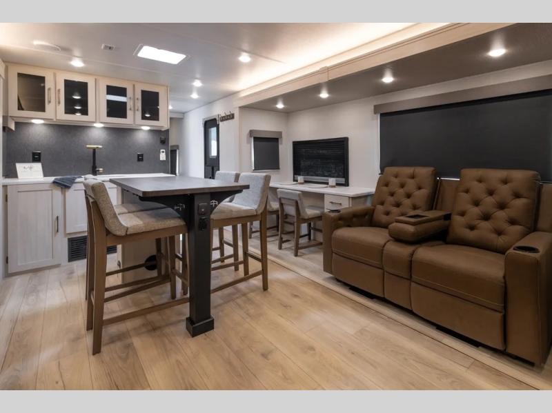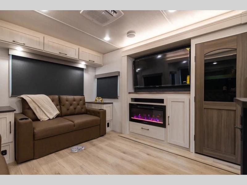If comfort is what you're looking for, you won't have to search far with this travel trailer! There are dual opposing slides in the main living area for maximum space. The kitchen that flows from the living room area features a high-top dinette that gives a more residential feel to this space, plus there is a pantry, overhead storage, a 10 cu. ft. 12V black glass refrigerator, and more kitchen features you are sure to love. The rear living area includes an EZ-out sofa bed to provide sleeping space for two overnight guests, and there is a theater seat across from the fireplace and HD TV. You'll also enjoy a refreshing drink at the bar top that can also function as a desk! When it's time to call it a night, you can clean up in the spacious full bath, then head to the front bedroom. There is a custom king bed here along with two wardrobes and overhead storage that makes organizing easy!