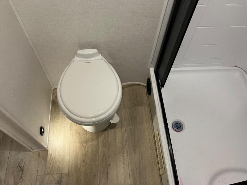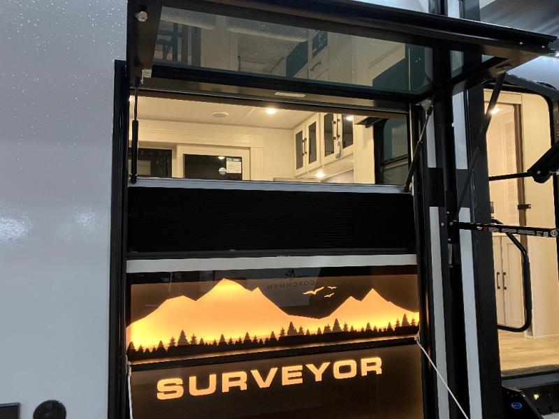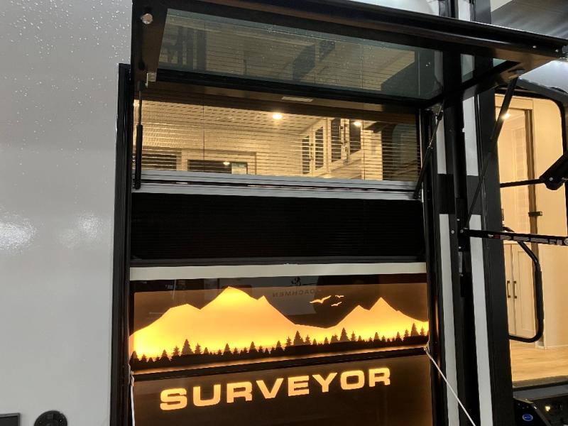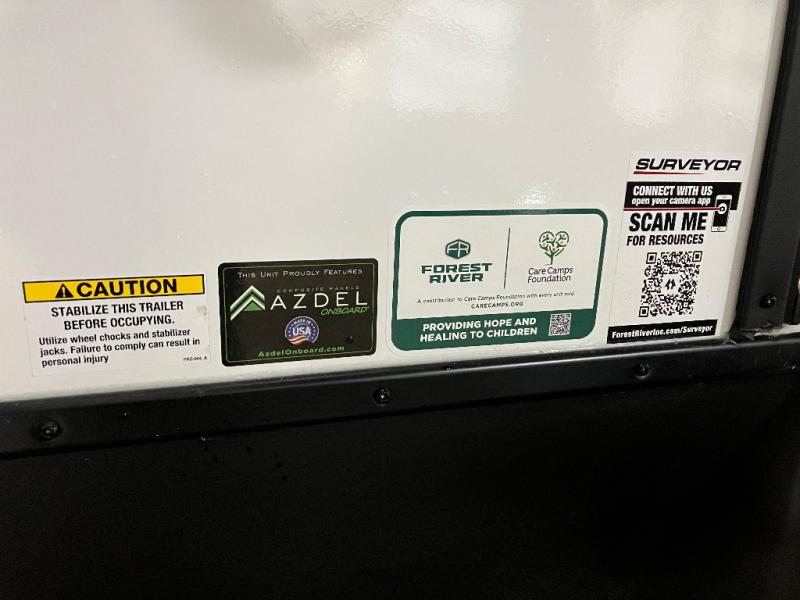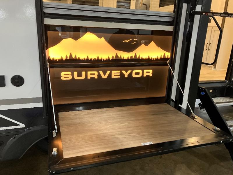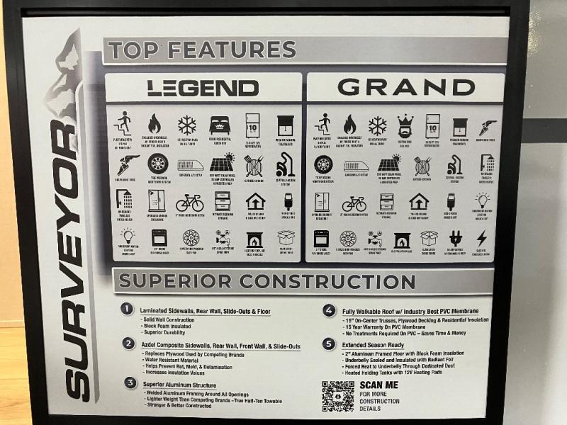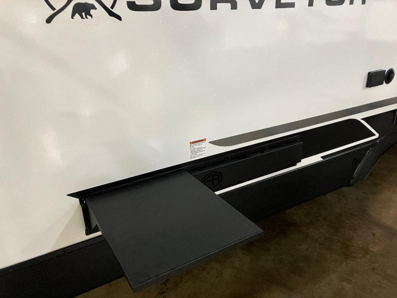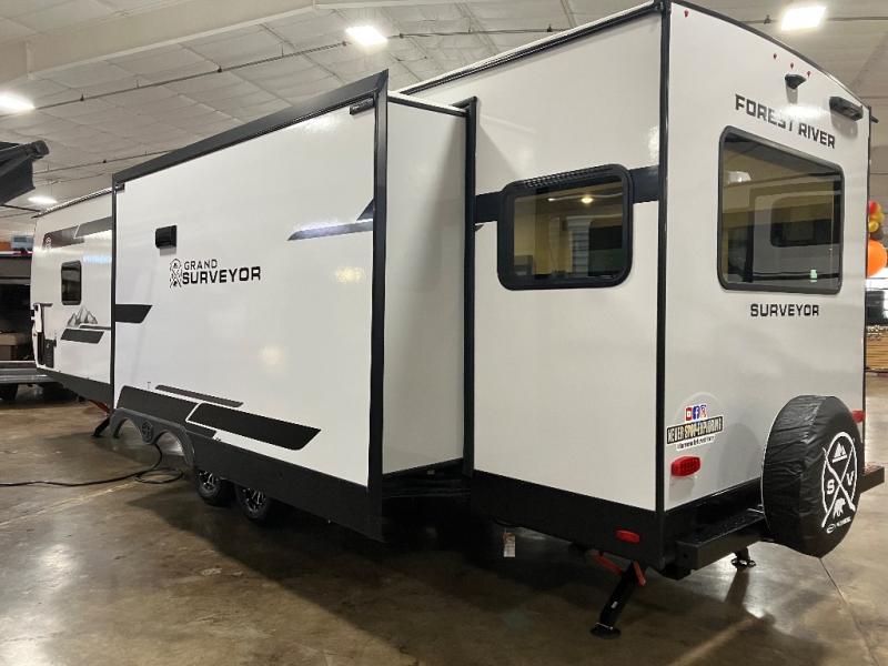 With any Grand Surveyor travel trailer by Forest River you will enjoy turn-key ready-to-go features and quality construction! Each model includes Azdel composite walls and a gel coated fiberglass front cap with an automotive style tinted windshield for a sleek look. There are friction hinge black glass entry door(s), an adjustable platform step with a night light, plus Goodyear tires and a power tongue jack for easy towing. The interior will have you feeling right at home with roller shades, residential faucets, sinks, and bathroom vanity, plus Surf(x) seamless countertops throughout. You can also plan for adventure with a 2" rear accessory and exterior spray port, and there are slam latch exterior baggage doors throughout to keep all your gear secure. Other stand-out features include a central vacuum system, a 200 watt solar panel with a 30 amp controller, a tankless water heater, carpet-free interiors, and the list goes on!