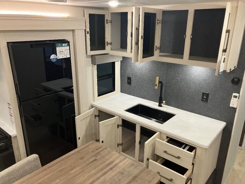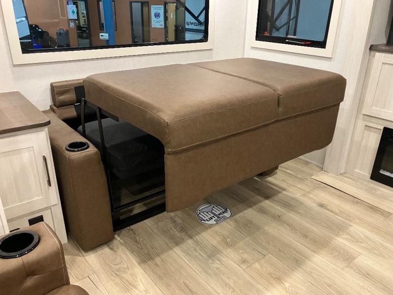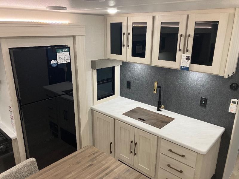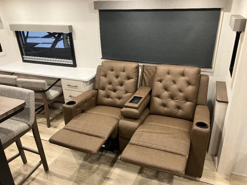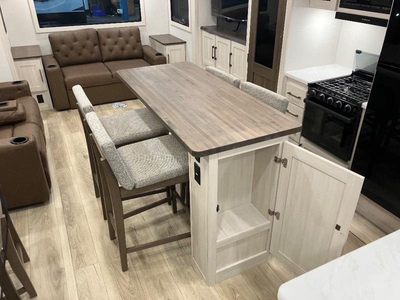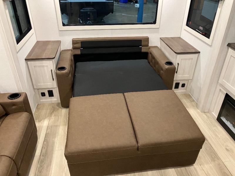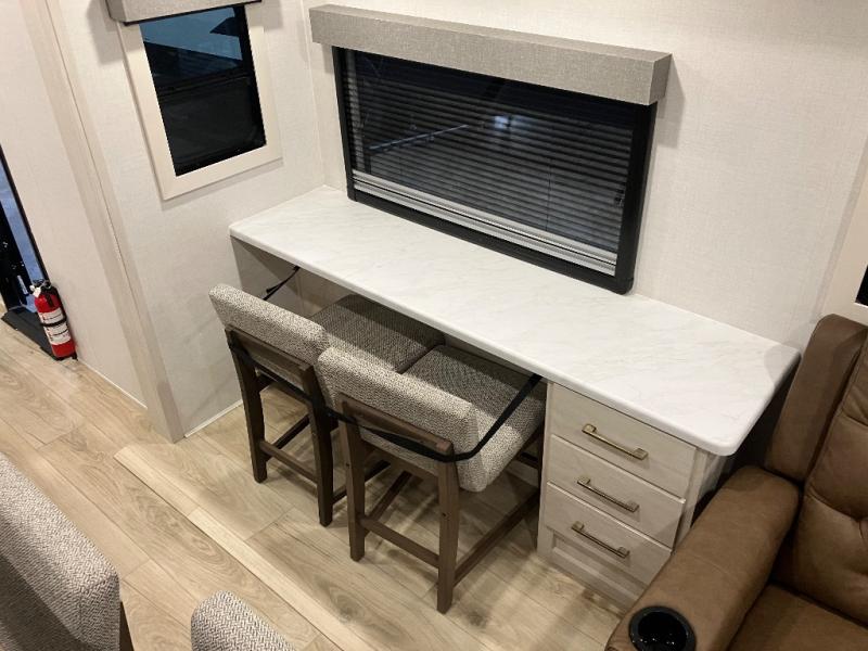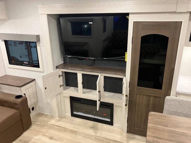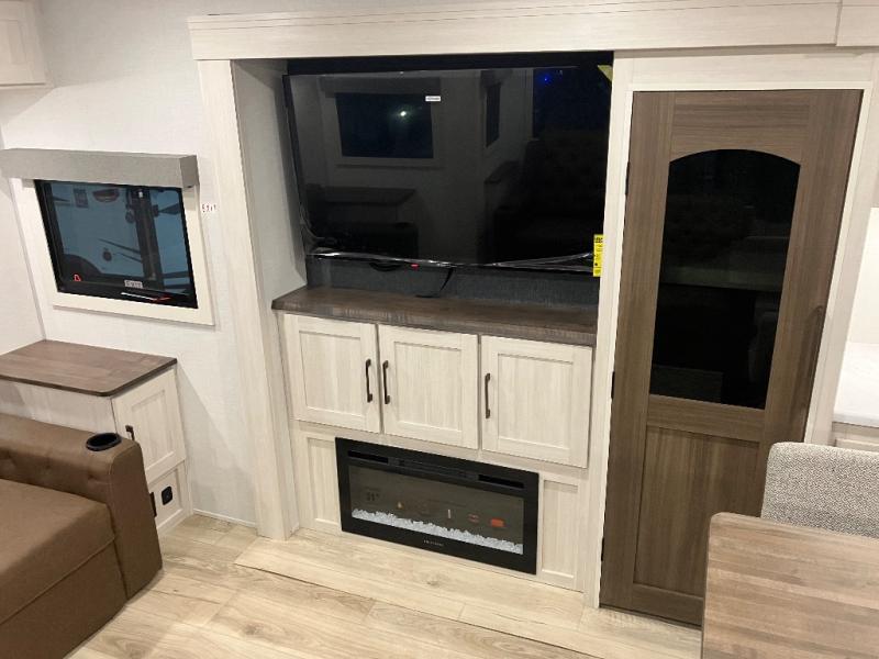 If comfort is what you're looking for, you won't have to search far with this travel trailer! There are dual opposing slides in the main living area for maximum space. The kitchen that flows from the living room area features a high-top dinette that gives a more residential feel to this space, plus there is a pantry, overhead storage, a 10 cu. ft. 12V black glass refrigerator, and more kitchen features you are sure to love. The rear living area includes an EZ-out sofa bed to provide sleeping space for two overnight guests, and there is a theater seat across from the fireplace and HD TV. You'll also enjoy a refreshing drink at the bar top that can also function as a desk! When it's time to call it a night, you can clean up in the spacious full bath, then head to the front bedroom. There is a custom king bed here along with two wardrobes and overhead storage that makes organizing easy!