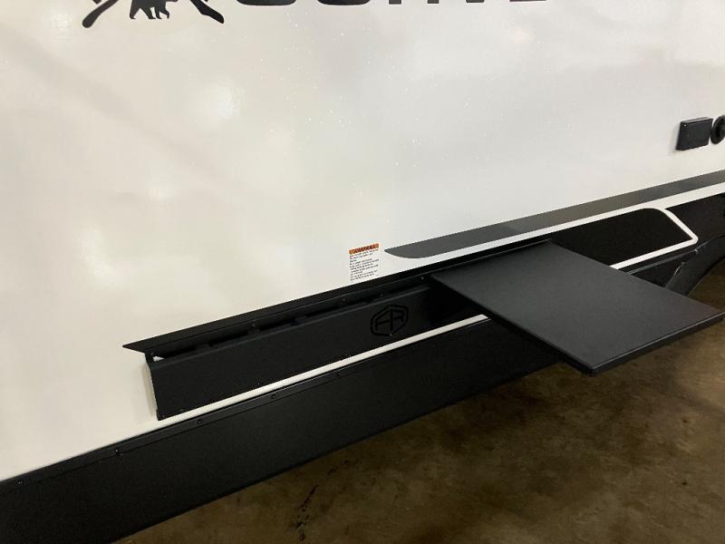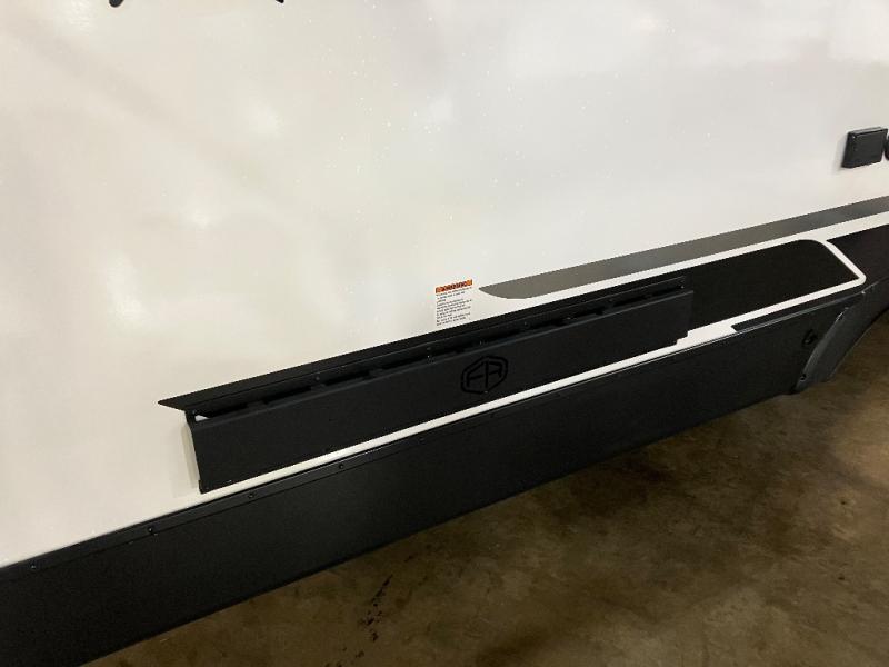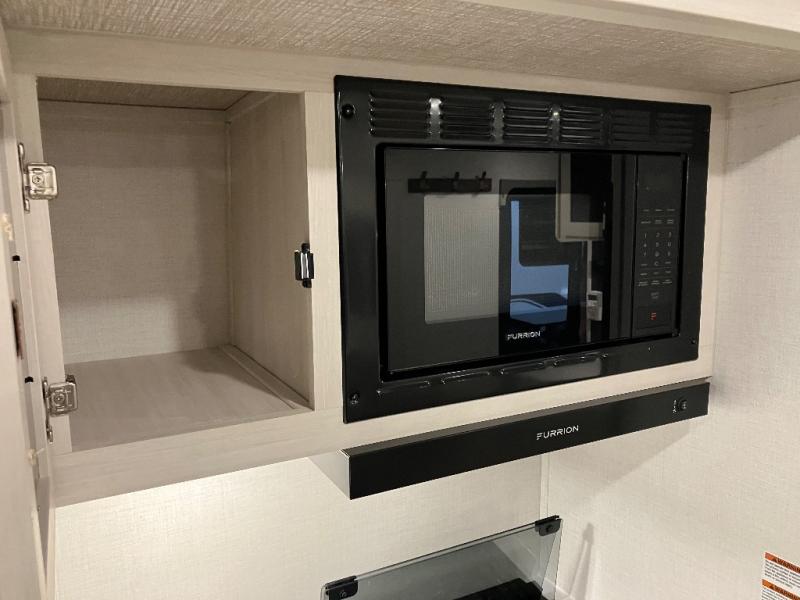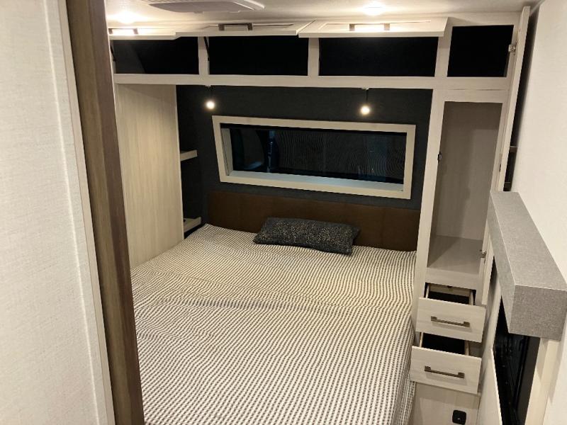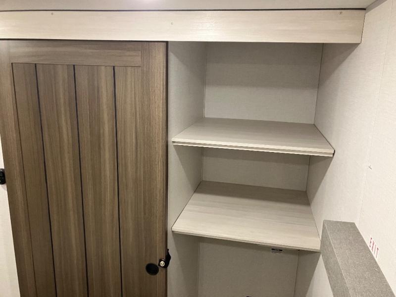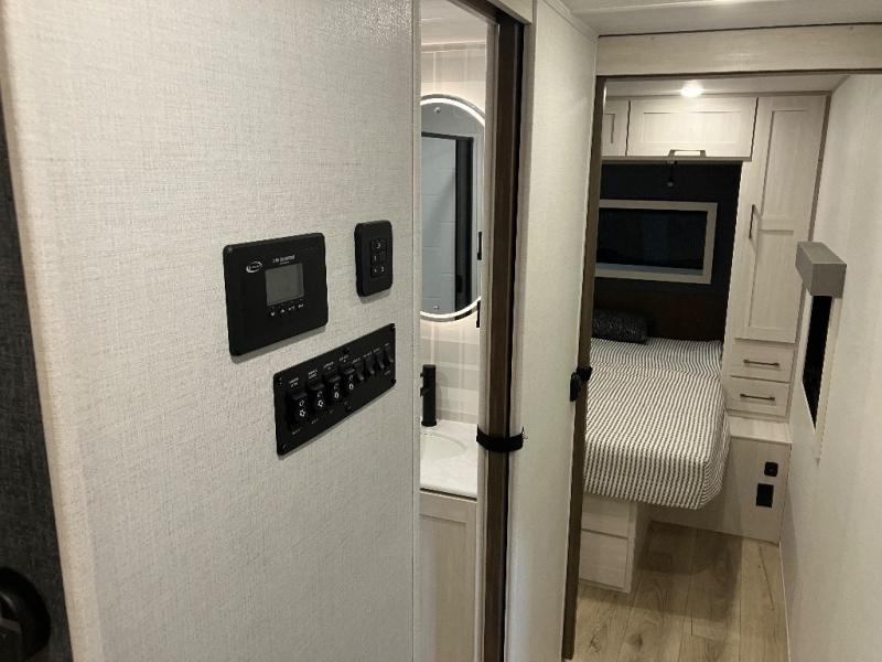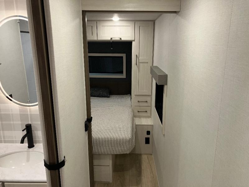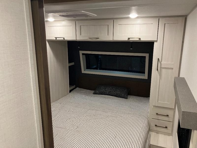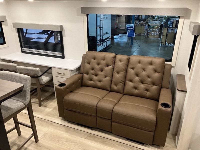 If comfort is what you're looking for, you won't have to search far with this travel trailer! There are dual opposing slides in the main living area for maximum space. The kitchen that flows from the living room area features a high-top dinette that gives a more residential feel to this space, plus there is a pantry, overhead storage, a 10 cu. ft. 12V black glass refrigerator, and more kitchen features you are sure to love. The rear living area includes an EZ-out sofa bed to provide sleeping space for two overnight guests, and there is a theater seat across from the fireplace and HD TV. You'll also enjoy a refreshing drink at the bar top that can also function as a desk! When it's time to call it a night, you can clean up in the spacious full bath, then head to the front bedroom. There is a custom king bed here along with two wardrobes and overhead storage that makes organizing easy!