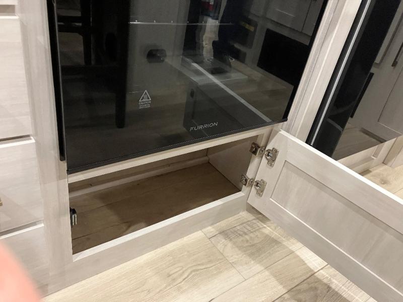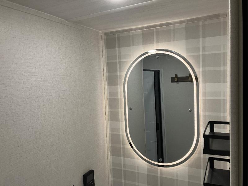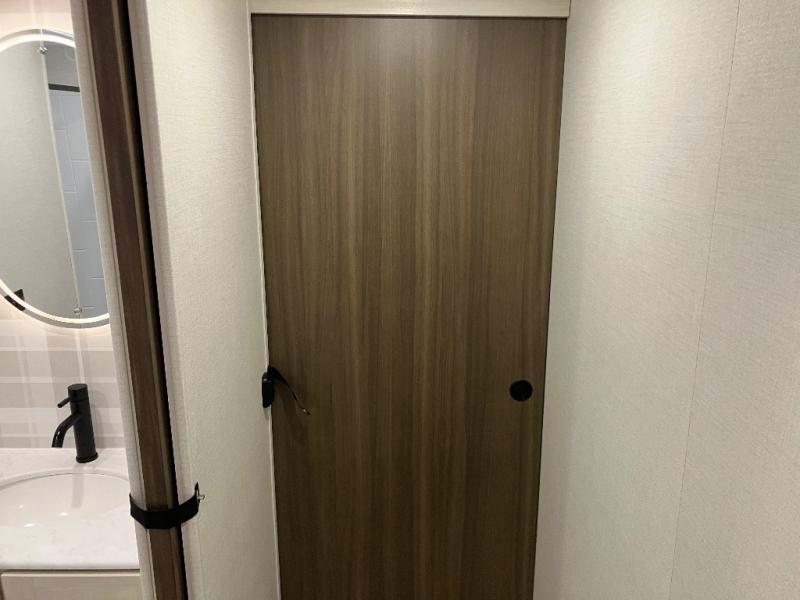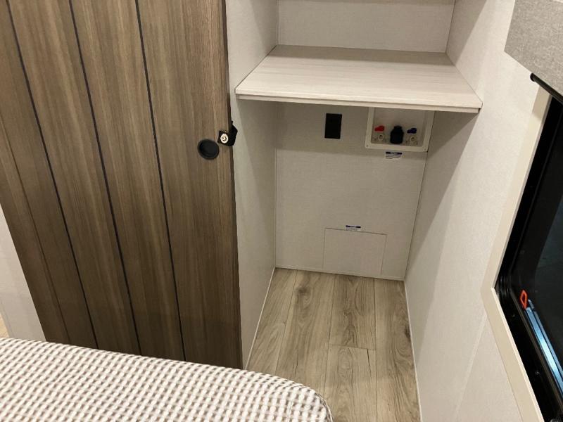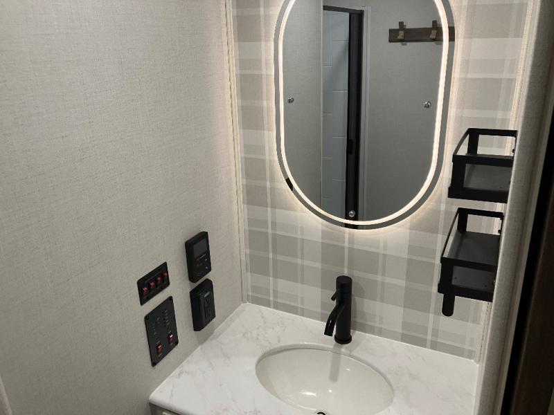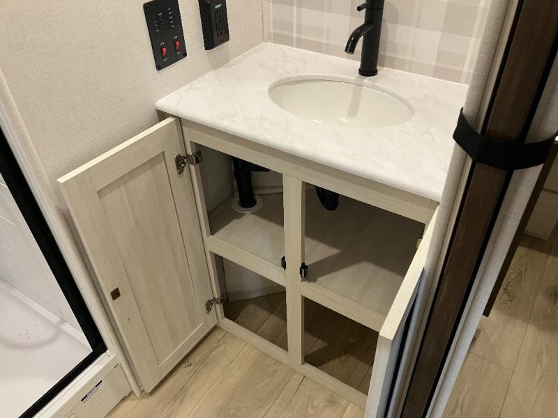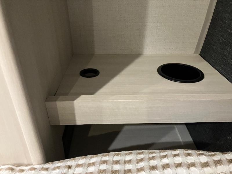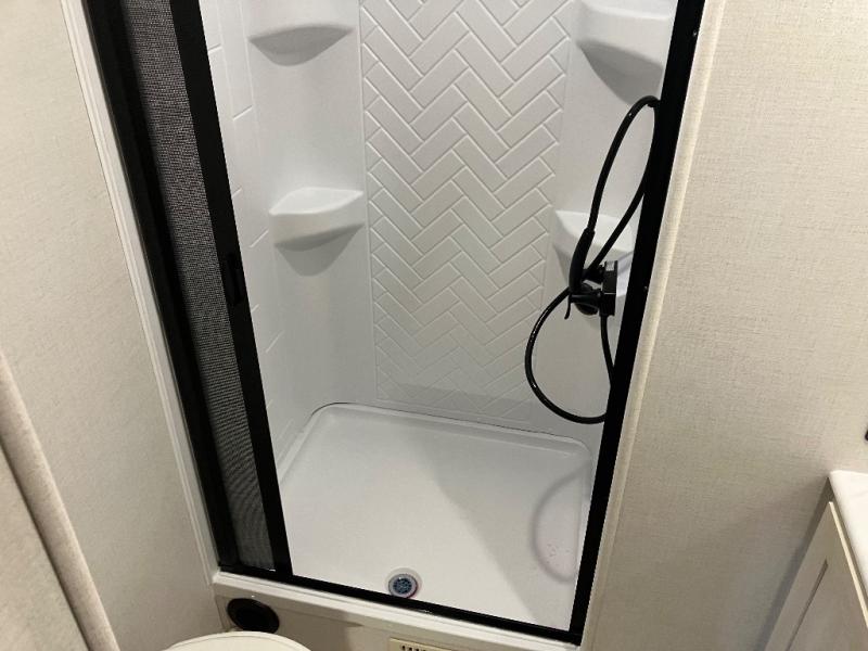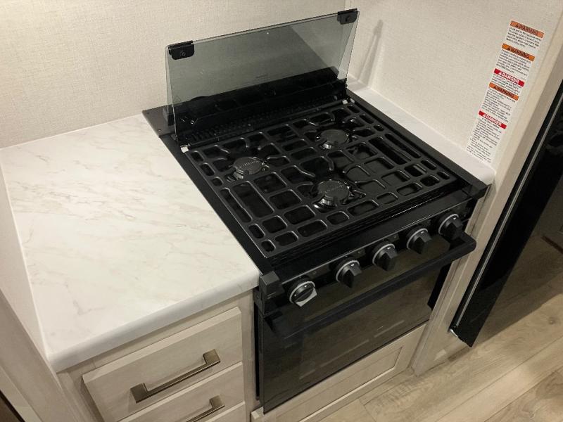 If comfort is what you're looking for, you won't have to search far with this travel trailer! There are dual opposing slides in the main living area for maximum space. The kitchen that flows from the living room area features a high-top dinette that gives a more residential feel to this space, plus there is a pantry, overhead storage, a 10 cu. ft. 12V black glass refrigerator, and more kitchen features you are sure to love. The rear living area includes an EZ-out sofa bed to provide sleeping space for two overnight guests, and there is a theater seat across from the fireplace and HD TV. You'll also enjoy a refreshing drink at the bar top that can also function as a desk! When it's time to call it a night, you can clean up in the spacious full bath, then head to the front bedroom. There is a custom king bed here along with two wardrobes and overhead storage that makes organizing easy!