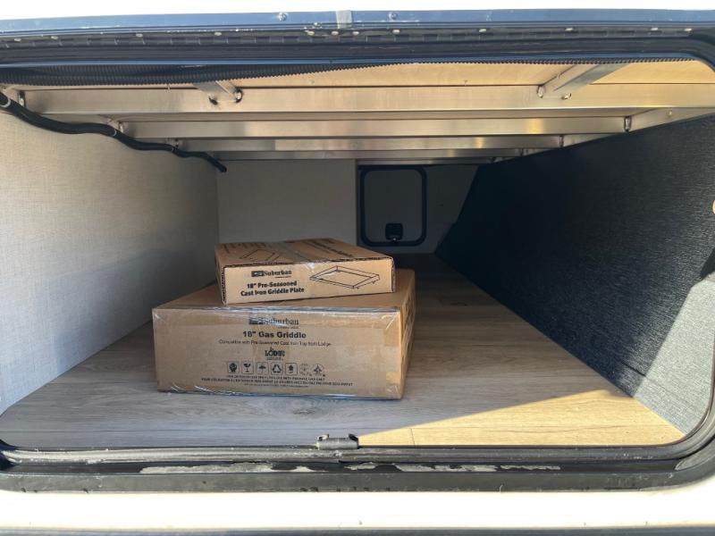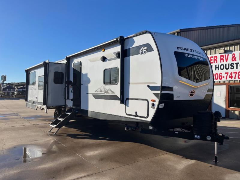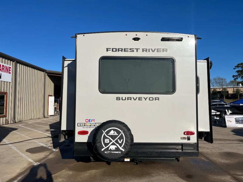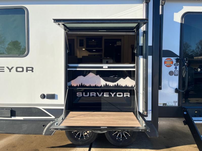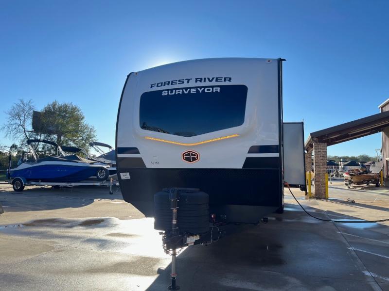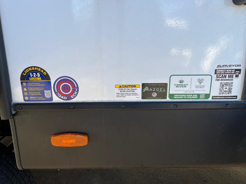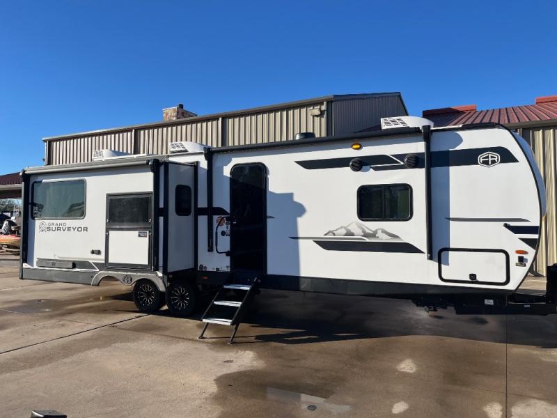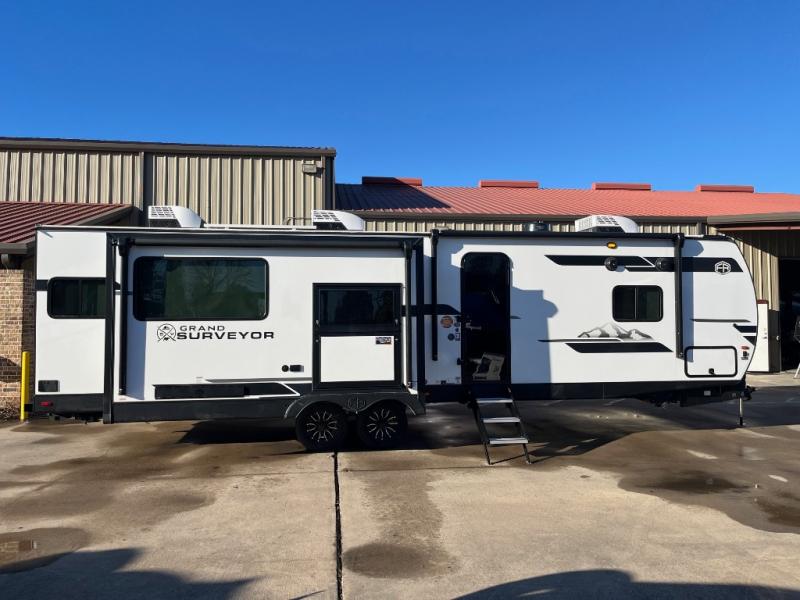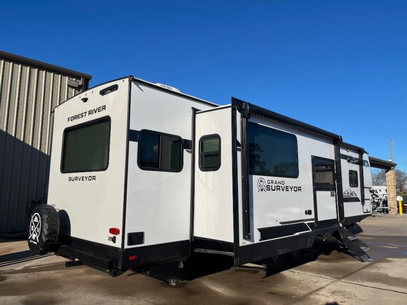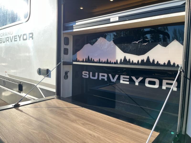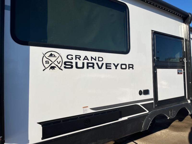 With any Grand Surveyor travel trailer by Forest River you will enjoy turn-key ready-to-go features and quality construction! Each model includes Azdel composite walls and a gel coated fiberglass front cap with an automotive style tinted windshield for a sleek look. There are friction hinge black glass entry door(s), an adjustable platform step with a night light, plus Goodyear tires and a power tongue jack for easy towing. The interior will have you feeling right at home with roller shades, residential faucets, sinks, and bathroom vanity, plus Surf(x) seamless countertops throughout. You can also plan for adventure with a 2" rear accessory and exterior spray port, and there are slam latch exterior baggage doors throughout to keep all your gear secure. Other stand-out features include a central vacuum system, a 200 watt solar panel with a 30 amp controller, a tankless water heater, carpet-free interiors, and the list goes on!