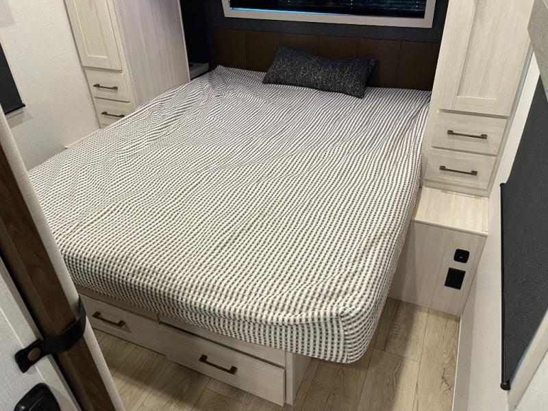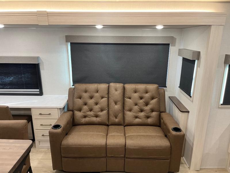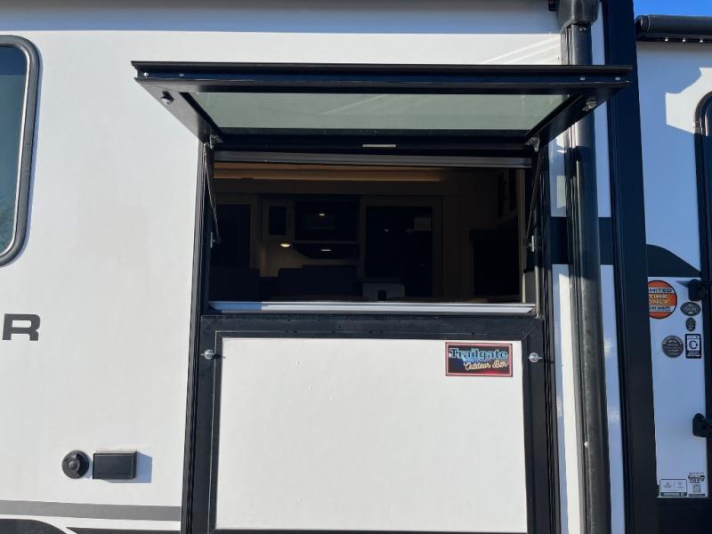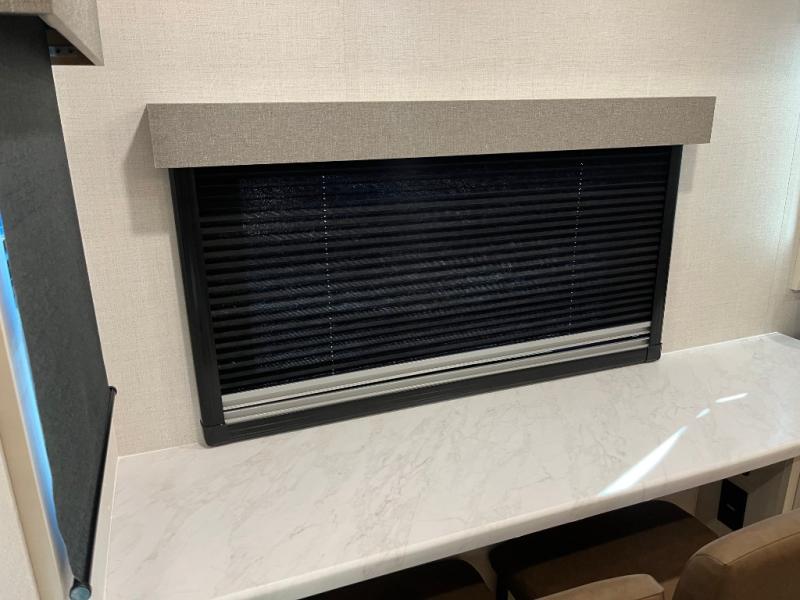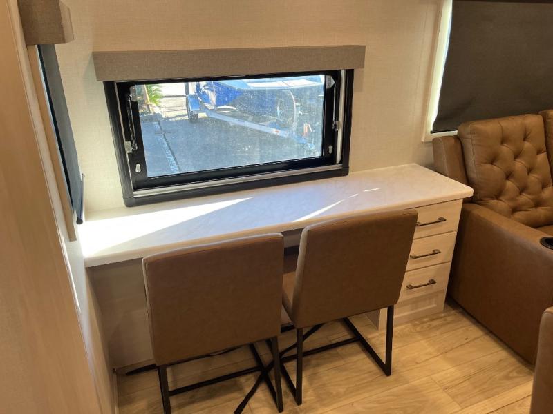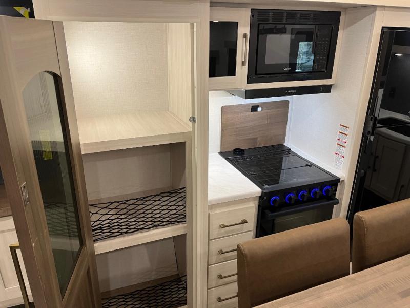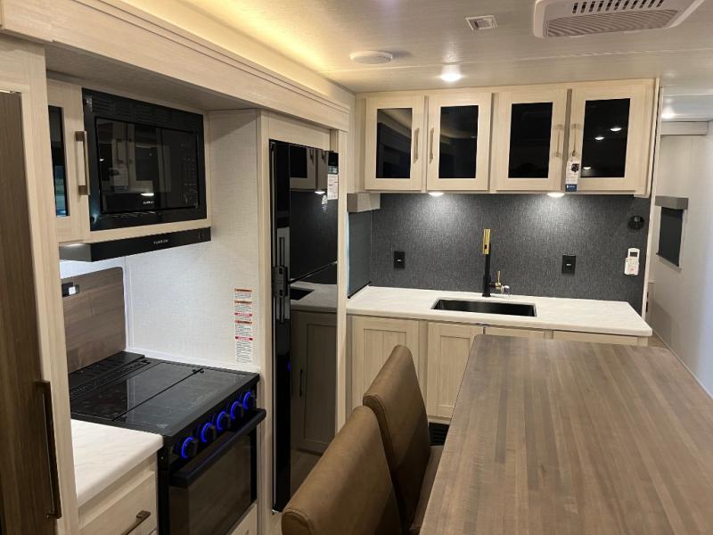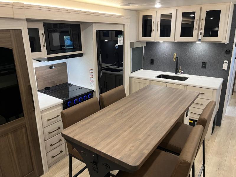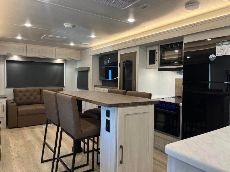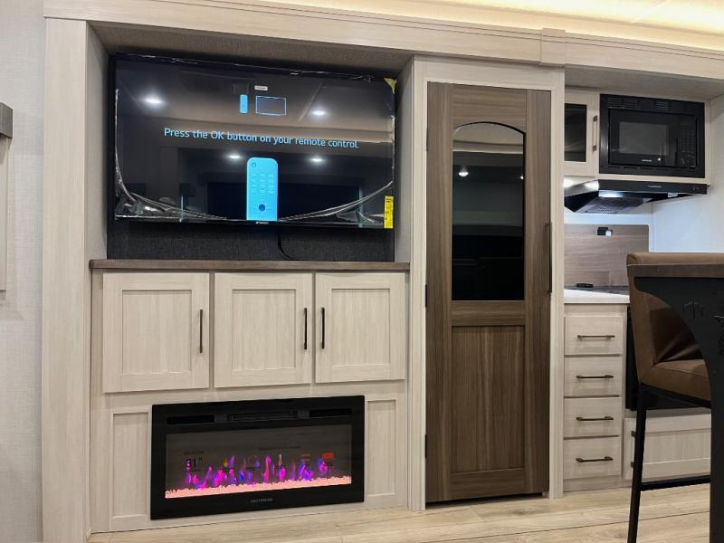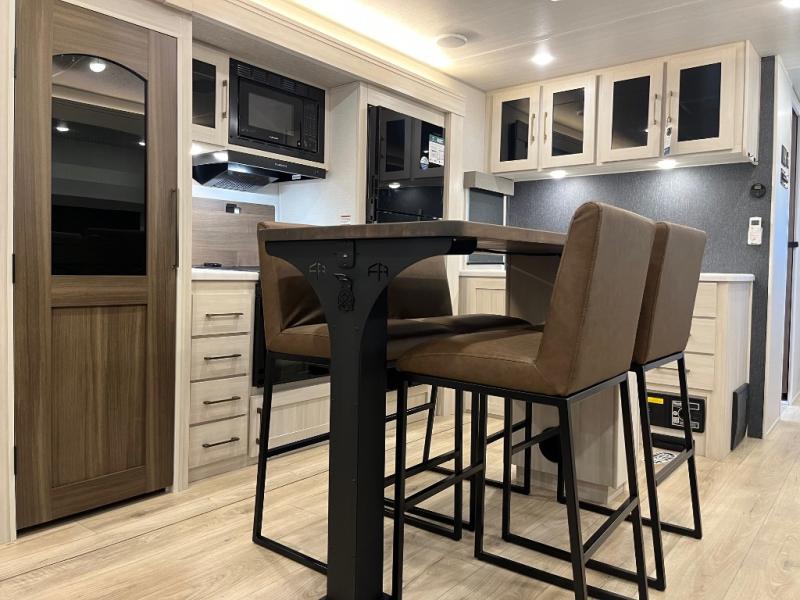 If comfort is what you're looking for, you won't have to search far with this travel trailer! There are dual opposing slides in the main living area for maximum space. The kitchen that flows from the living room area features a high-top dinette that gives a more residential feel to this space, plus there is a pantry, overhead storage, a 10 cu. ft. 12V black glass refrigerator, and more kitchen features you are sure to love. The rear living area includes an EZ-out sofa bed to provide sleeping space for two overnight guests, and there is a theater seat across from the fireplace and HD TV. You'll also enjoy a refreshing drink at the bar top that can also function as a desk! When it's time to call it a night, you can clean up in the spacious full bath, then head to the front bedroom. There is a custom king bed here along with two wardrobes and overhead storage that makes organizing easy!