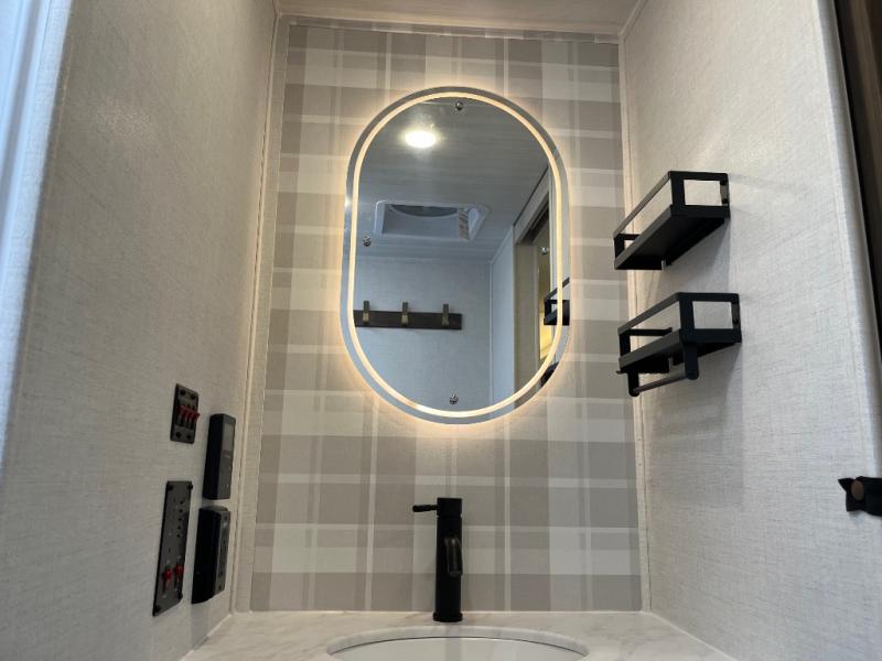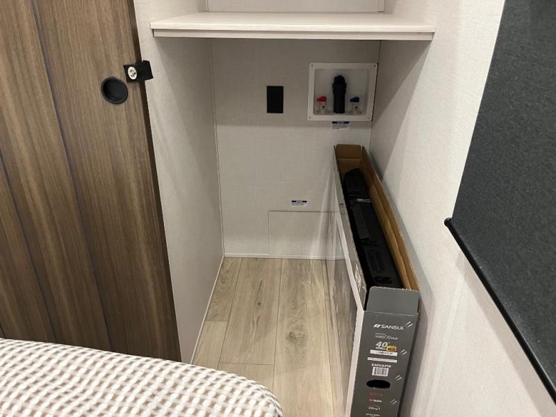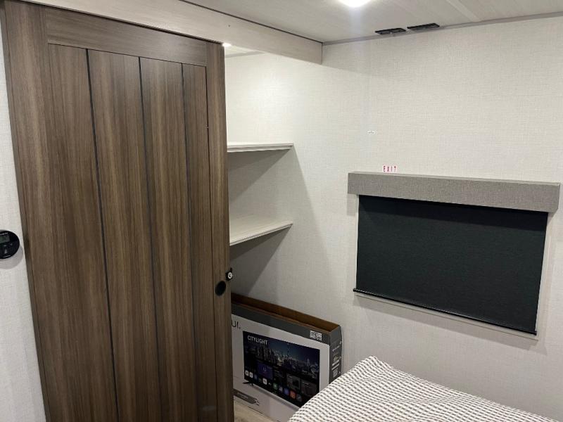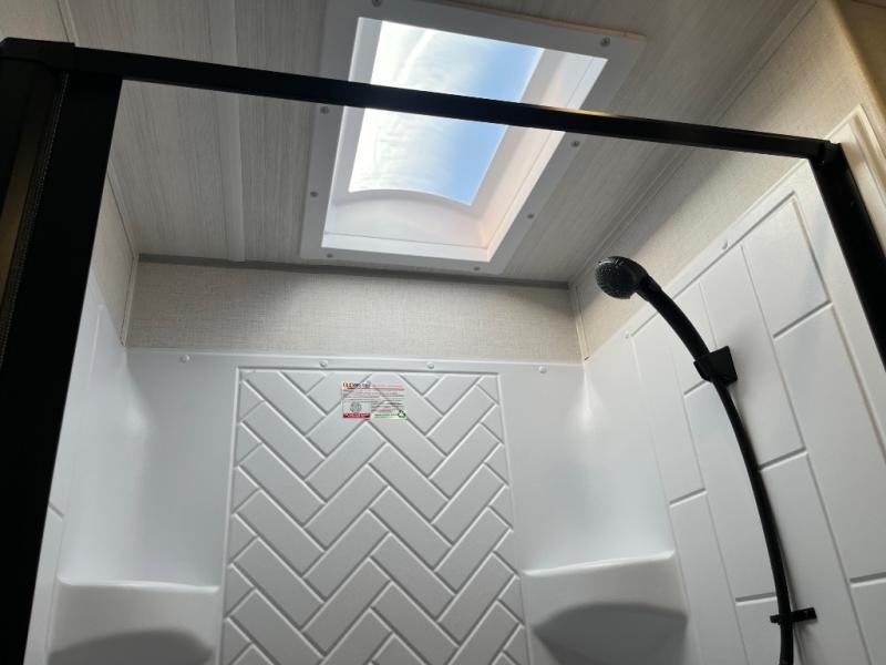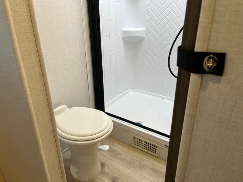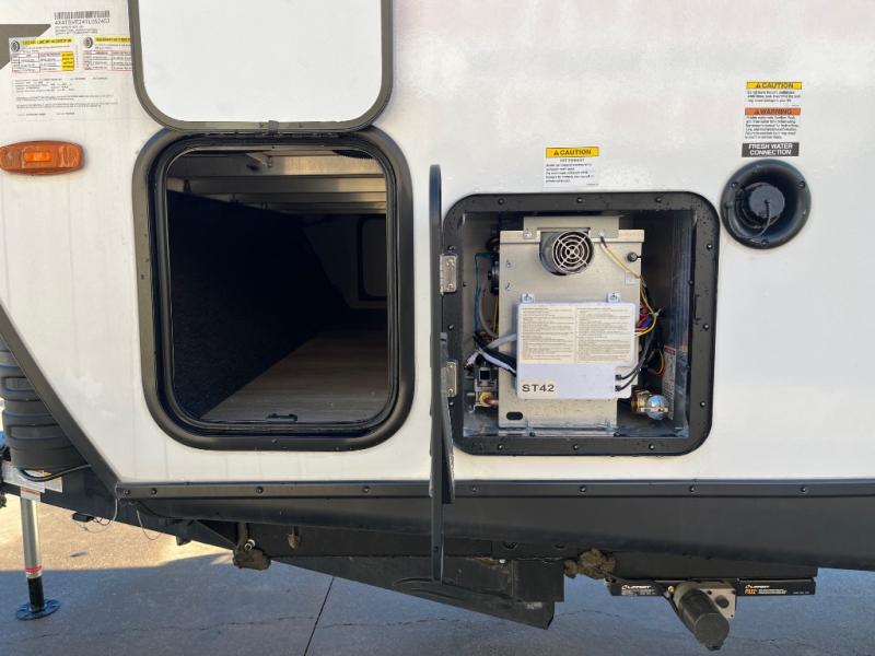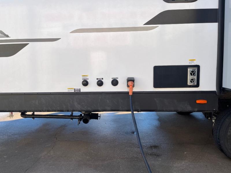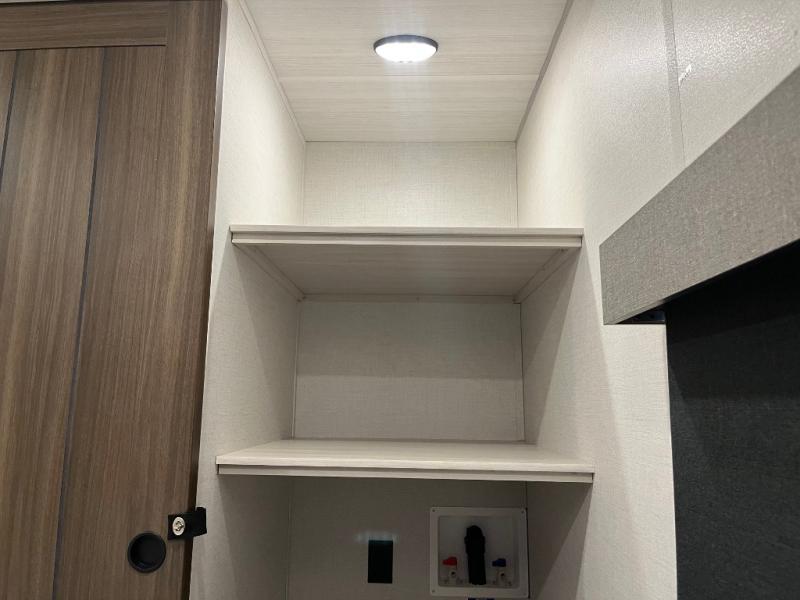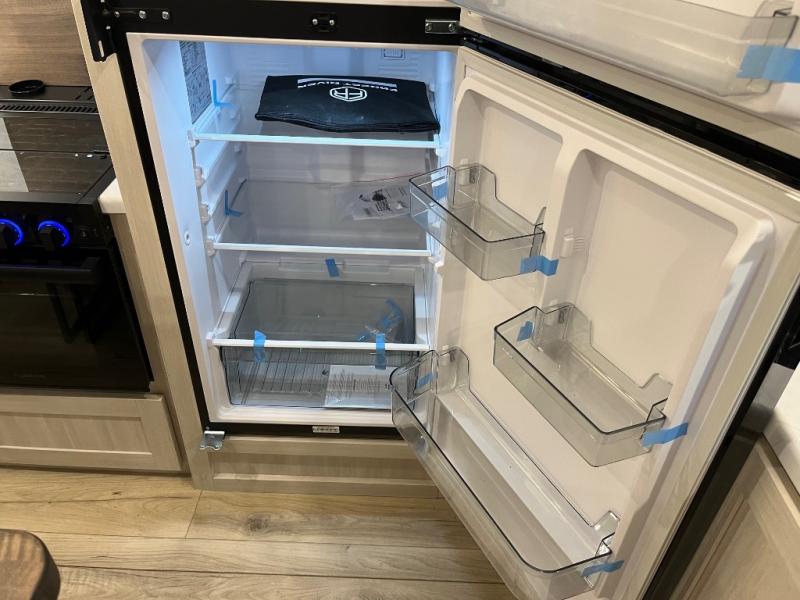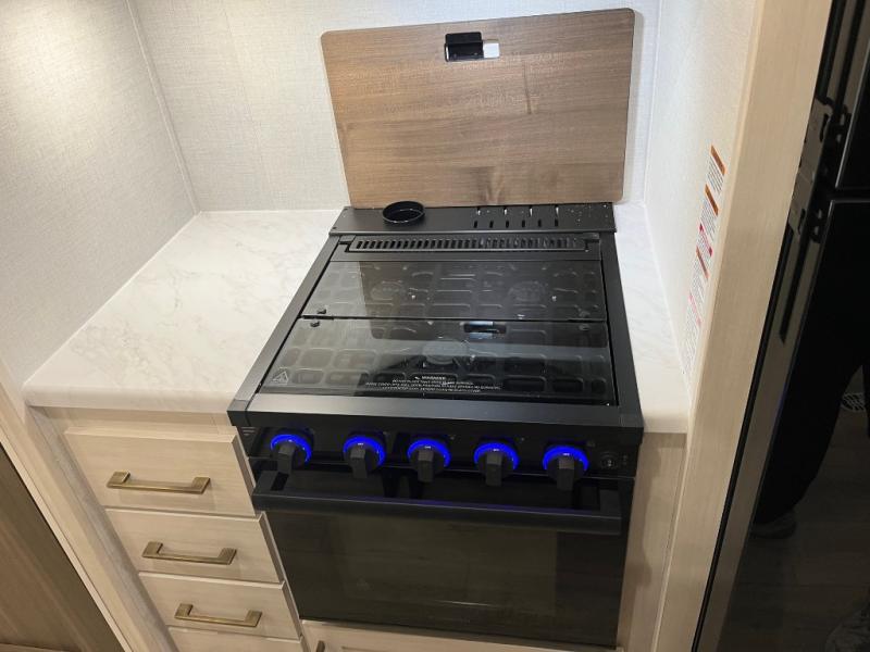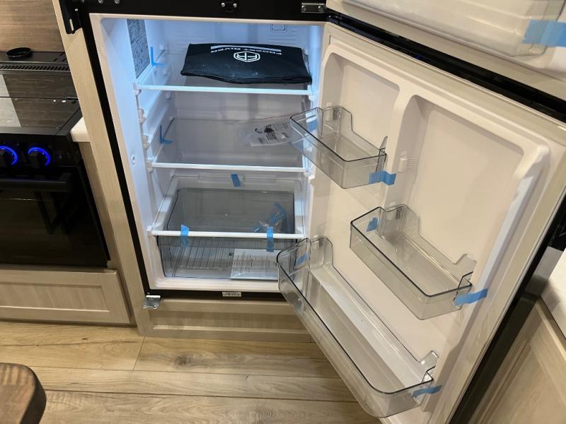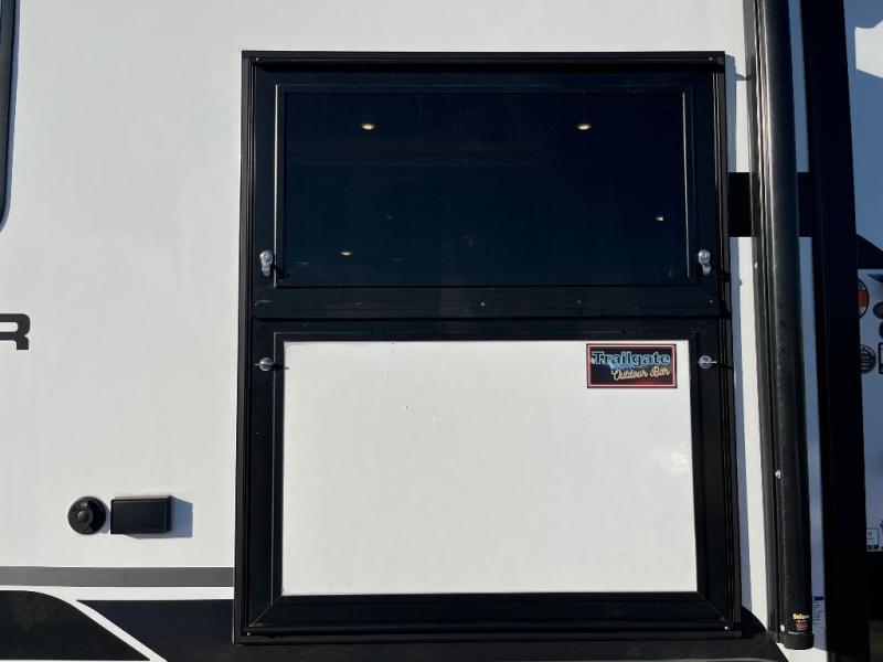 If comfort is what you're looking for, you won't have to search far with this travel trailer! There are dual opposing slides in the main living area for maximum space. The kitchen that flows from the living room area features a high-top dinette that gives a more residential feel to this space, plus there is a pantry, overhead storage, a 10 cu. ft. 12V black glass refrigerator, and more kitchen features you are sure to love. The rear living area includes an EZ-out sofa bed to provide sleeping space for two overnight guests, and there is a theater seat across from the fireplace and HD TV. You'll also enjoy a refreshing drink at the bar top that can also function as a desk! When it's time to call it a night, you can clean up in the spacious full bath, then head to the front bedroom. There is a custom king bed here along with two wardrobes and overhead storage that makes organizing easy!