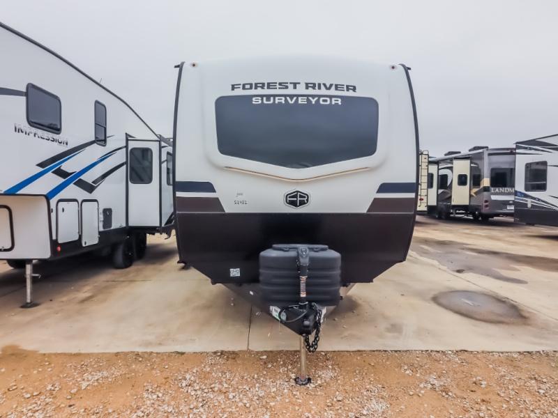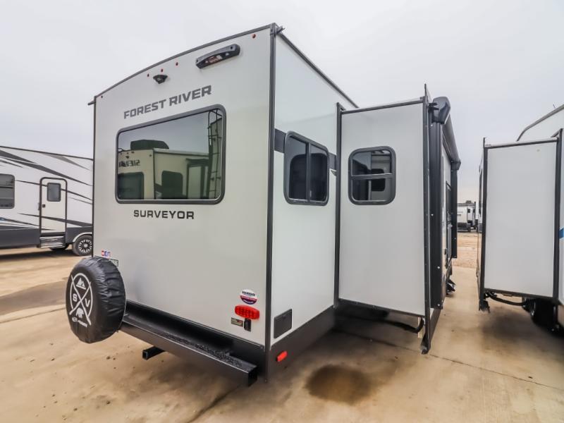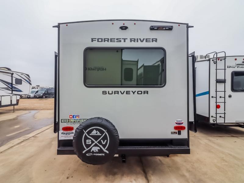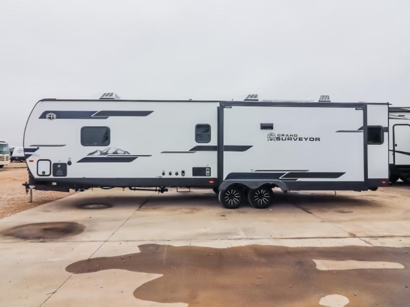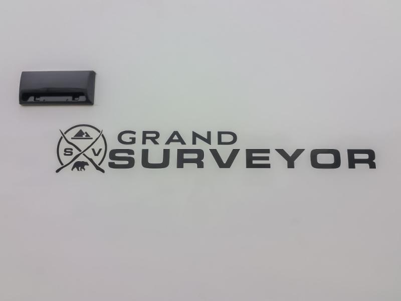 With any Grand Surveyor travel trailer by Forest River you will enjoy turn-key ready-to-go features and quality construction! Each model includes Azdel composite walls and a gel coated fiberglass front cap with an automotive style tinted windshield for a sleek look. There are friction hinge black glass entry door(s), an adjustable platform step with a night light, plus Goodyear tires and a power tongue jack for easy towing. The interior will have you feeling right at home with roller shades, residential faucets, sinks, and bathroom vanity, plus Surf(x) seamless countertops throughout. You can also plan for adventure with a 2" rear accessory and exterior spray port, and there are slam latch exterior baggage doors throughout to keep all your gear secure. Other stand-out features include a central vacuum system, a 200 watt solar panel with a 30 amp controller, a tankless water heater, carpet-free interiors, and the list goes on!