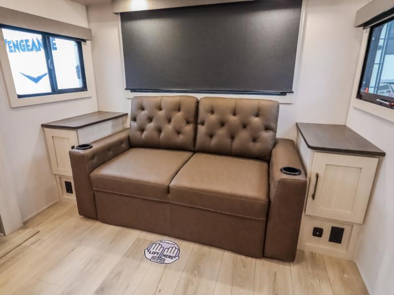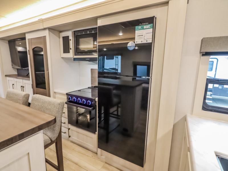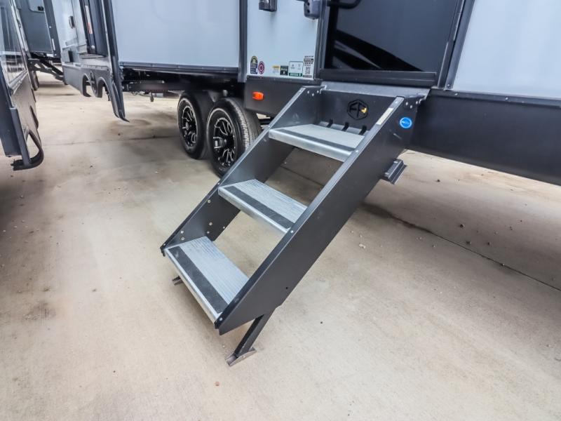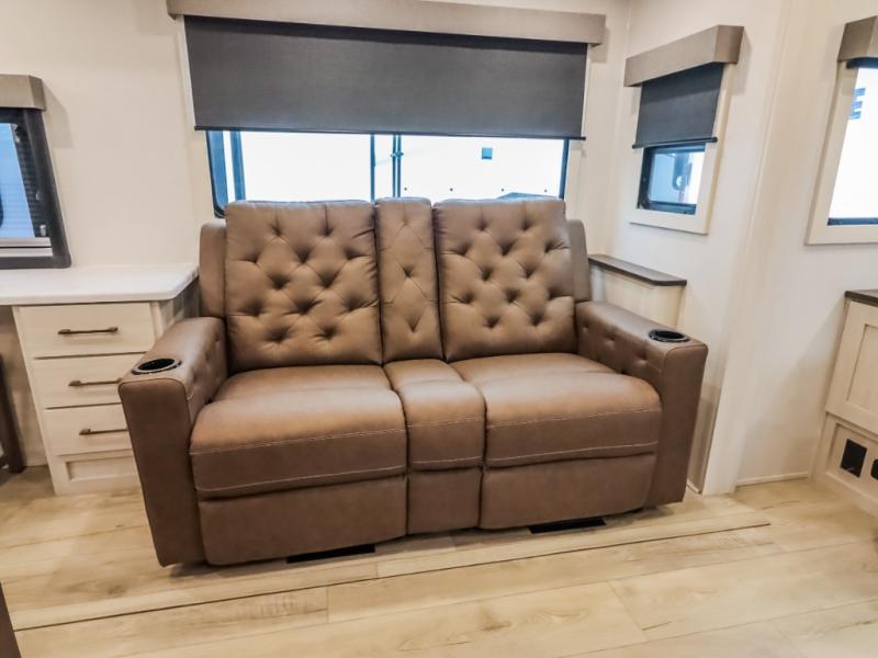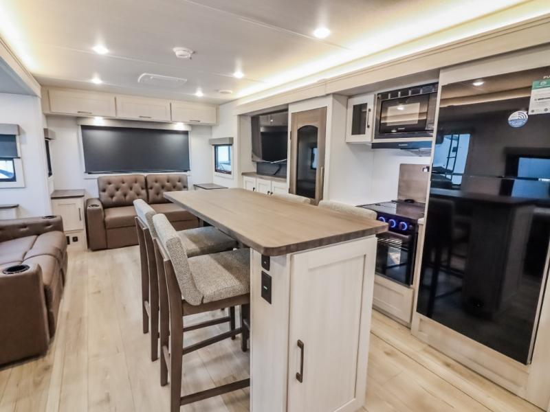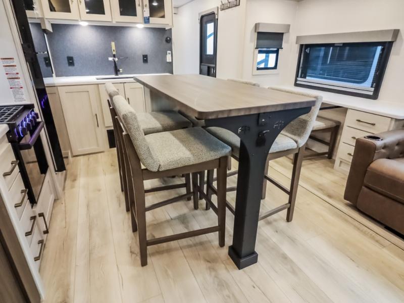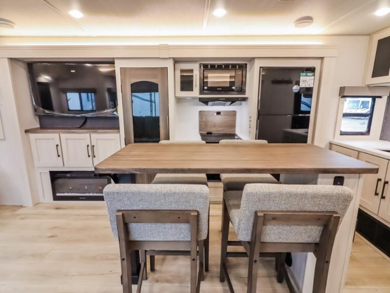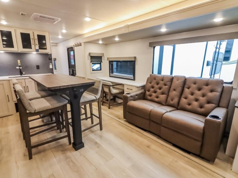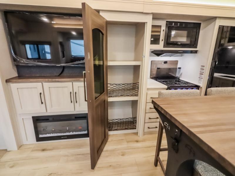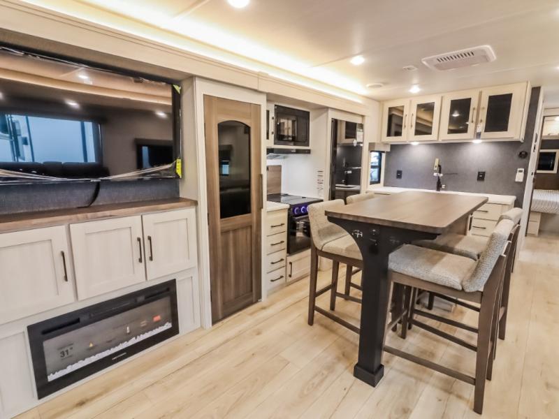 If comfort is what you're looking for, you won't have to search far with this travel trailer! There are dual opposing slides in the main living area for maximum space. The kitchen that flows from the living room area features a high-top dinette that gives a more residential feel to this space, plus there is a pantry, overhead storage, a 10 cu. ft. 12V black glass refrigerator, and more kitchen features you are sure to love. The rear living area includes an EZ-out sofa bed to provide sleeping space for two overnight guests, and there is a theater seat across from the fireplace and HD TV. You'll also enjoy a refreshing drink at the bar top that can also function as a desk! When it's time to call it a night, you can clean up in the spacious full bath, then head to the front bedroom. There is a custom king bed here along with two wardrobes and overhead storage that makes organizing easy!