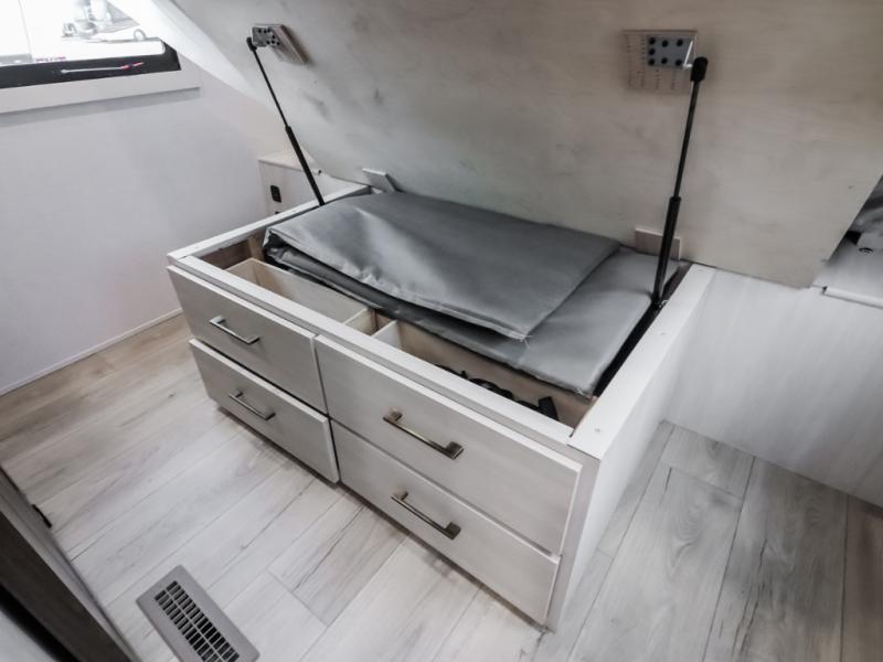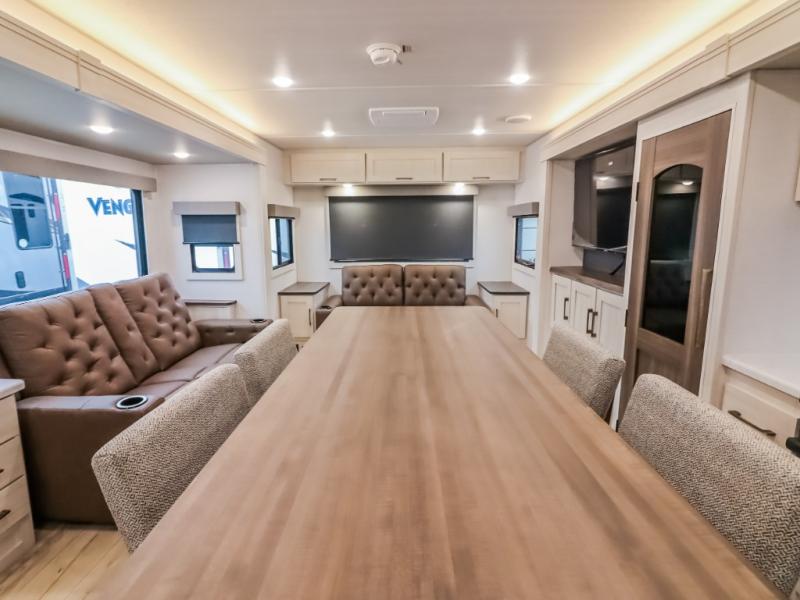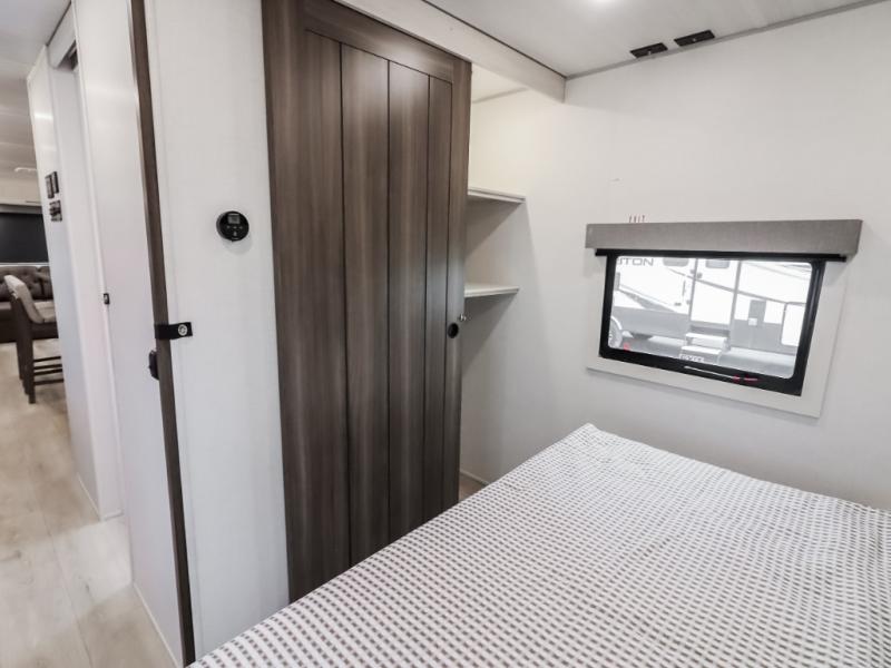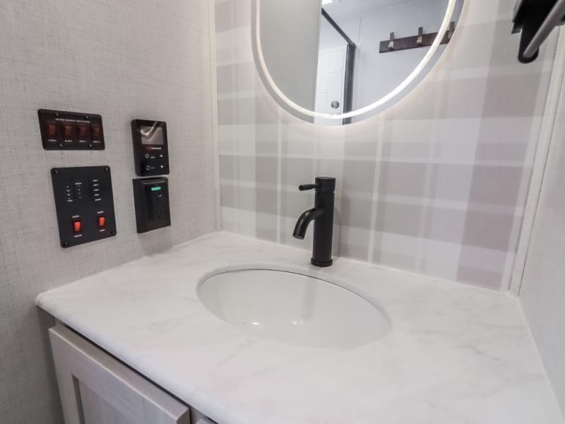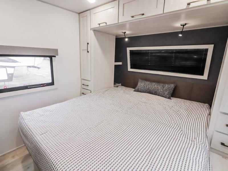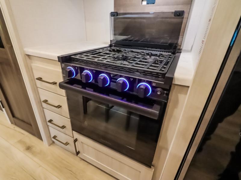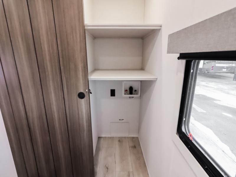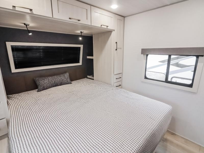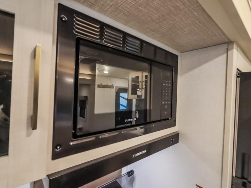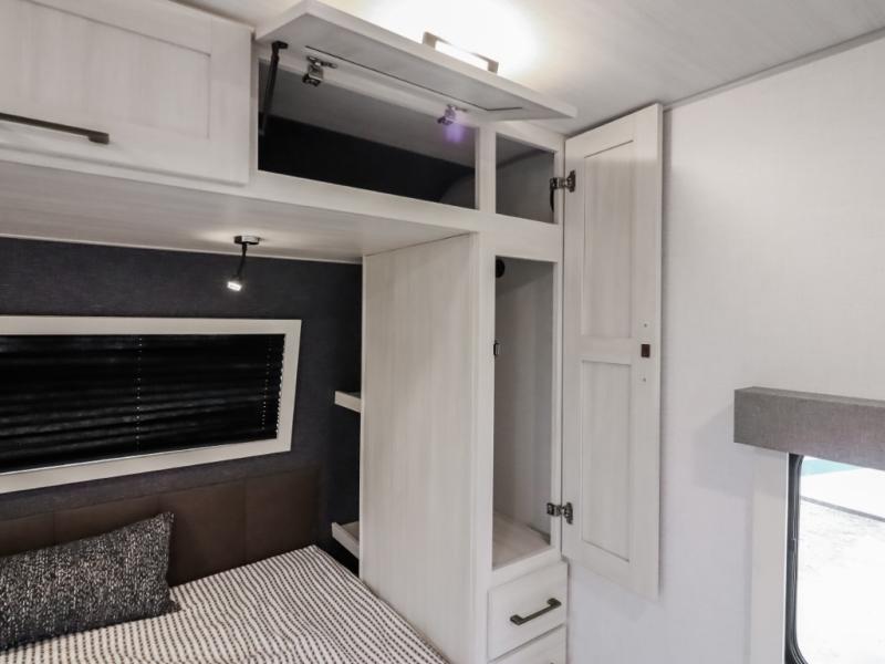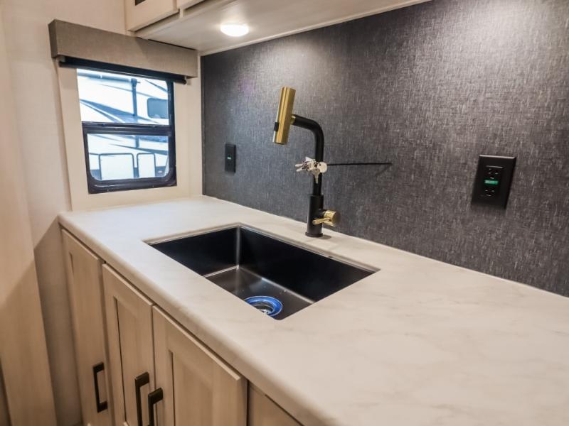 If comfort is what you're looking for, you won't have to search far with this travel trailer! There are dual opposing slides in the main living area for maximum space. The kitchen that flows from the living room area features a high-top dinette that gives a more residential feel to this space, plus there is a pantry, overhead storage, a 10 cu. ft. 12V black glass refrigerator, and more kitchen features you are sure to love. The rear living area includes an EZ-out sofa bed to provide sleeping space for two overnight guests, and there is a theater seat across from the fireplace and HD TV. You'll also enjoy a refreshing drink at the bar top that can also function as a desk! When it's time to call it a night, you can clean up in the spacious full bath, then head to the front bedroom. There is a custom king bed here along with two wardrobes and overhead storage that makes organizing easy!