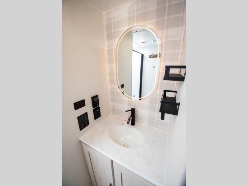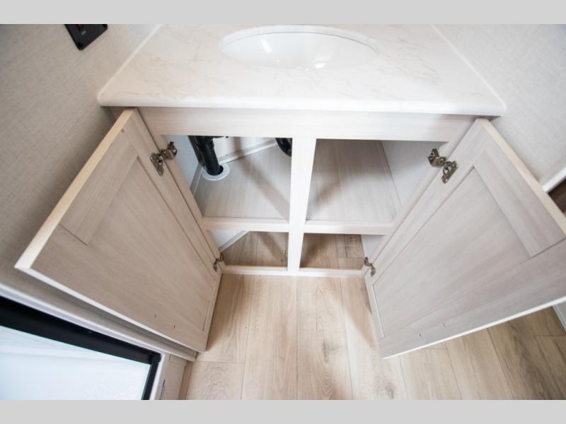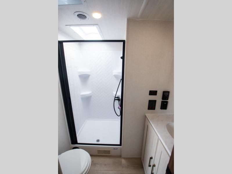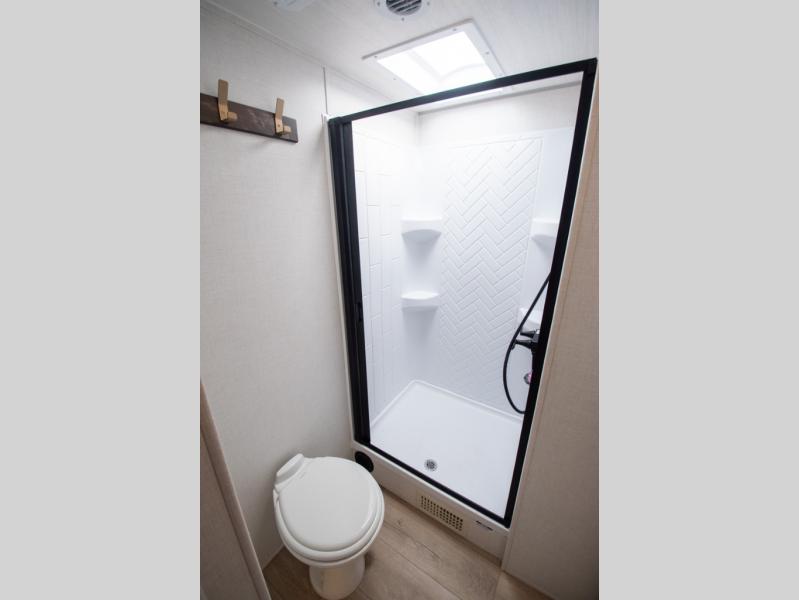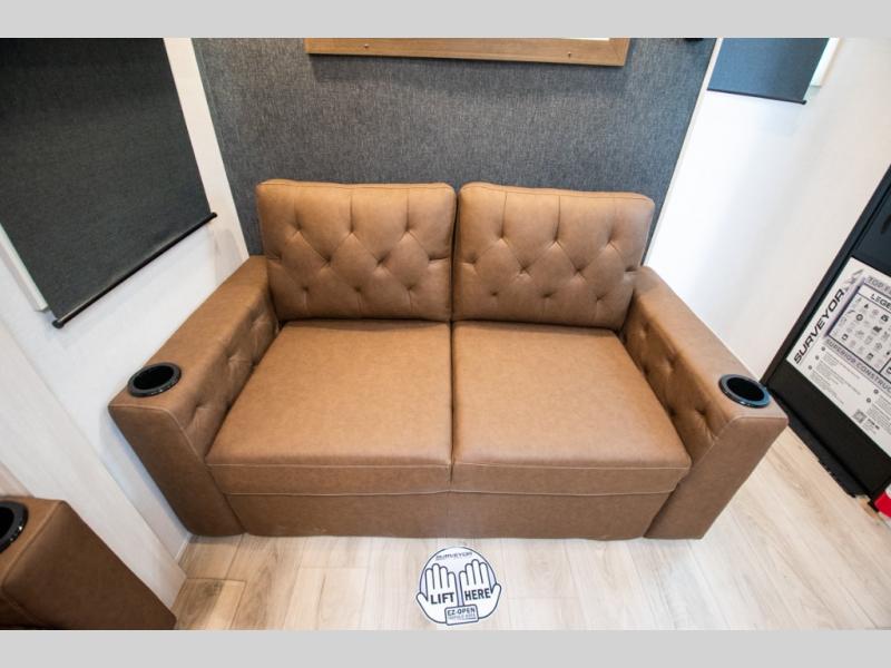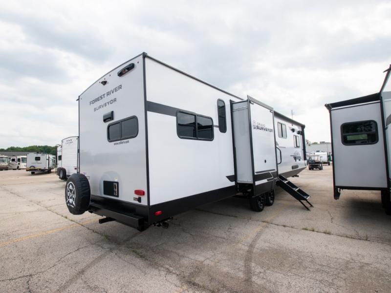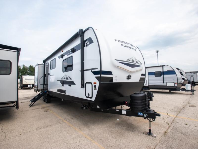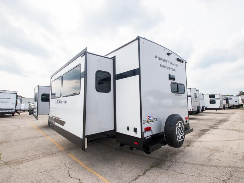 With any Grand Surveyor travel trailer by Forest River you will enjoy turn-key ready-to-go features and quality construction! Each model includes Azdel composite walls and a gel coated fiberglass front cap with an automotive style tinted windshield for a sleek look. There are friction hinge black glass entry door(s), an adjustable platform step with a night light, plus Goodyear tires and a power tongue jack for easy towing. The interior will have you feeling right at home with roller shades, residential faucets, sinks, and bathroom vanity, plus Surf(x) seamless countertops throughout. You can also plan for adventure with a 2" rear accessory and exterior spray port, and there are slam latch exterior baggage doors throughout to keep all your gear secure. Other stand-out features include a central vacuum system, a 200 watt solar panel with a 30 amp controller, a tankless water heater, carpet-free interiors, and the list goes on!