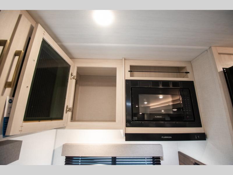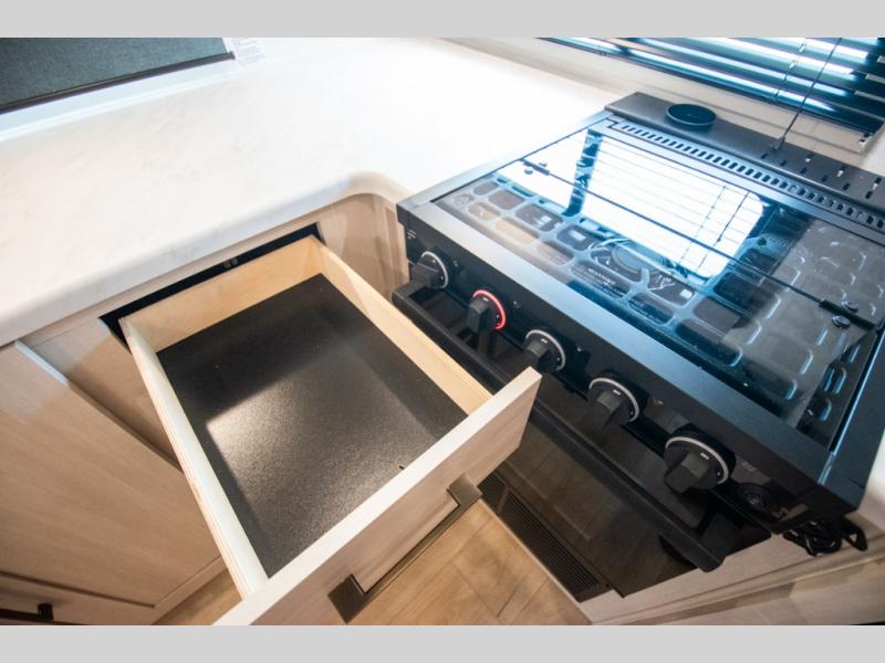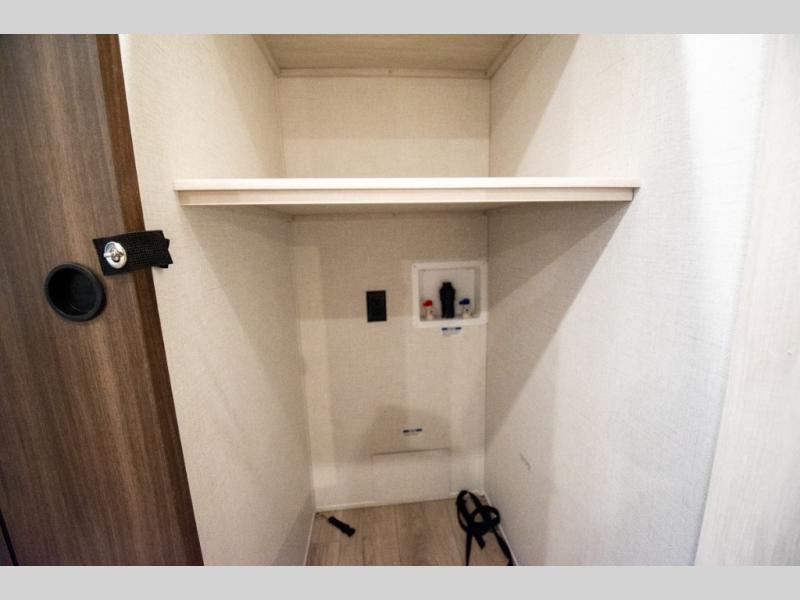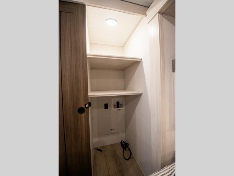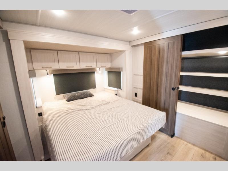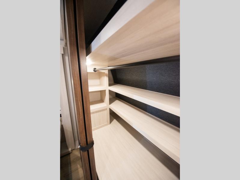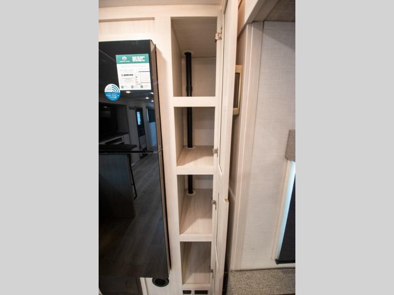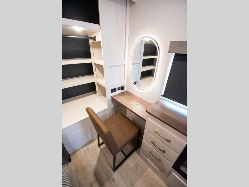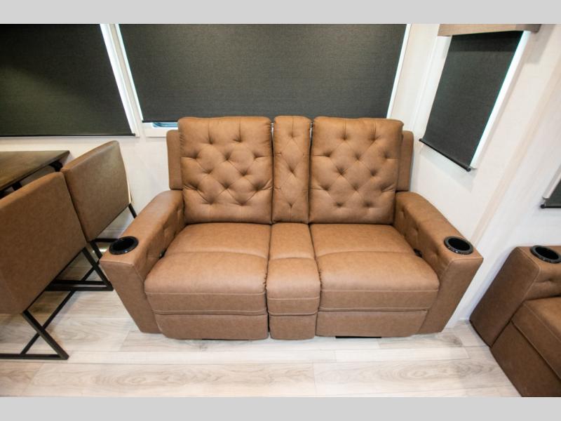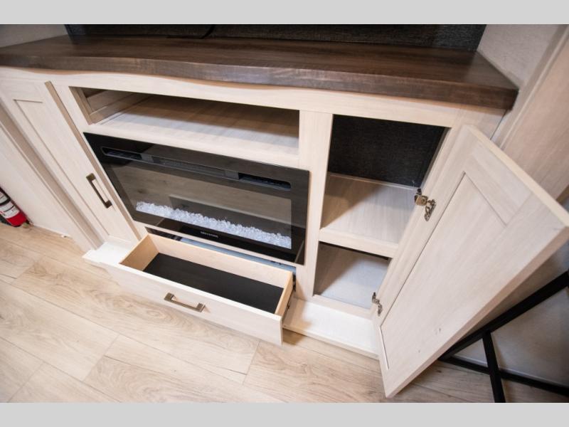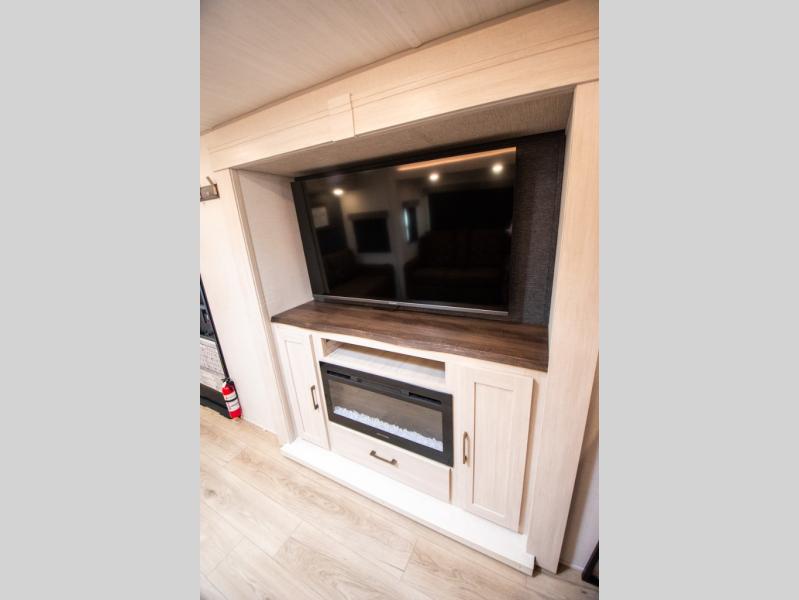 You will love this rear kitchen layout featuring lots of storage and a breakfast bar area with two chairs creating a u-shape. There is plenty of overhead storage, plus a pantry for your dry goods and snacks. A large slide along the roadside houses your dinette and theater seat. Here you will also enjoy great views through two large panoramic windows. There is also more seating along the interior wall of this space where you have a tri-fold sofa that can double as sleeping space for overnight guests, or you can add a second theater seat instead. All can easily view the slide out entertainment center along the curbside wall including a fireplace as well. Central vac will allow you to clean up easily throughout the unit. You also can choose to cook inside or out thanks to the outside kitchen featured under the 19' awning. When it's time to call it a night, you can clean up in the spacious full bath, then head to the front master bedroom to retire. There is a custom king bed slide out here, along with a full-wall wardrobe in front, a dresser and desk, a closet with washer and dryer prep, plus a second fireplace!