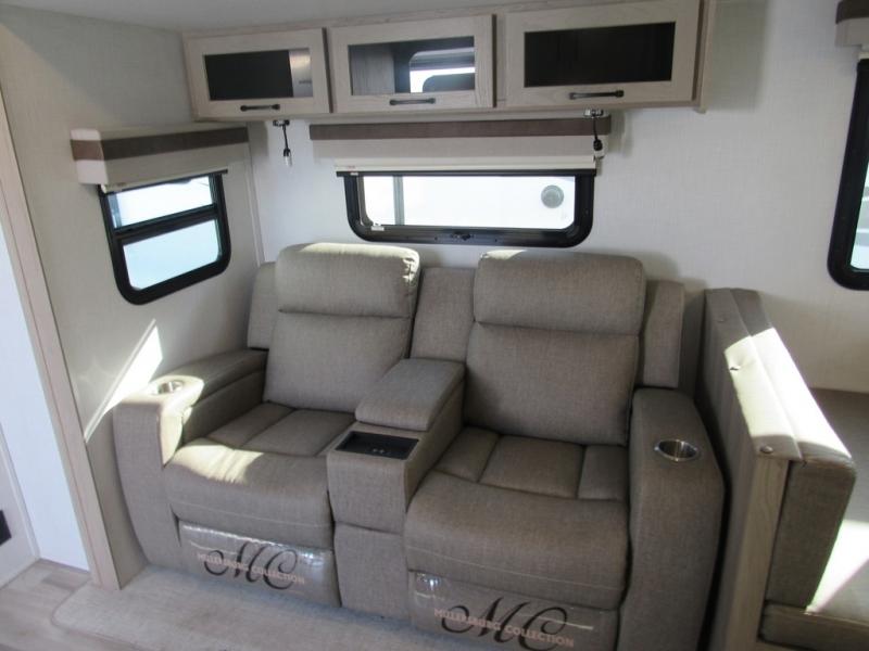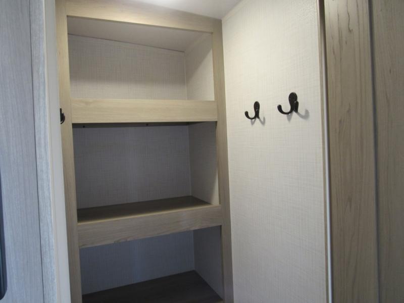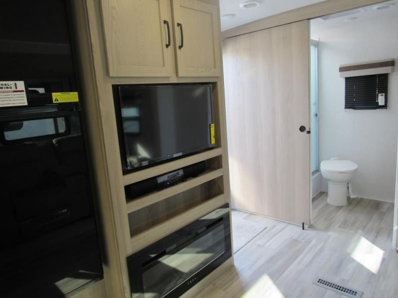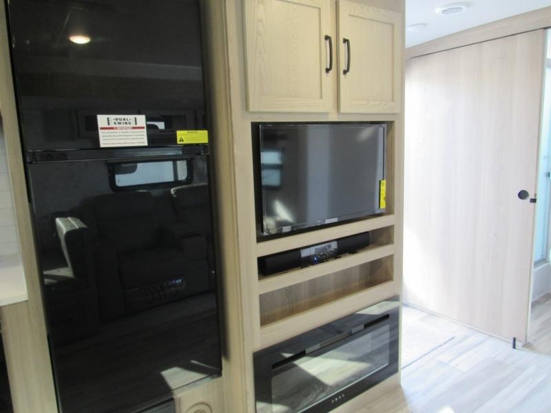 You will love this rear kitchen layout featuring lots of storage and a breakfast bar area with two chairs creating a u-shape. There is plenty of overhead storage, plus a pantry for your dry goods and snacks. A large slide along the roadside houses your dinette and theater seat. There is also more seating along the interior wall of this space where you have a tri-fold sofa that can double as sleeping space for overnight guests, or you can add a second theater seat instead. All can easily view the slide out entertainment center along the curbside wall including a fireplace as well. Central vac will allow you to clean up easily throughout the unit. You also can choose to cook inside or out thanks to the outside kitchen featured under the 19' awning. When it's time to call it a night, you can clean up in the spacious full bath, then head to the front master bedroom to retire. There is a custom king bed slide out here, along with a full-wall wardrobe in front, a dresser and desk, a closet with washer and dryer prep, plus a second fireplace!