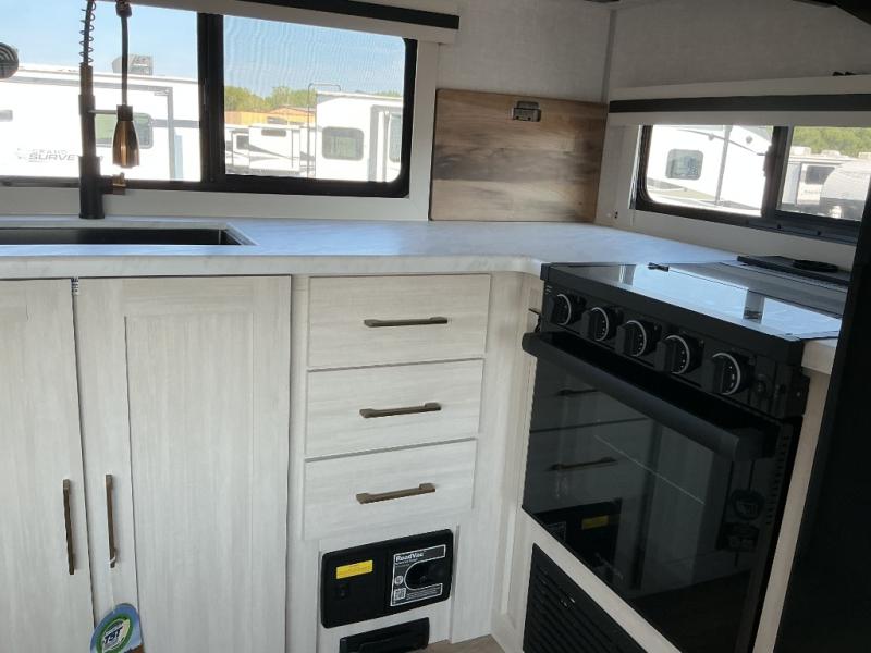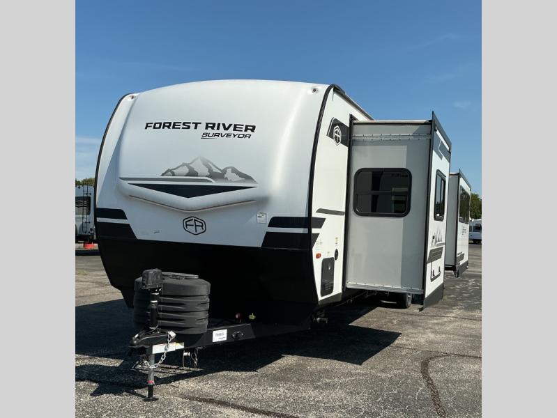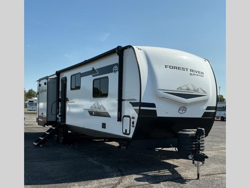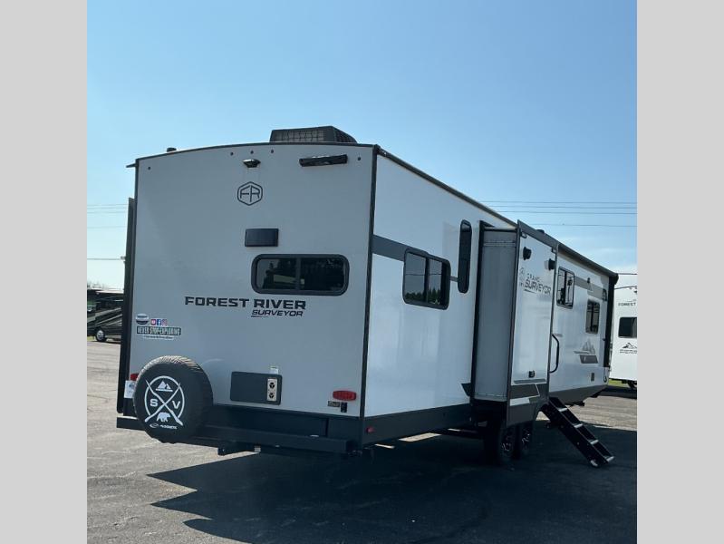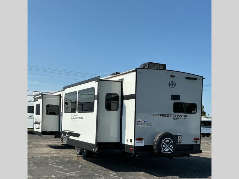 With any Grand Surveyor travel trailer by Forest River you will enjoy turn-key ready-to-go features and quality construction! Each model includes Azdel composite walls and a gel coated fiberglass front cap with an automotive style tinted windshield for a sleek look. There are friction hinge black glass entry door(s), an adjustable platform step with a night light, plus Goodyear tires and a power tongue jack for easy towing. The interior will have you feeling right at home with roller shades, residential faucets, sinks, and bathroom vanity, plus Surf(x) seamless countertops throughout. You can also plan for adventure with a 2" rear accessory and exterior spray port, and there are slam latch exterior baggage doors throughout to keep all your gear secure. Other stand-out features include a central vacuum system, a 200 watt solar panel with a 30 amp controller, a tankless water heater, carpet-free interiors, and the list goes on!