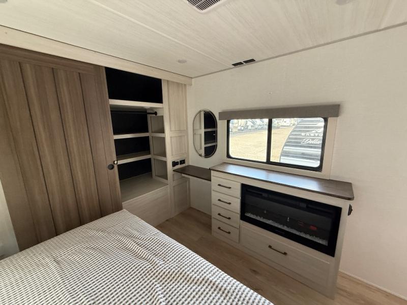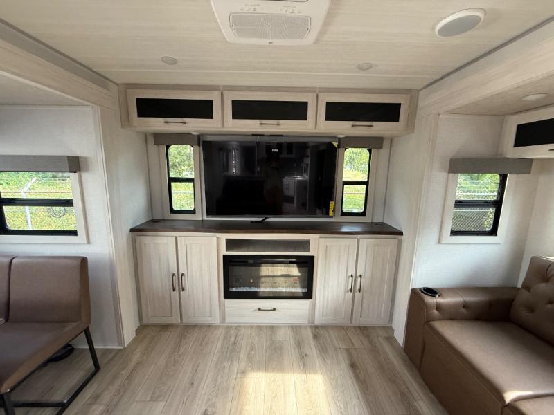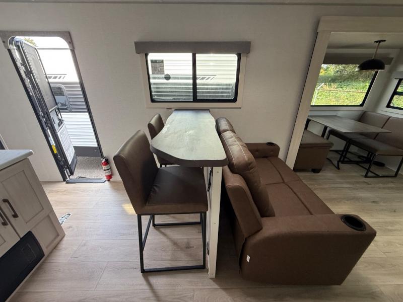 The perfect couples coach that is cozy and also features room for guests! As you enter you will notice the bar top with two chairs facing the rear of the unit where you can easily view the TV and fireplace in the living area while you enjoy your morning coffee. The combined kitchen and living area features two slides with the larger slide along the roadside featuring the kitchen appliances and a tri-fold sofa which would be great for overnight family and friends. There is also a theater seat facing the TV and fireplace, and a slide out free standing table with two chairs on one side and a multi-purpose ottoman than can be used where you need it anytime. Central vac will allow you to clean up easily throughout the unit. You also can choose to cook inside or out thanks to the outside kitchen featured under the 20' awning. When it's time to call it a night, you can clean up in the spacious full bath, then head to the front master bedroom to retire. There is a custom king bed slide out here, along with a full-wall wardrobe in front, a dresser and desk, a closet with washer and dryer prep, plus a second fireplace!