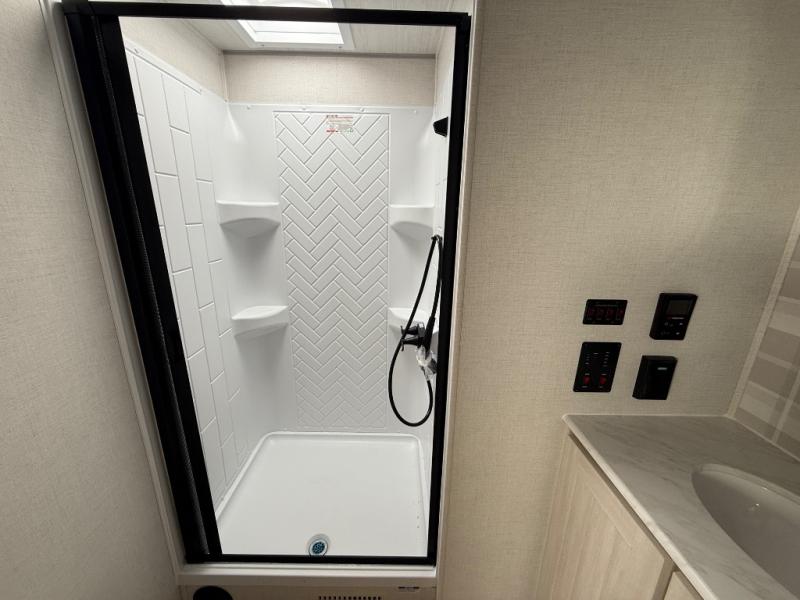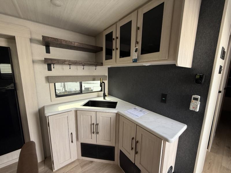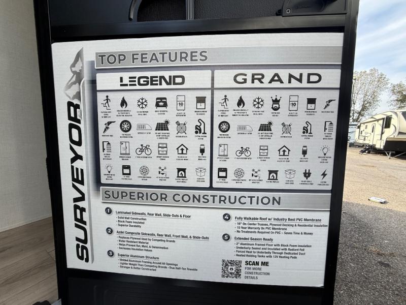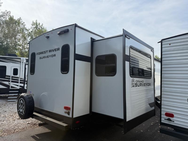 With any Grand Surveyor travel trailer by Forest River you will enjoy turn-key ready-to-go features and quality construction! Each model includes Azdel composite walls and a gel coated fiberglass front cap with an automotive style tinted windshield for a sleek look. There are friction hinge black glass entry door(s), an adjustable platform step with a night light, plus Goodyear tires and a power tongue jack for easy towing. The interior will have you feeling right at home with roller shades, residential faucets, sinks, and bathroom vanity, plus Surf(x) seamless countertops throughout. You can also plan for adventure with a 2" rear accessory and exterior spray port, and there are slam latch exterior baggage doors throughout to keep all your gear secure. Other stand-out features include a central vacuum system, a 200 watt solar panel with a 30 amp controller, a tankless water heater, carpet-free interiors, and the list goes on!
