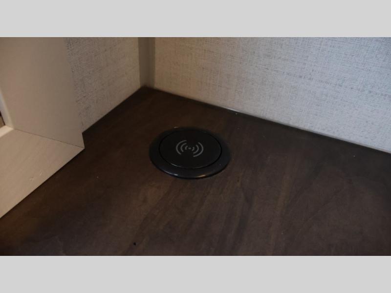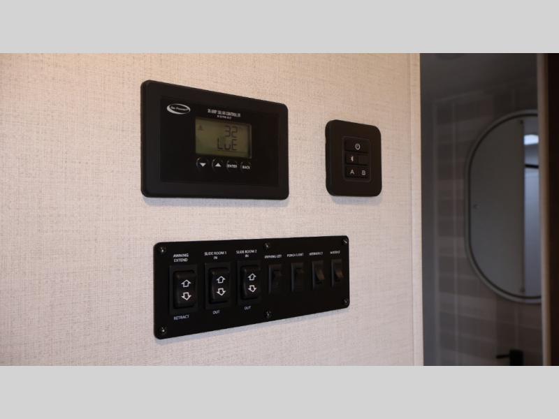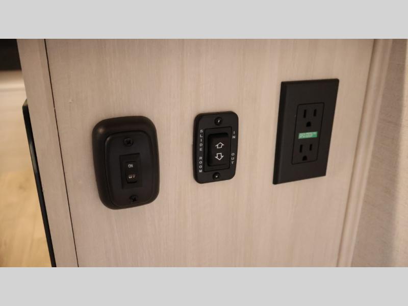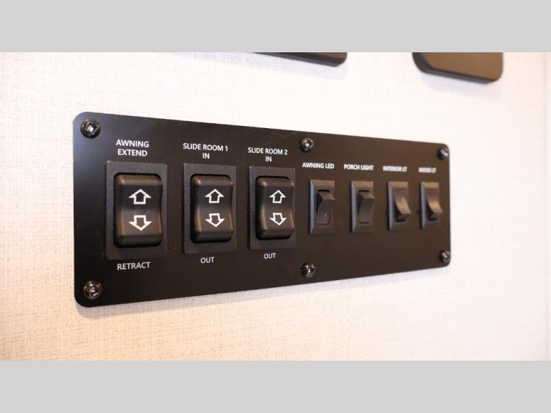 The perfect couples coach that is cozy and also features room for guests! As you enter you will notice the bar top with two chairs facing the rear of the unit where you can easily view the TV and fireplace in the living area while you enjoy your morning coffee. The combined kitchen and living area features two slides with the larger slide along the roadside featuring the kitchen appliances and an E-Z out sofa bed which would be great for overnight family and friends. There is also a theater seat facing the TV and fireplace, and a slide out free standing table with two chairs on one side and a multi-purpose ottoman than can be used where you need it anytime. Central vac will allow you to clean up easily throughout the unit. You also can choose to cook inside or out thanks to the outside kitchen featured under the 20' awning. When it's time to call it a night, you can clean up in the spacious full bath, then head to the front master bedroom to retire. There is a custom king bed slide out here, along with a full-wall wardrobe in front, a dresser and desk, a closet with washer and dryer prep, plus a second fireplace!
