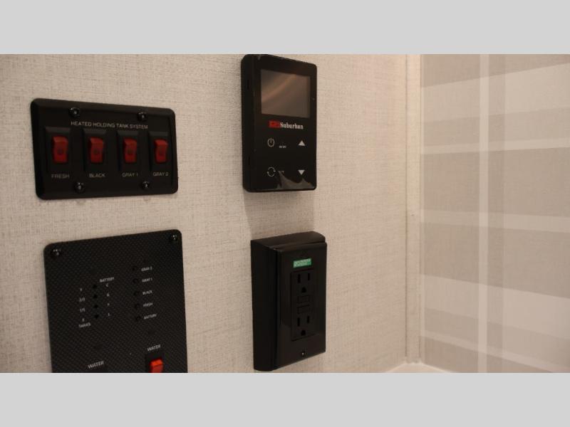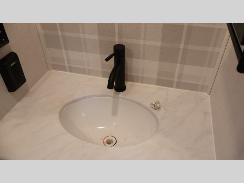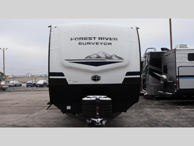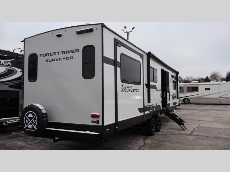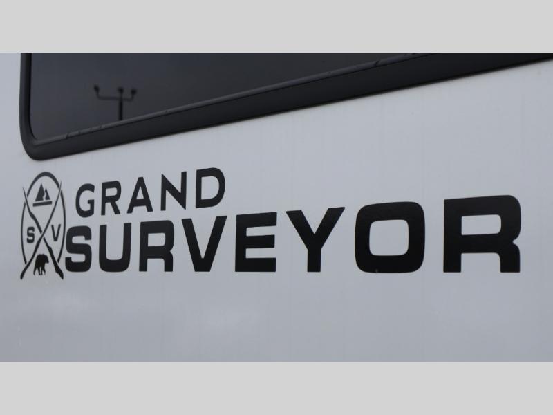 With any Grand Surveyor travel trailer by Forest River you will enjoy turn-key ready-to-go features and quality construction! Each model includes Azdel composite walls and a gel coated fiberglass front cap with an automotive style tinted windshield for a sleek look. There are friction hinge black glass entry door(s), an adjustable platform step with a night light, plus Goodyear tires and a power tongue jack for easy towing. The interior will have you feeling right at home with roller shades, residential faucets, sinks, and bathroom vanity, plus Surf(x) seamless countertops throughout. You can also plan for adventure with a 2" rear accessory and exterior spray port, and there are slam latch exterior baggage doors throughout to keep all your gear secure. Other stand-out features include a central vacuum system, a 200 watt solar panel with a 30 amp controller, a tankless water heater, carpet-free interiors, and the list goes on!