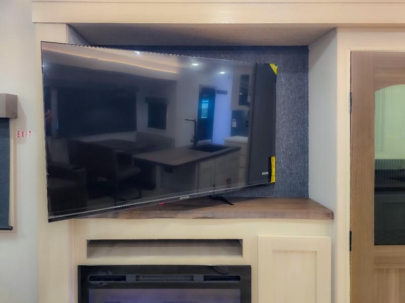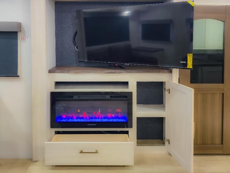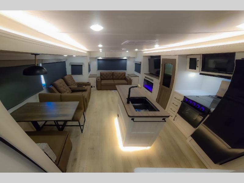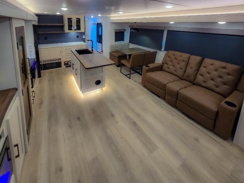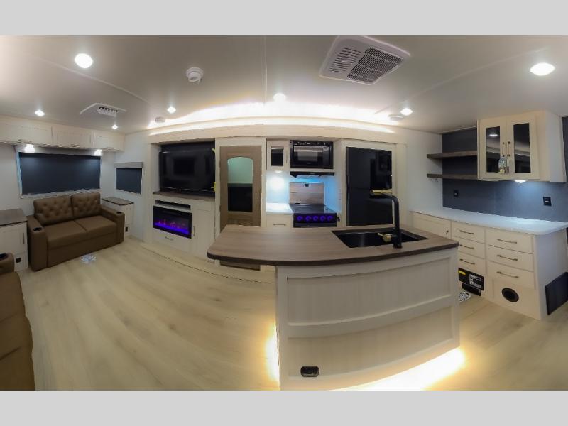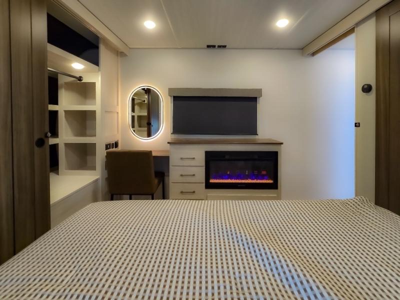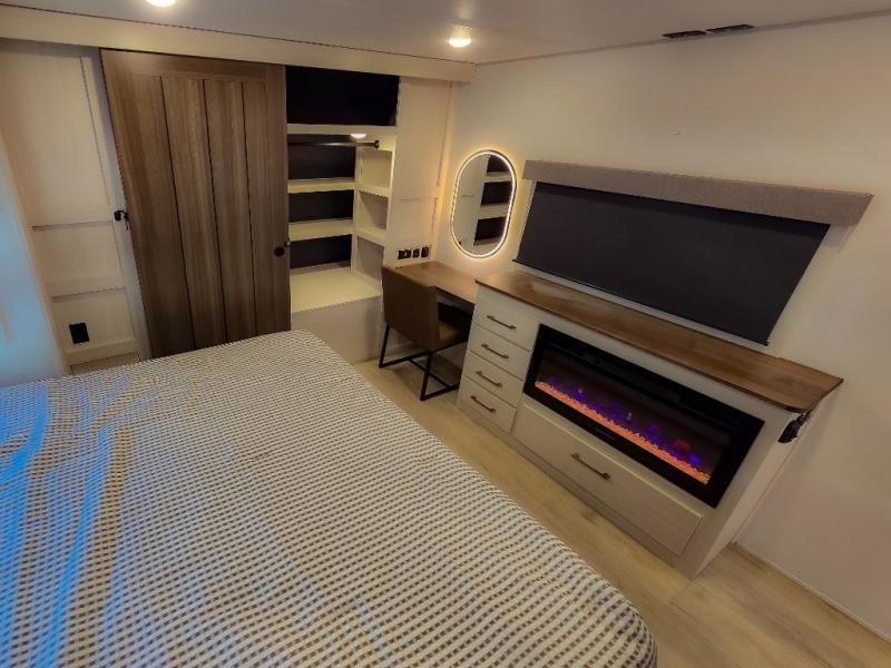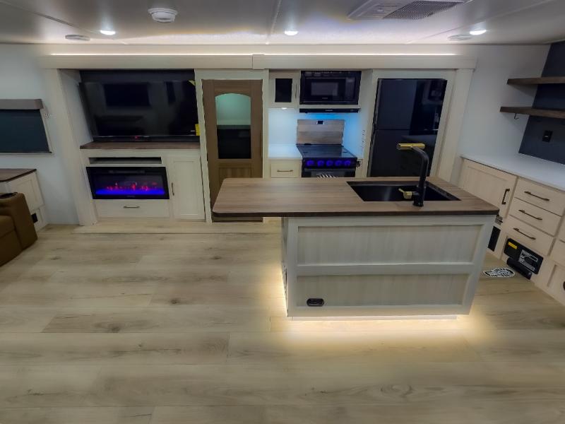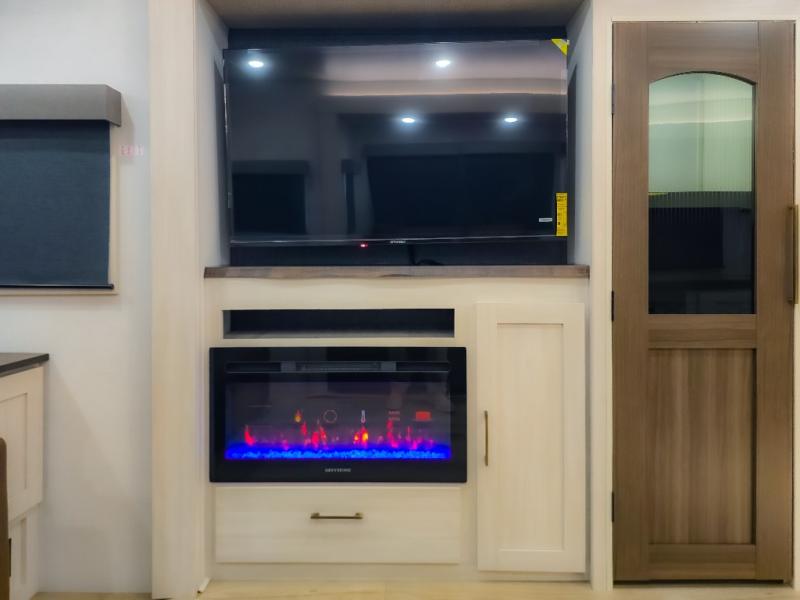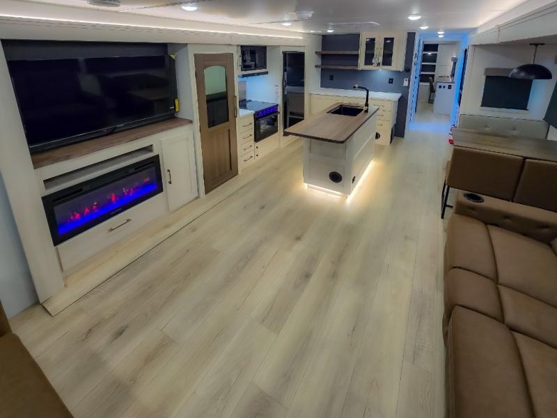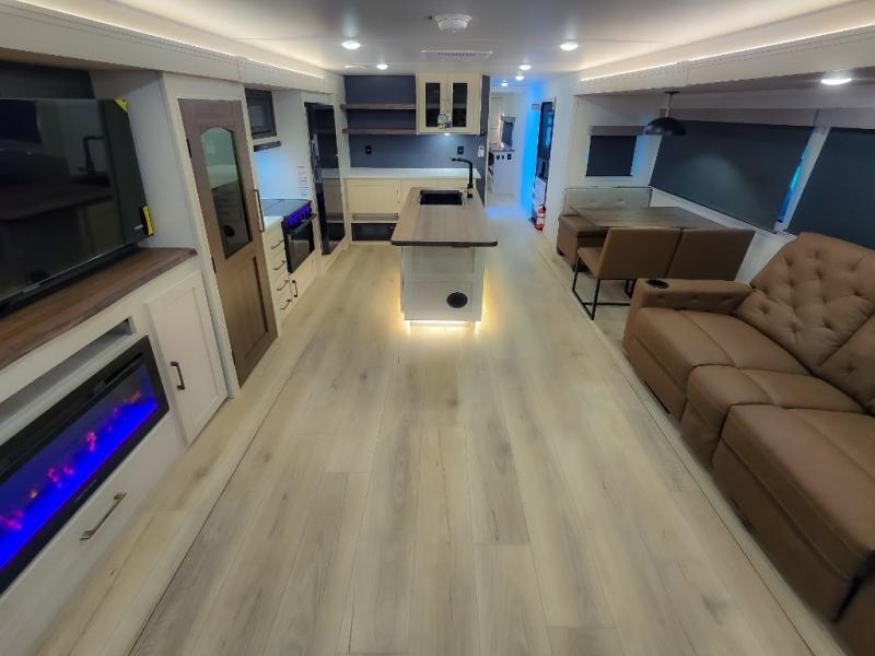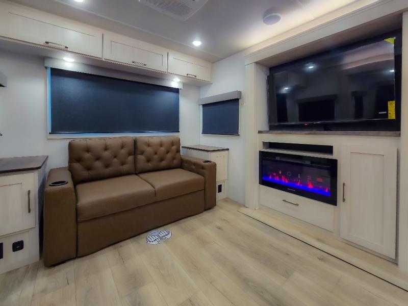 If luxury is what you're looking for, you won't have to search far with this travel trailer! There are triple slides, with dual opposing slides in the main living area for maximum space. The kitchen island gives a more residential feel to this space, plus there is a pantry, a hutch with shelves, a 10 cu. ft. 12V black glass refrigerator, and more kitchen features you are sure to love. The rear living area includes a tri-fold sofa to provide sleeping space for two overnight guests, and there is a theater seat across from the fireplace and HD TV. You'll also enjoy dining at the free-standing dinette with a multi-purpose ottoman! When it's time to call it a night, you can clean up in the spacious full bath, then head to the front master bedroom to retire. There is a custom king bed slide out here, along with a full-wall wardrobe in front, a dresser, a closet with washer and dryer prep, plus a bedroom fireplace!