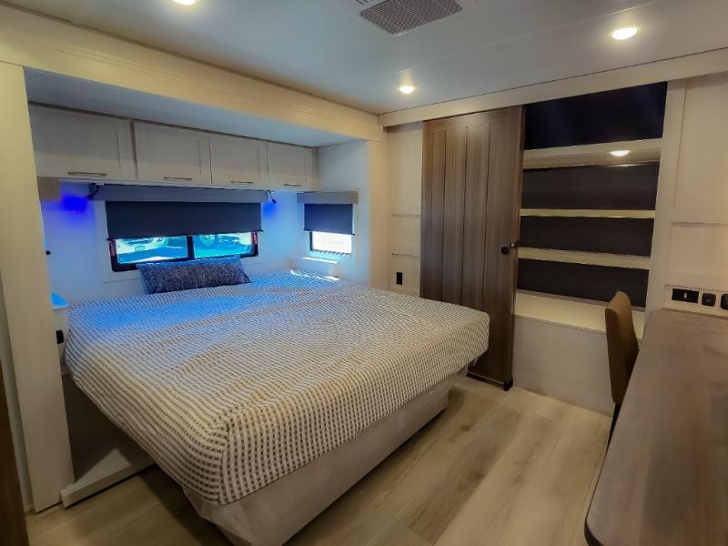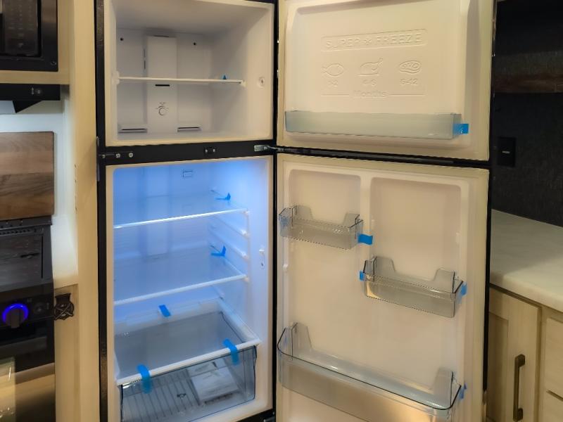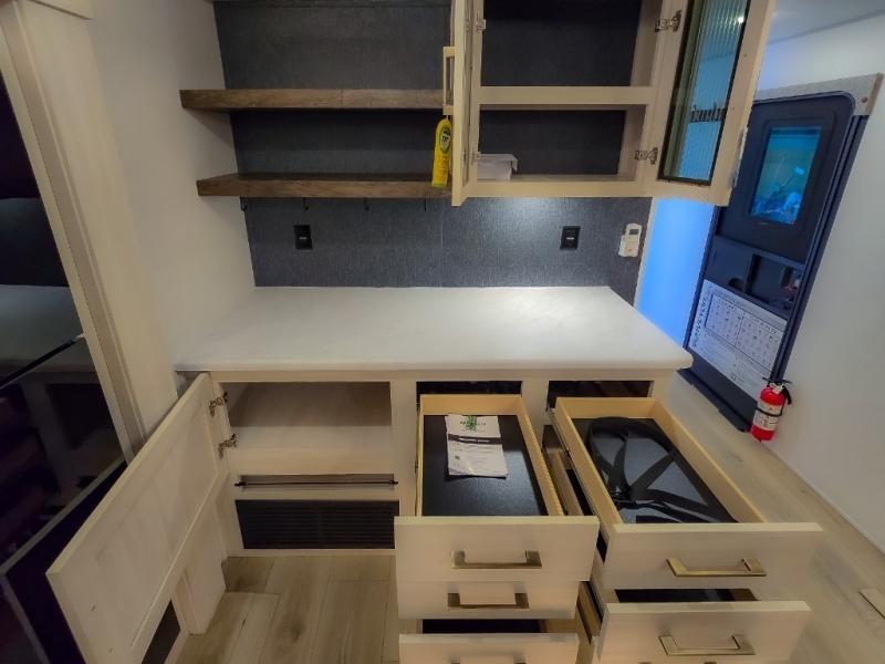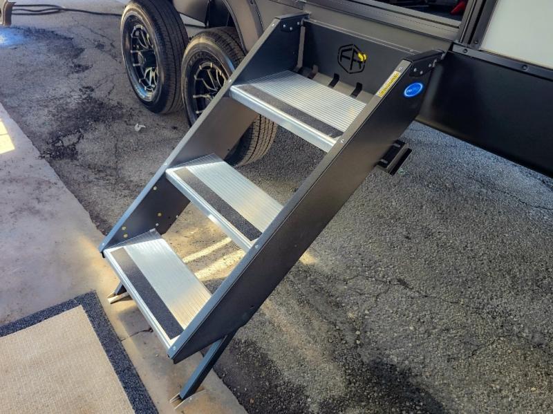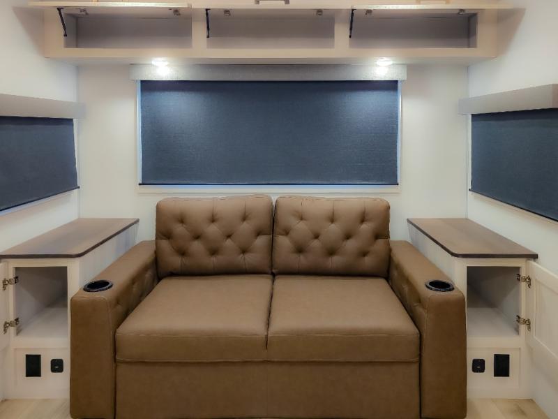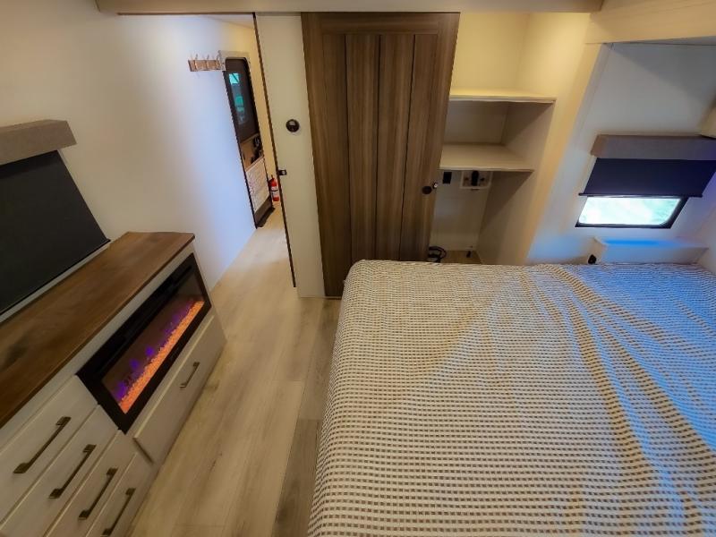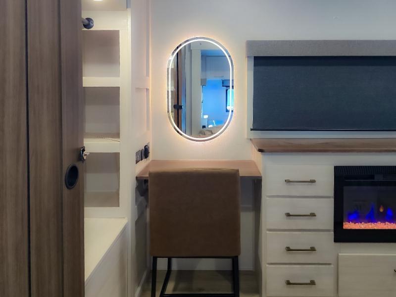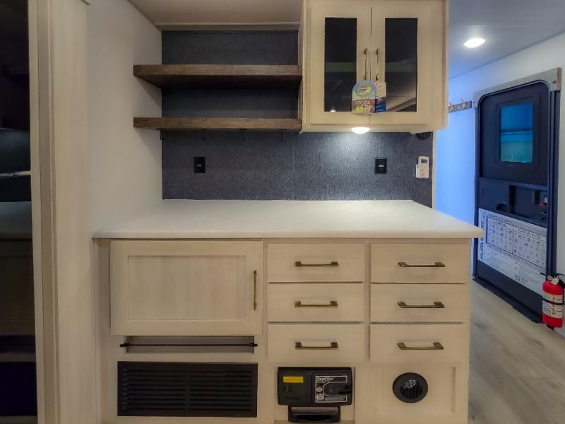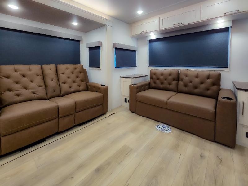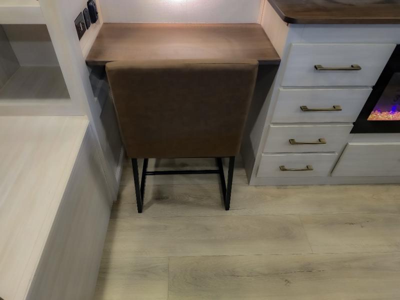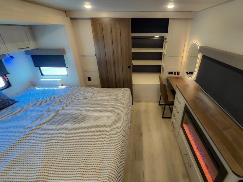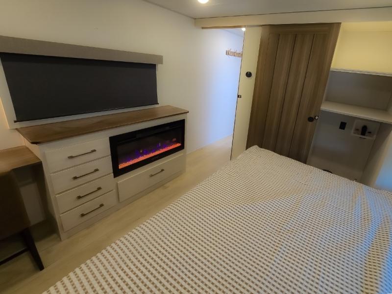 If luxury is what you're looking for, you won't have to search far with this travel trailer! There are triple slides, with dual opposing slides in the main living area for maximum space. The kitchen island gives a more residential feel to this space, plus there is a pantry, a hutch with shelves, a 10 cu. ft. 12V black glass refrigerator, and more kitchen features you are sure to love. The rear living area includes a tri-fold sofa to provide sleeping space for two overnight guests, and there is a theater seat across from the fireplace and HD TV. You'll also enjoy dining at the free-standing dinette with a multi-purpose ottoman! When it's time to call it a night, you can clean up in the spacious full bath, then head to the front master bedroom to retire. There is a custom king bed slide out here, along with a full-wall wardrobe in front, a dresser, a closet with washer and dryer prep, plus a bedroom fireplace!