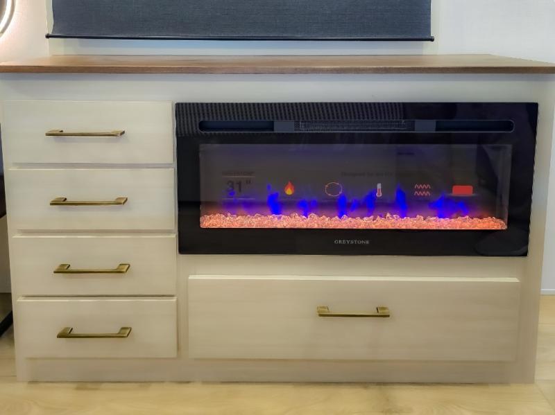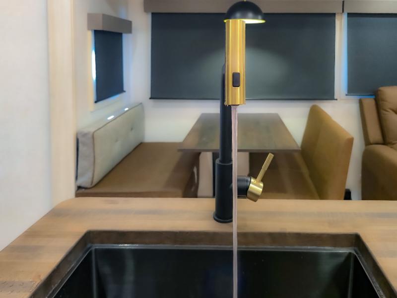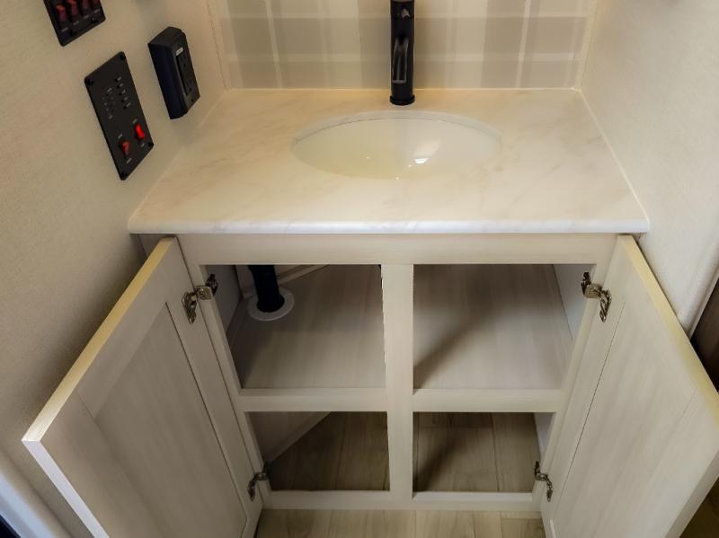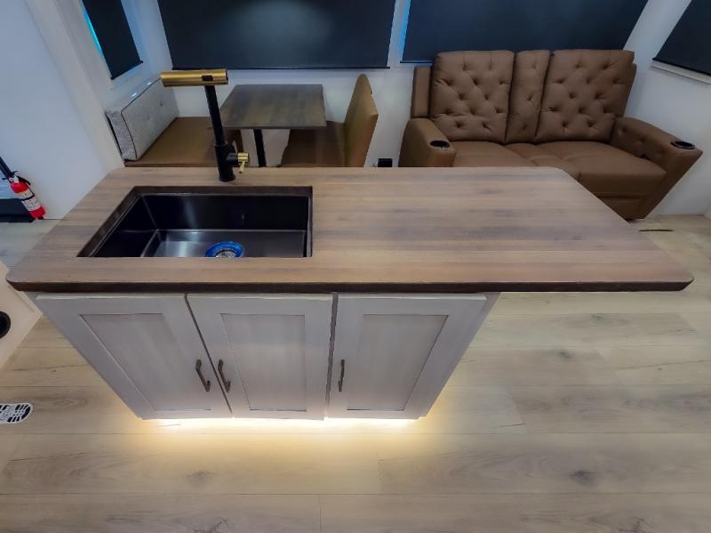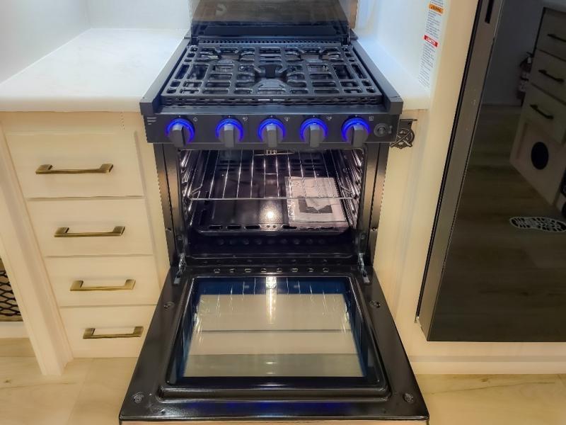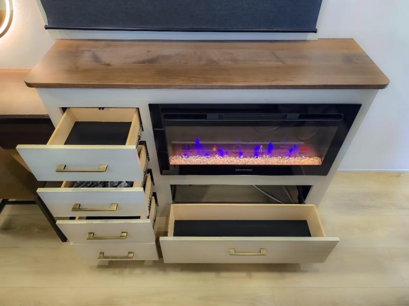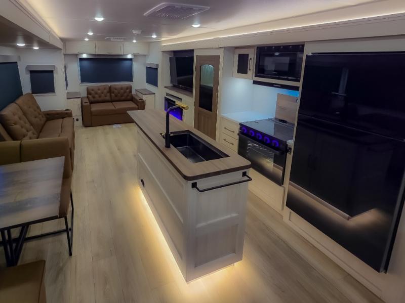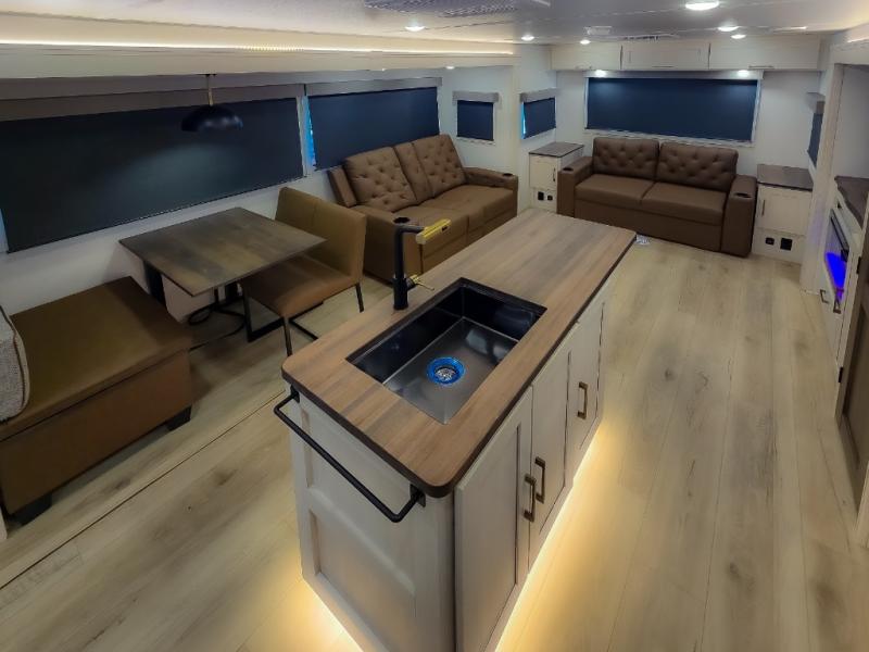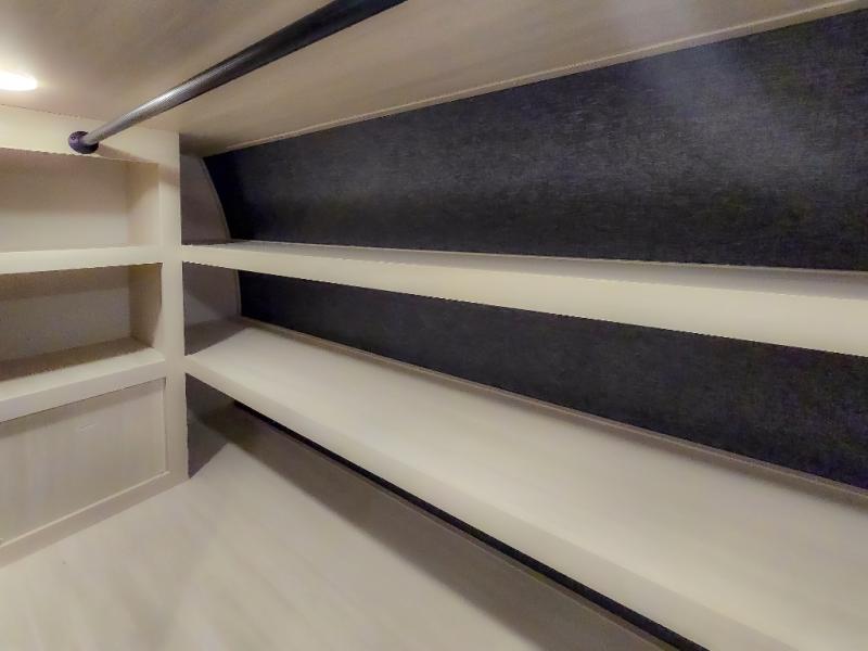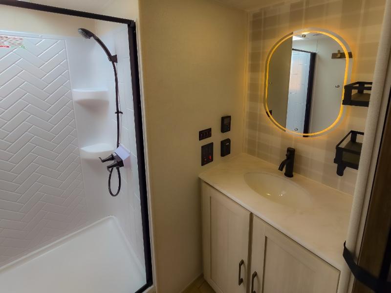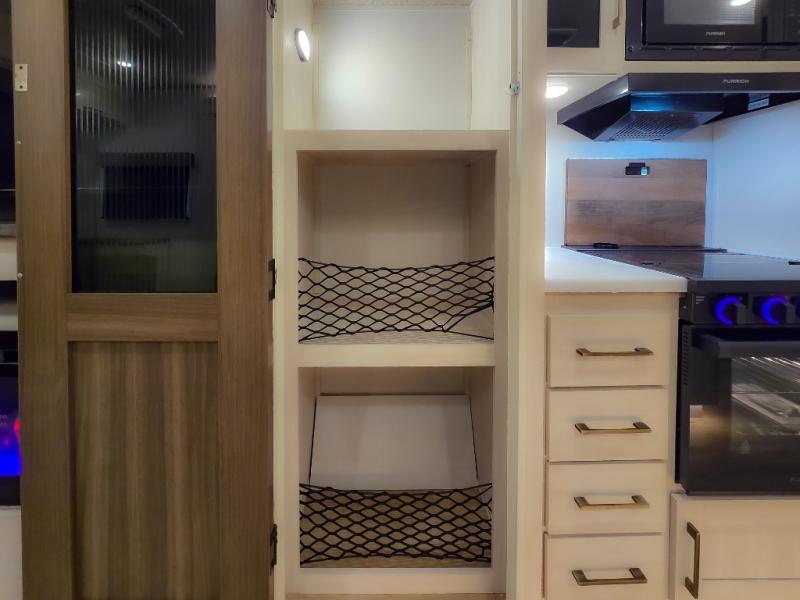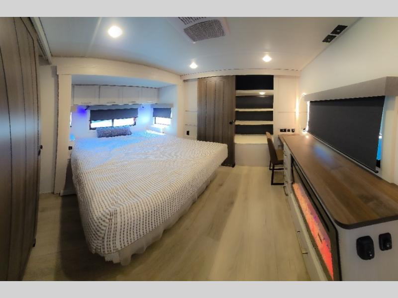 If luxury is what you're looking for, you won't have to search far with this travel trailer! There are triple slides, with dual opposing slides in the main living area for maximum space. The kitchen island gives a more residential feel to this space, plus there is a pantry, a hutch with shelves, a 10 cu. ft. 12V black glass refrigerator, and more kitchen features you are sure to love. The rear living area includes a tri-fold sofa to provide sleeping space for two overnight guests, and there is a theater seat across from the fireplace and HD TV. You'll also enjoy dining at the free-standing dinette with a multi-purpose ottoman! When it's time to call it a night, you can clean up in the spacious full bath, then head to the front master bedroom to retire. There is a custom king bed slide out here, along with a full-wall wardrobe in front, a dresser, a closet with washer and dryer prep, plus a bedroom fireplace!