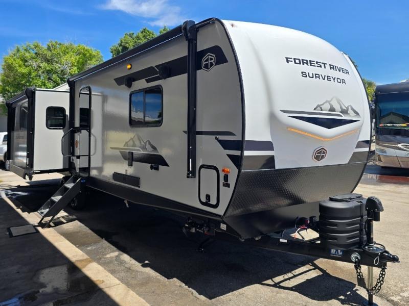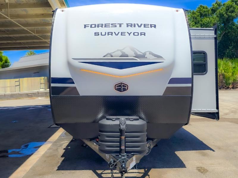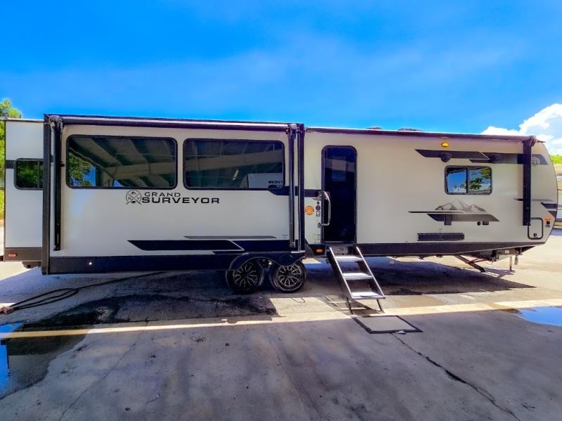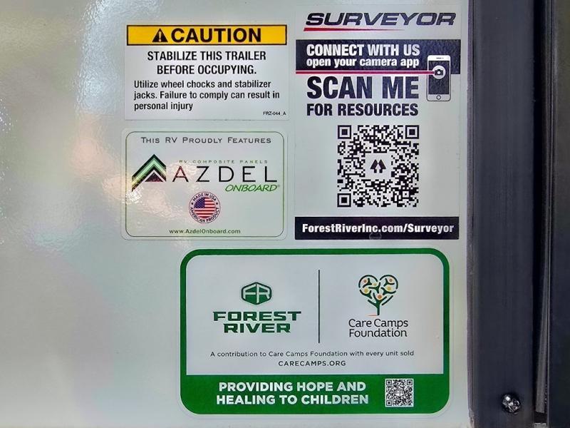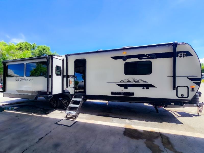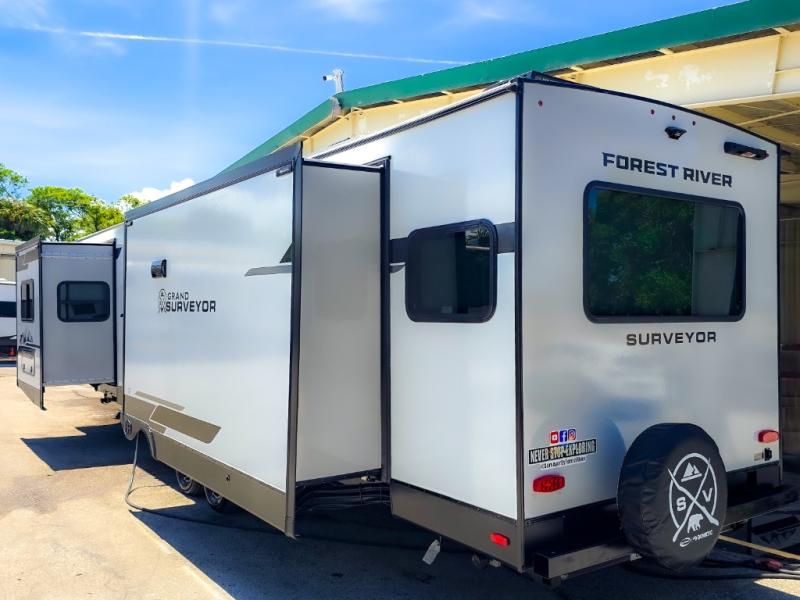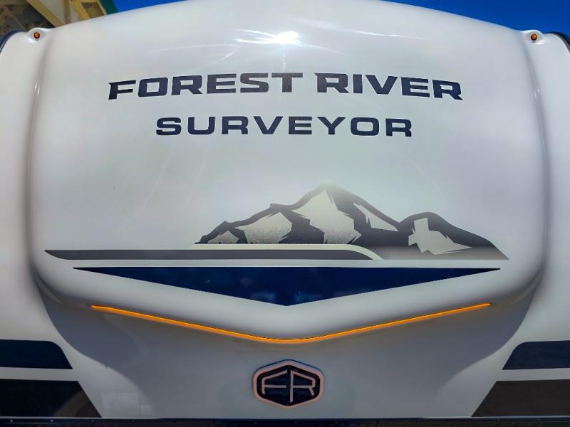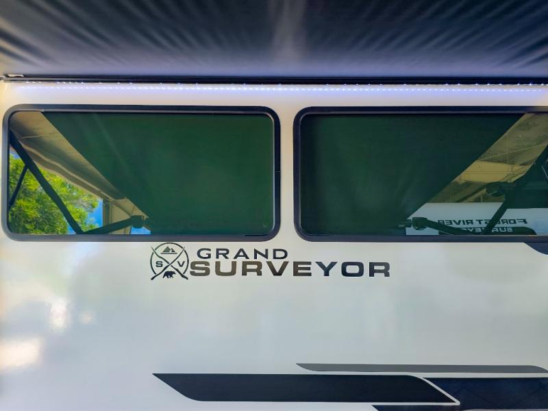 With any Grand Surveyor travel trailer by Forest River you will enjoy turn-key ready-to-go features and quality construction! Each model includes Azdel composite walls and a gel coated fiberglass front cap with an automotive style tinted windshield for a sleek look. There are friction hinge black glass entry door(s), an adjustable platform step with a night light, plus Goodyear tires and a power tongue jack for easy towing. The interior will have you feeling right at home with roller shades, residential faucets, sinks, and bathroom vanity, plus Surf(x) seamless countertops throughout. You can also plan for adventure with a 2" rear accessory and exterior spray port, and there are slam latch exterior baggage doors throughout to keep all your gear secure. Other stand-out features include a central vacuum system, a 200 watt solar panel with a 30 amp controller, a tankless water heater, carpet-free interiors, and the list goes on!