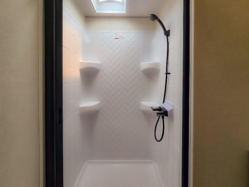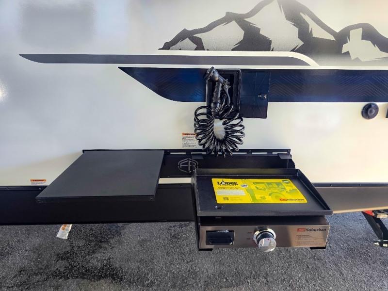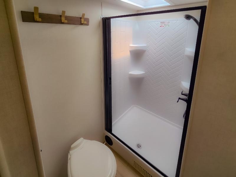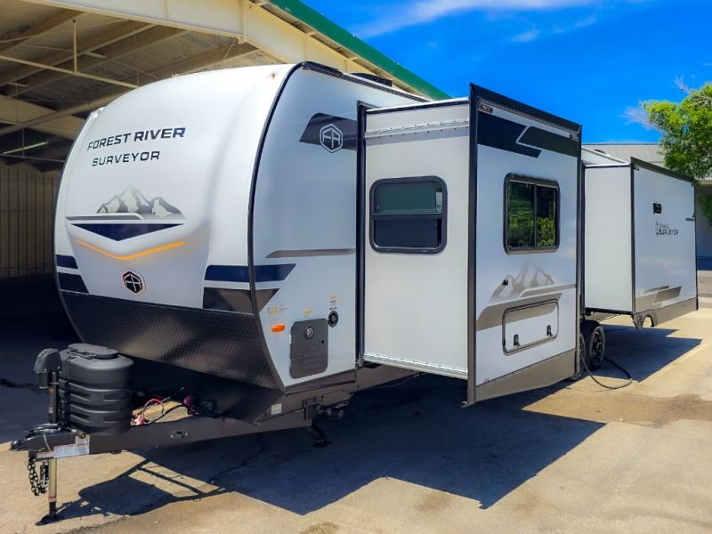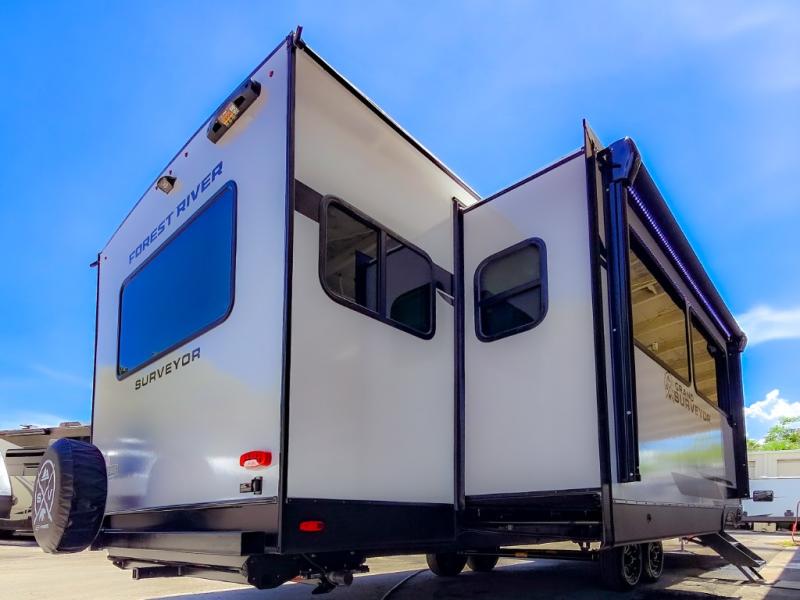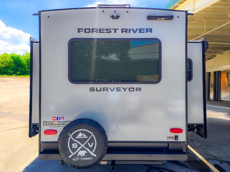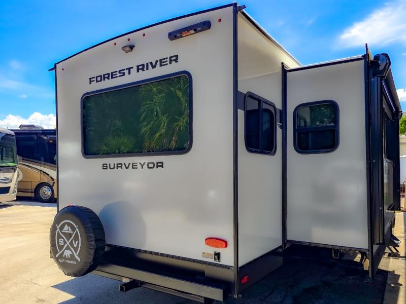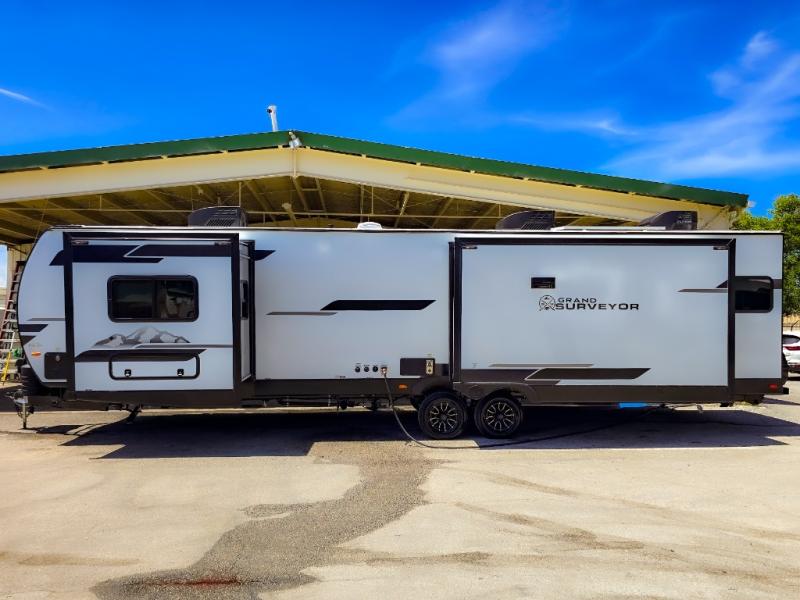 With any Grand Surveyor travel trailer by Forest River you will enjoy turn-key ready-to-go features and quality construction! Each model includes Azdel composite walls and a gel coated fiberglass front cap with an automotive style tinted windshield for a sleek look. There are friction hinge black glass entry door(s), an adjustable platform step with a night light, plus Goodyear tires and a power tongue jack for easy towing. The interior will have you feeling right at home with roller shades, residential faucets, sinks, and bathroom vanity, plus Surf(x) seamless countertops throughout. You can also plan for adventure with a 2" rear accessory and exterior spray port, and there are slam latch exterior baggage doors throughout to keep all your gear secure. Other stand-out features include a central vacuum system, a 200 watt solar panel with a 30 amp controller, a tankless water heater, carpet-free interiors, and the list goes on!