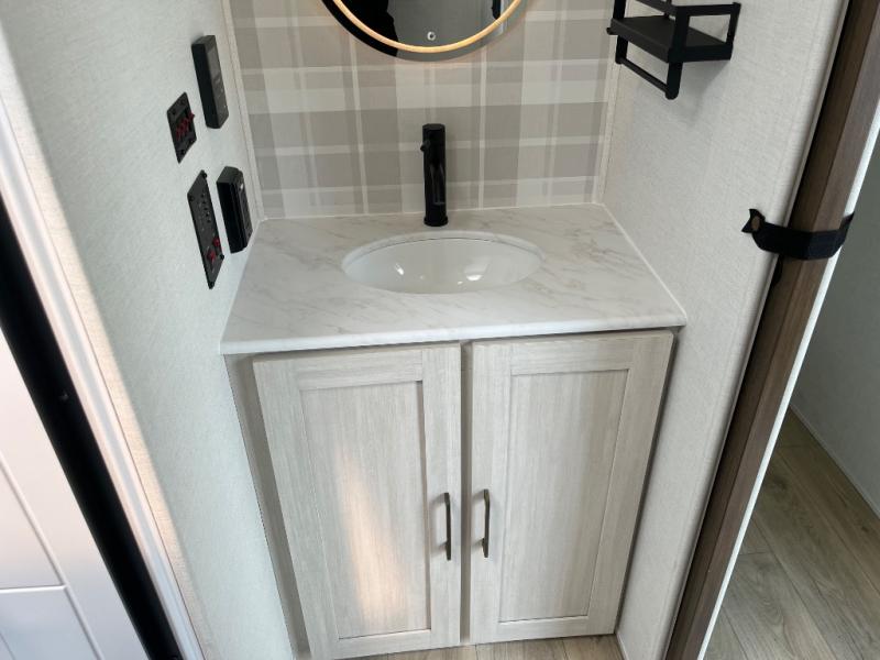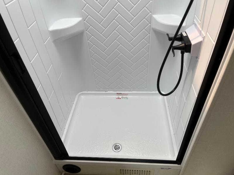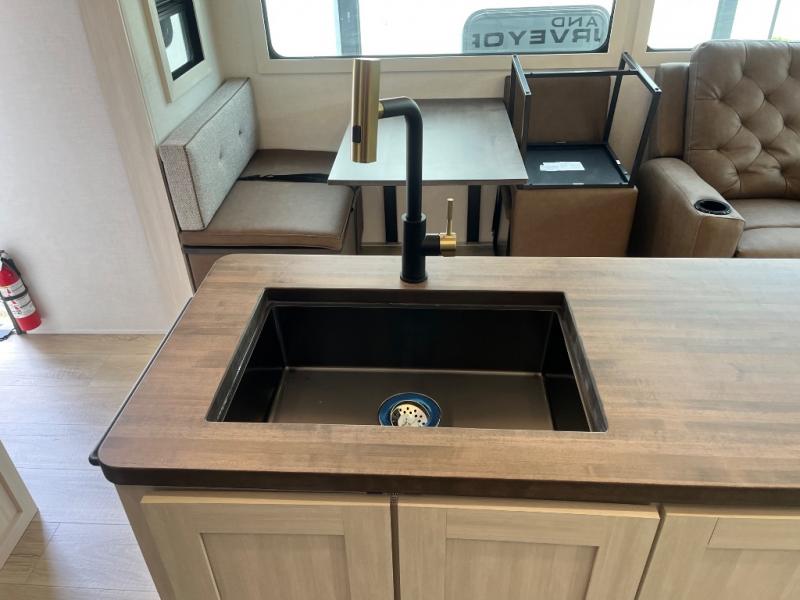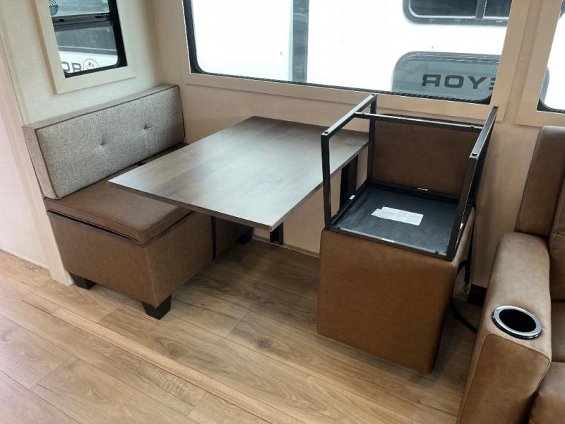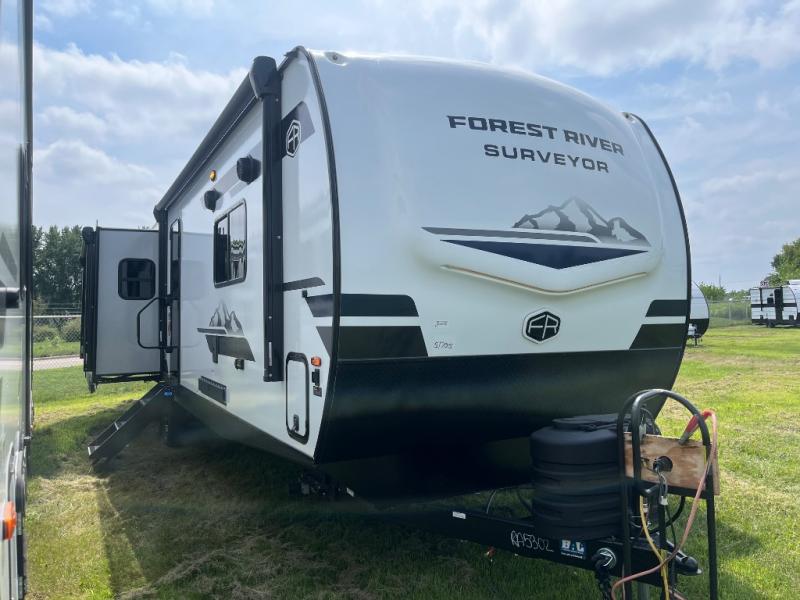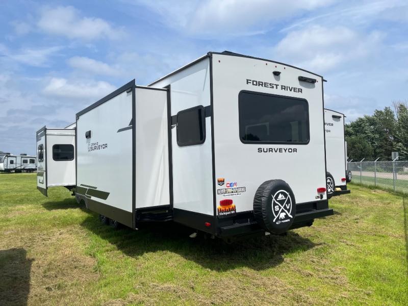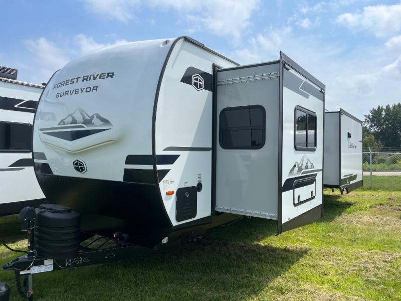 With any Grand Surveyor travel trailer by Forest River you will enjoy turn-key ready-to-go features and quality construction! Each model includes Azdel composite walls and a gel coated fiberglass front cap with an automotive style tinted windshield for a sleek look. There are friction hinge black glass entry door(s), an adjustable platform step with a night light, plus Goodyear tires and a power tongue jack for easy towing. The interior will have you feeling right at home with roller shades, residential faucets, sinks, and bathroom vanity, plus Surf(x) seamless countertops throughout. You can also plan for adventure with a 2" rear accessory and exterior spray port, and there are slam latch exterior baggage doors throughout to keep all your gear secure. Other stand-out features include a central vacuum system, a 200 watt solar panel with a 30 amp controller, a tankless water heater, carpet-free interiors, and the list goes on!