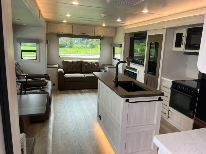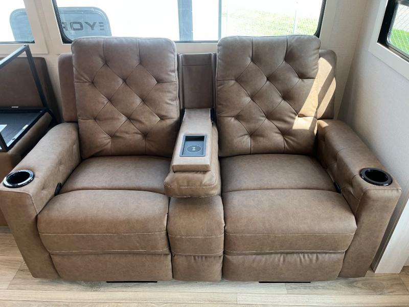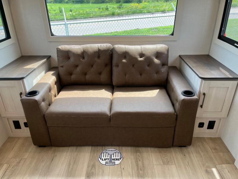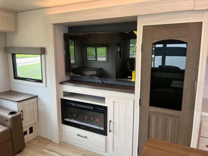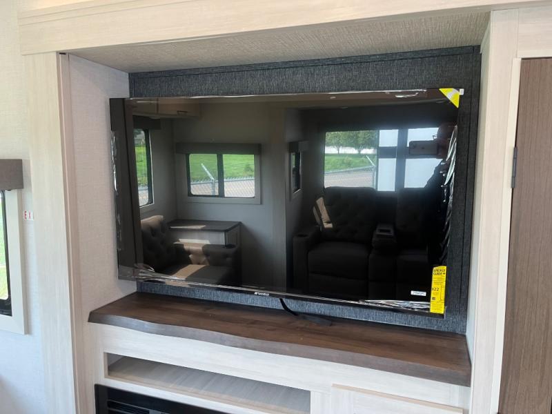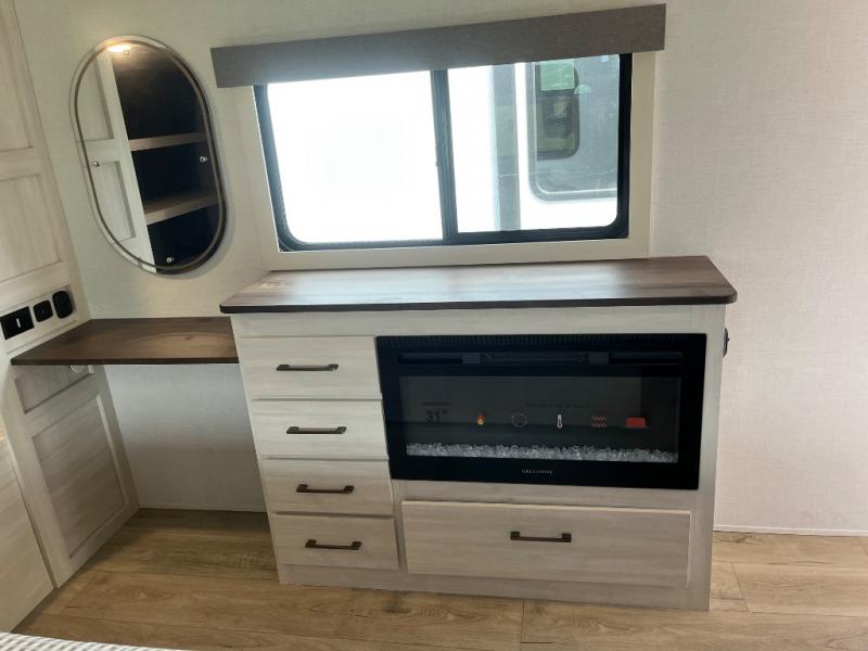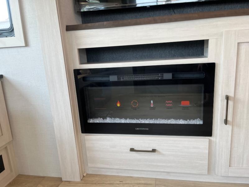 If luxury is what you're looking for, you won't have to search far with this travel trailer! There are triple slides, with dual opposing slides in the main living area for maximum space. The kitchen island gives a more residential feel to this space, plus there is a pantry, a hutch with shelves, a 10 cu. ft. 12V black glass refrigerator, and more kitchen features you are sure to love. The rear living area includes a tri-fold sofa to provide sleeping space for two overnight guests, and there is a theater seat across from the fireplace and HD TV. You'll also enjoy dining at the free-standing dinette with a multi-purpose ottoman! When it's time to call it a night, you can clean up in the spacious full bath, then head to the front master bedroom to retire. There is a custom king bed slide out here, along with a full-wall wardrobe in front, a dresser, a closet with washer and dryer prep, plus a bedroom fireplace!